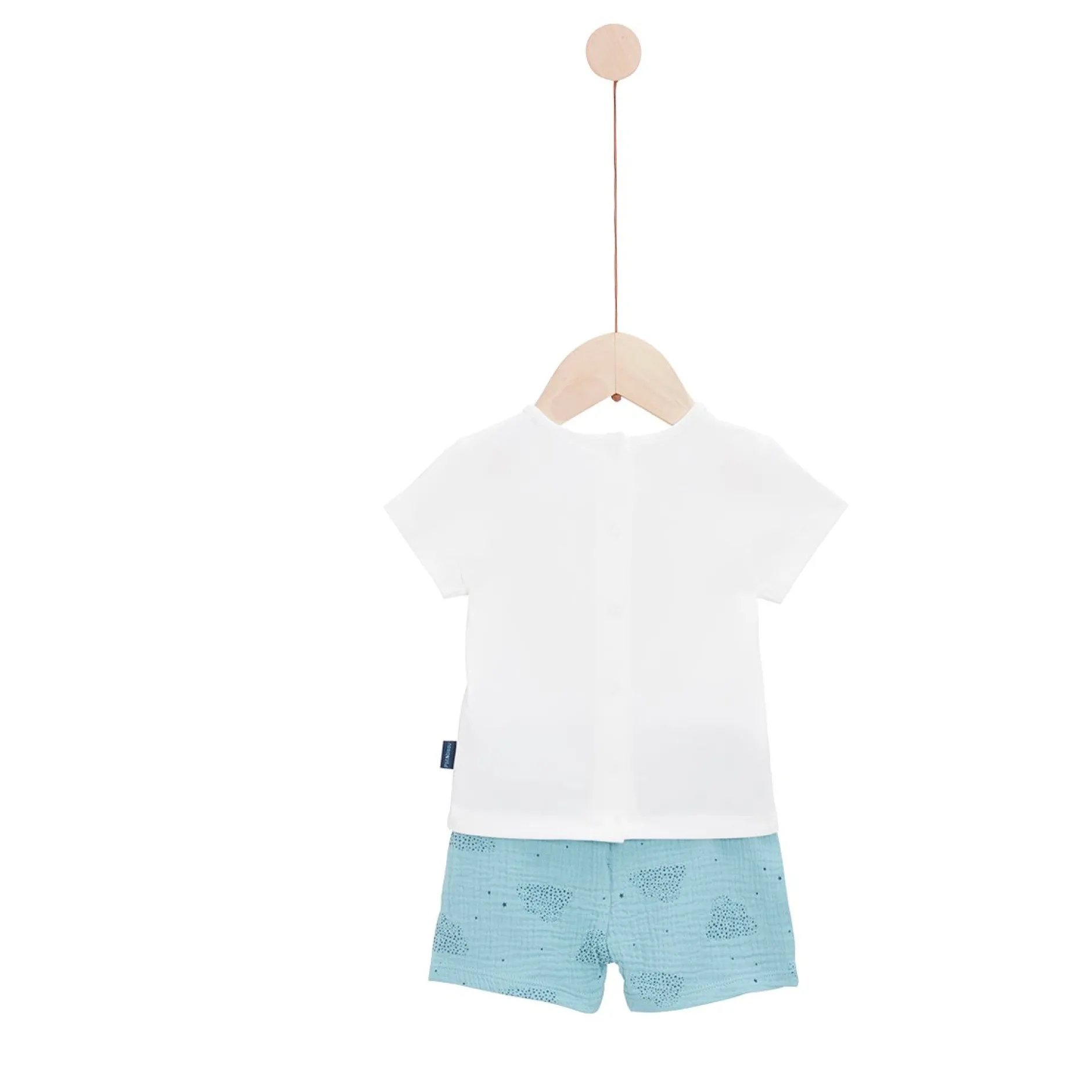 Ensemble 2 pièces P’tit Bisou composé d’un short en mousseline de gaze en vert eucalyptus avec impression de nuages en marine et d’un tee shirt manches courtes en jersey écru.
