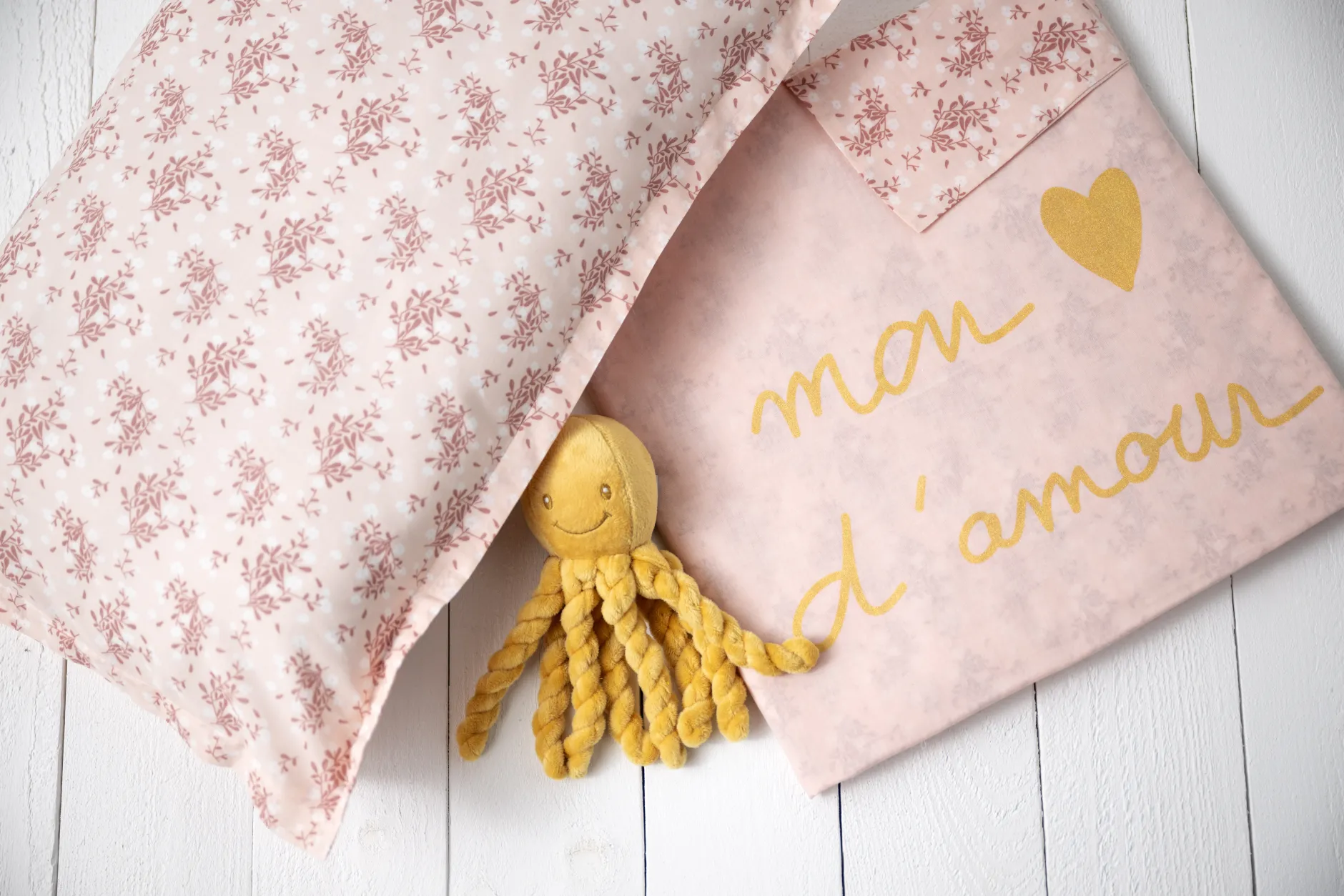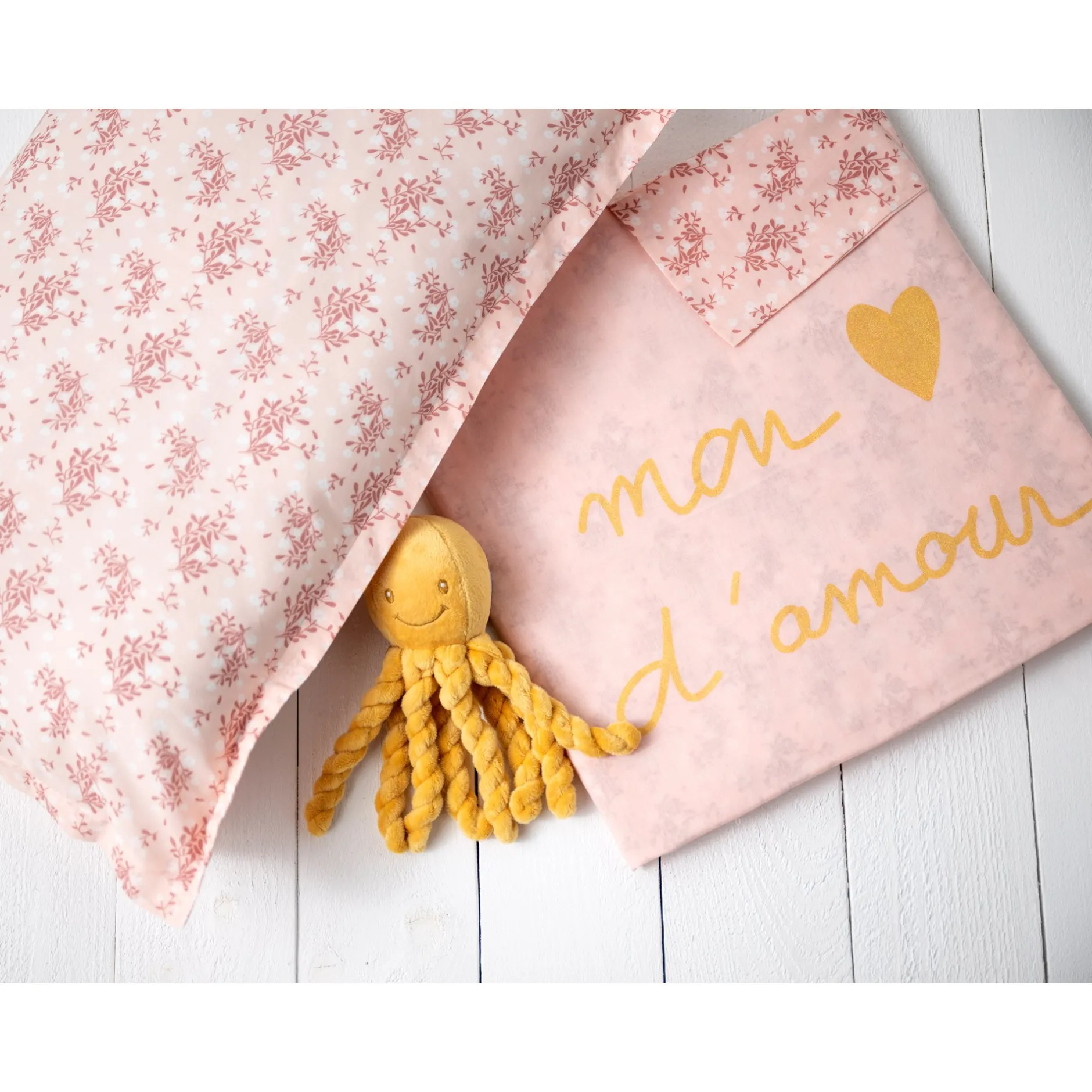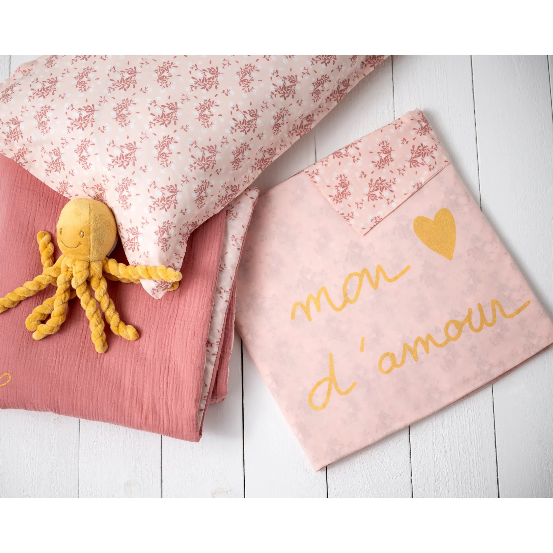 Parure de lit Petit à petit en voile composée d’une taie d’oreiller (40 x 60 cm) et d’une housse de couette (100 x 140 cm) en imprimé floral à base de rose , écru et rose terracotta au recto et en voile uni rose avec texte en doré « Mon cœur d’amour » au verso. L’ensemble parfait pour parfaire la déco de chambre de bébé et surtout pour lui permettre de bien dormir avec cette superbe parure de lit. Les ouvertures sont faciles pour permettre de glisser coussin et édredon.