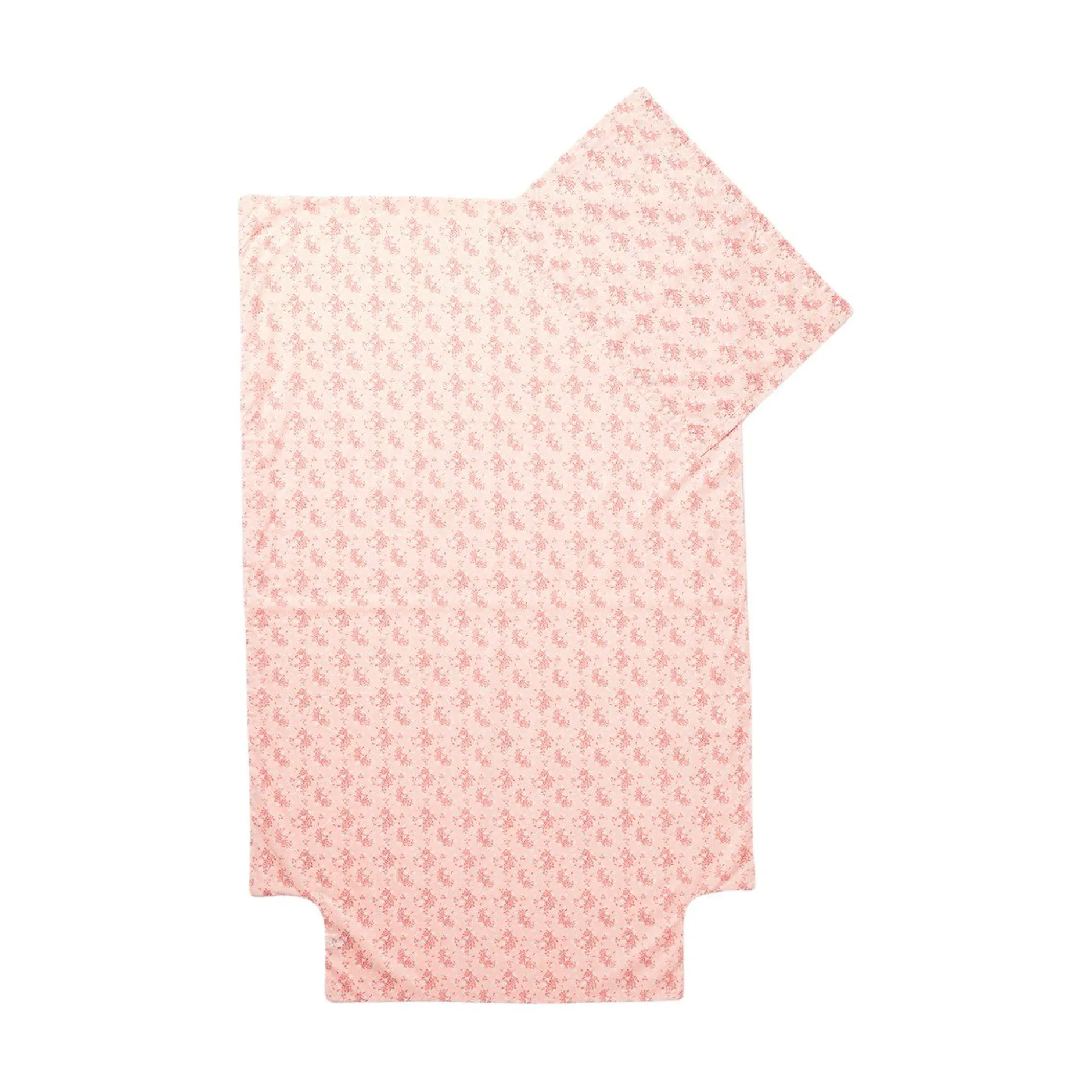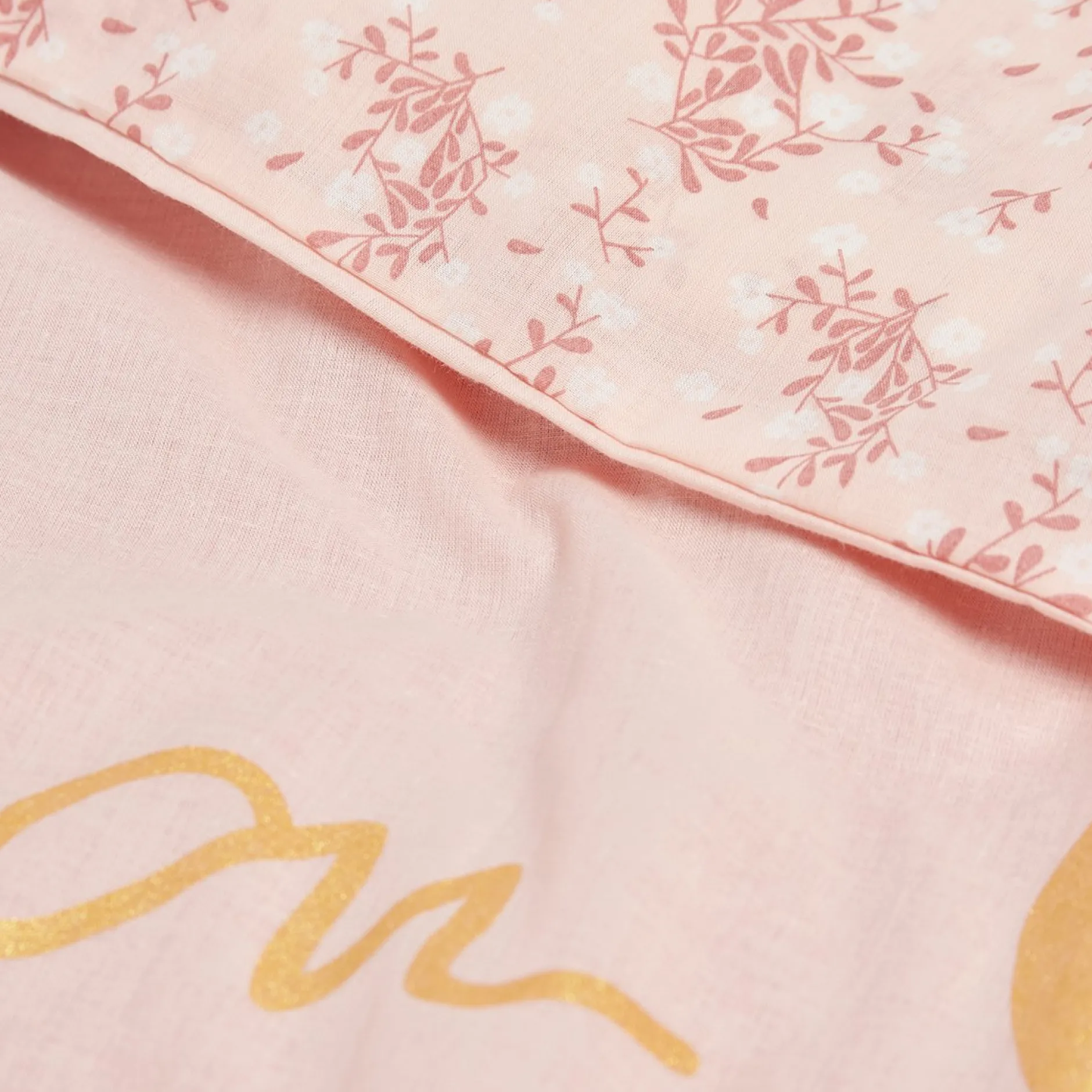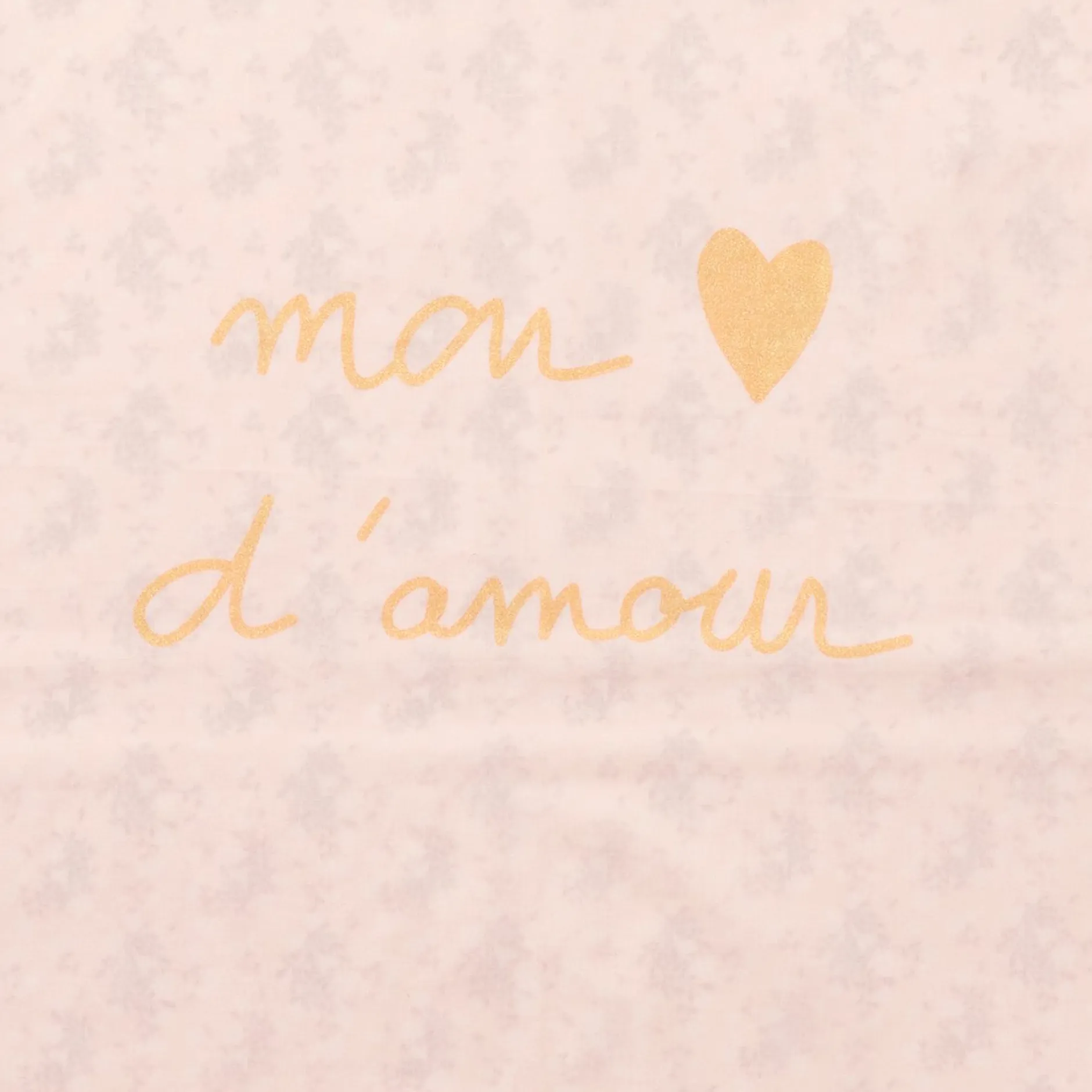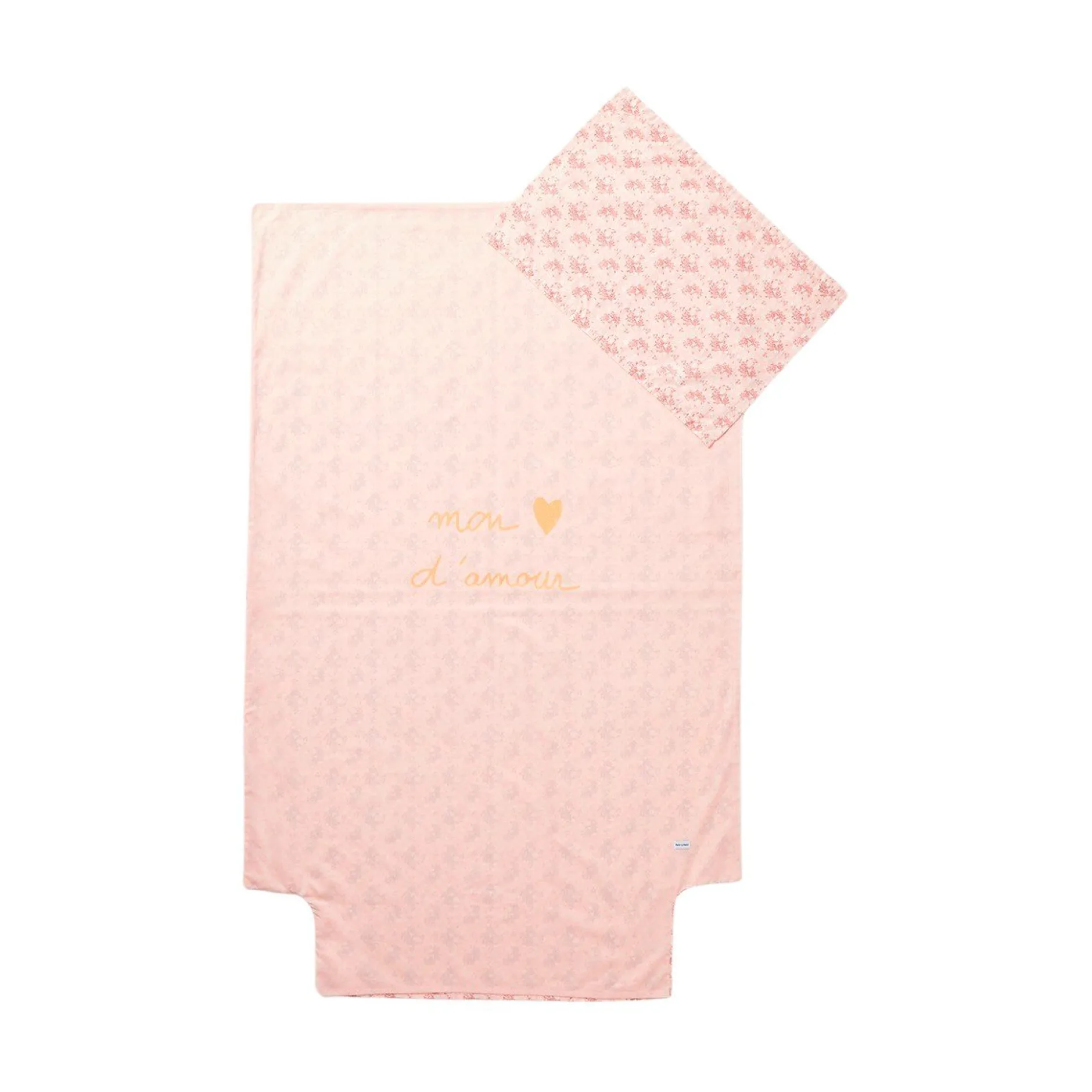 Parure de lit Petit à petit en voile composée d’une taie d’oreiller (40 x 60 cm) et d’une housse de couette (100 x 140 cm) en imprimé floral à base de rose , écru et rose terracotta au recto et en voile uni rose avec texte en doré « Mon cœur d’amour » au verso. L’ensemble parfait pour parfaire la déco de chambre de bébé et surtout pour lui permettre de bien dormir avec cette superbe parure de lit. Les ouvertures sont faciles pour permettre de glisser coussin et édredon.