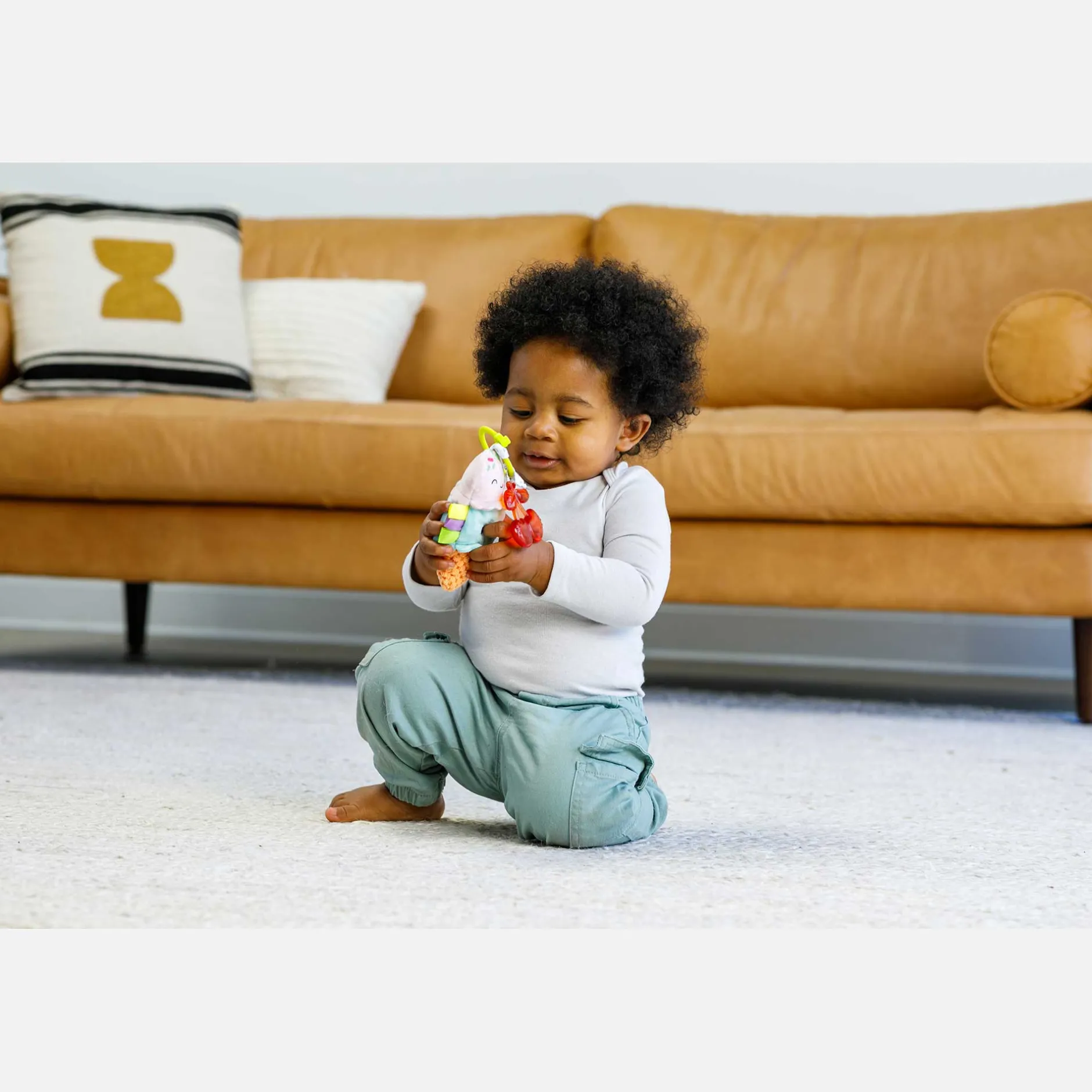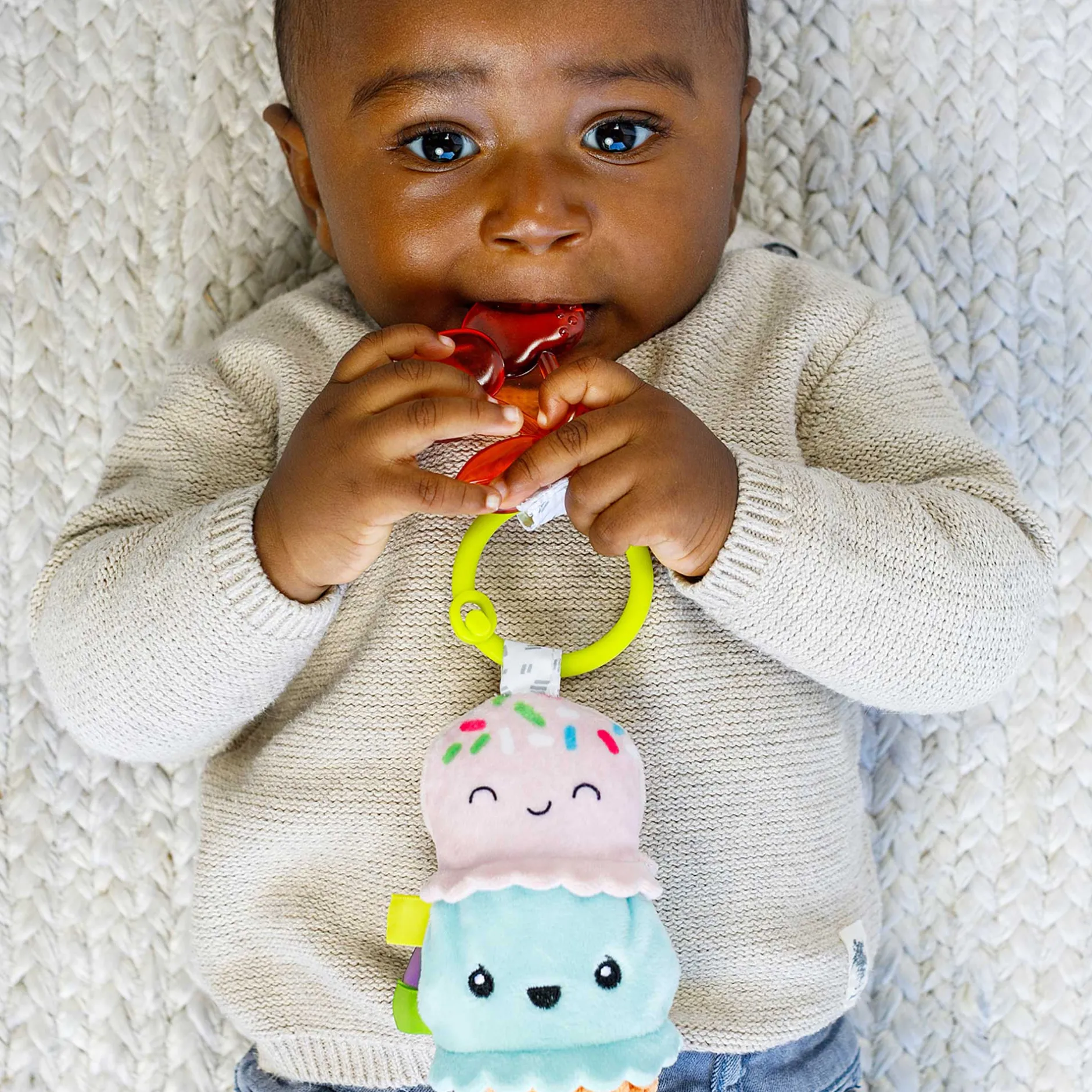 Amusez et réconfortez bébé grâce à sa pleuche à mordiller en forme de glace à deux boules. Colorées et douce, elle a une petite cerise en silicone à mordiller pour soulager les gencives de bébé.