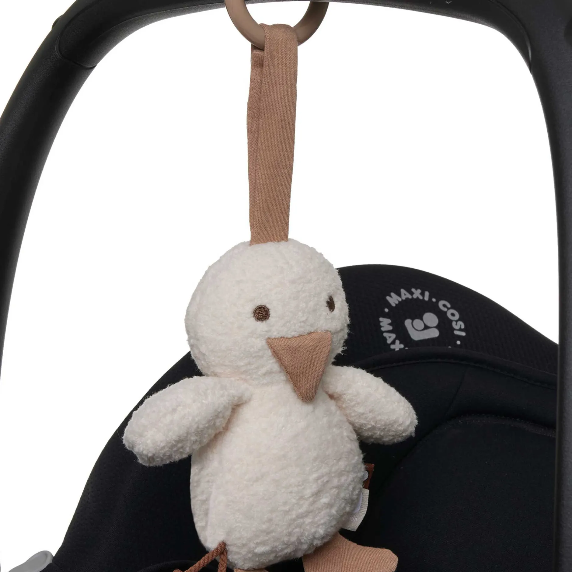Cet adorable canard peut être facilement attaché au maxi cosi ou à la poussette grâce à l’anneau en plastique. L’intérieur contient une clochette.