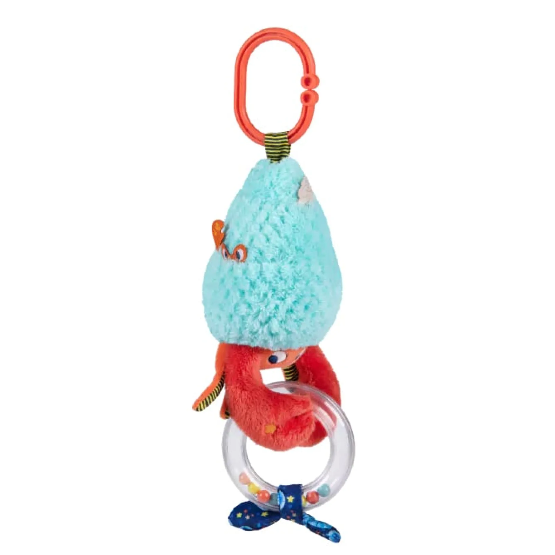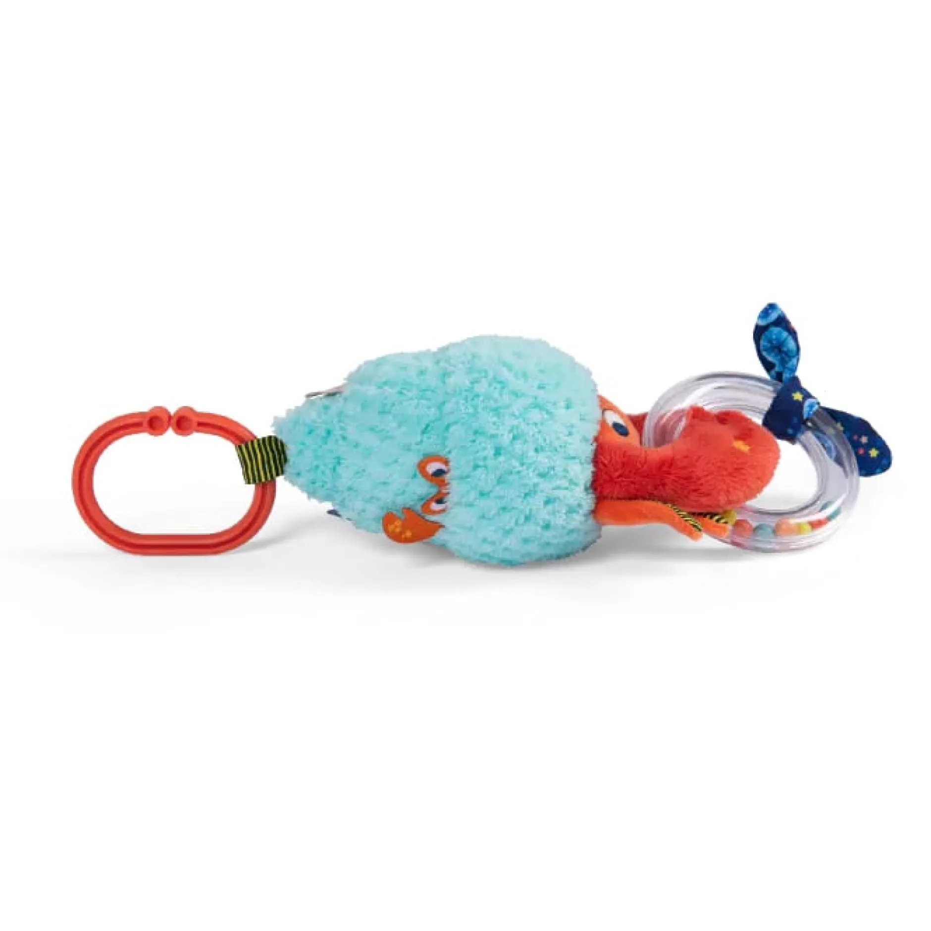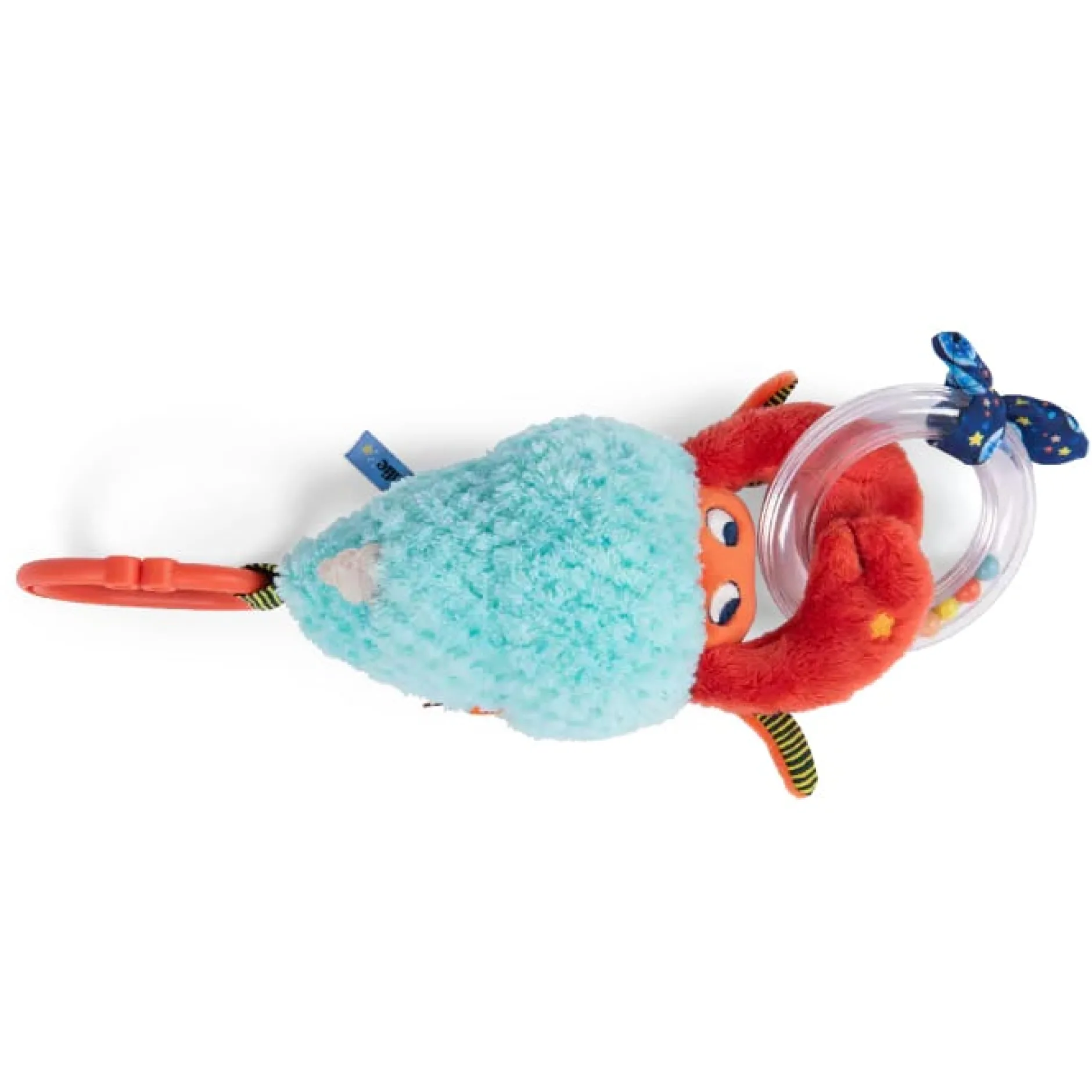 Voici un drôle de Bernard l’Hermite aux motifs colorés qui propose plein d’activités : anneau à billes, étiquettes à attraper, clochette…