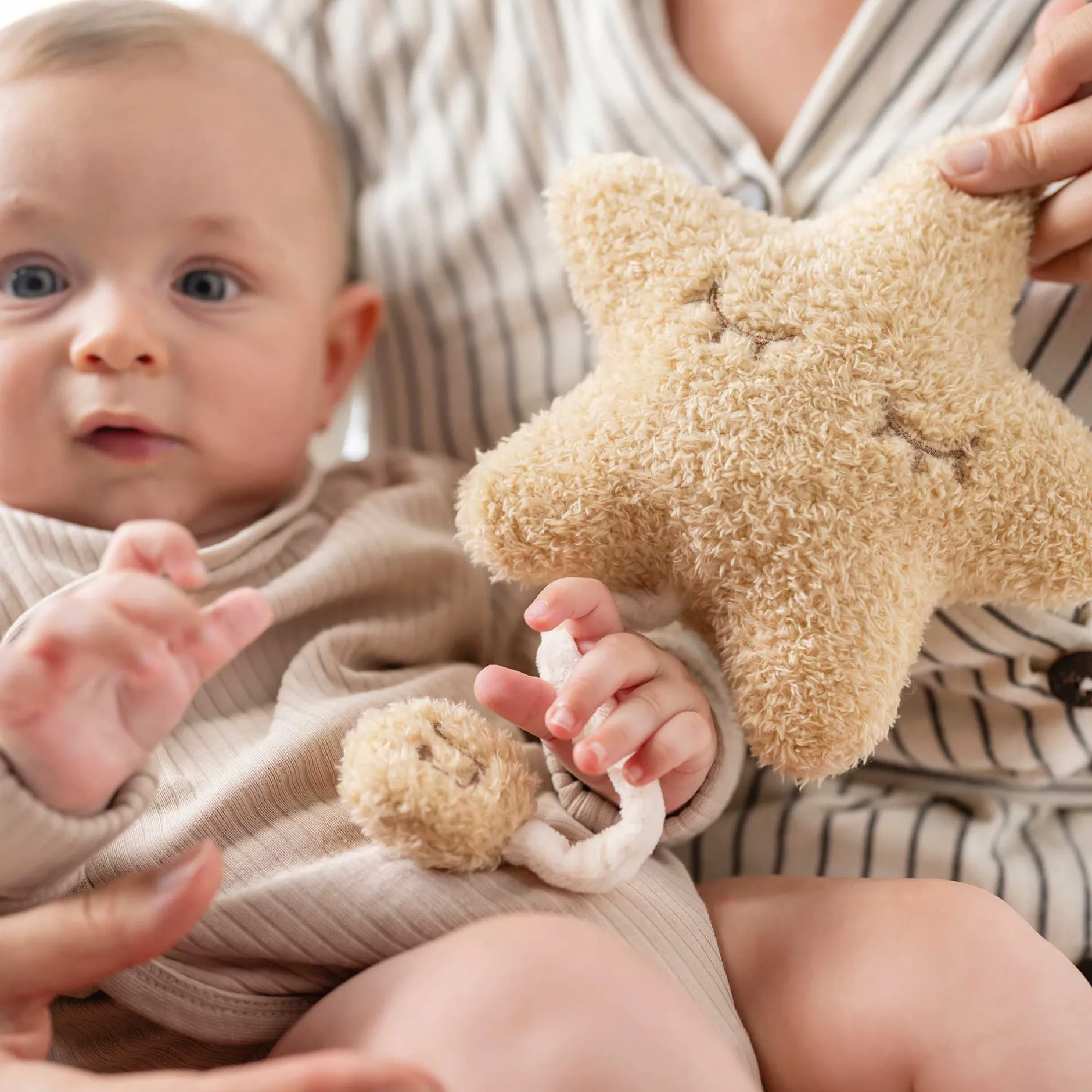 Cette peluche musicale avec une boîte à musique intégrée régale votre tout-petit avec une douce mélodie « La-Le-Lu ».