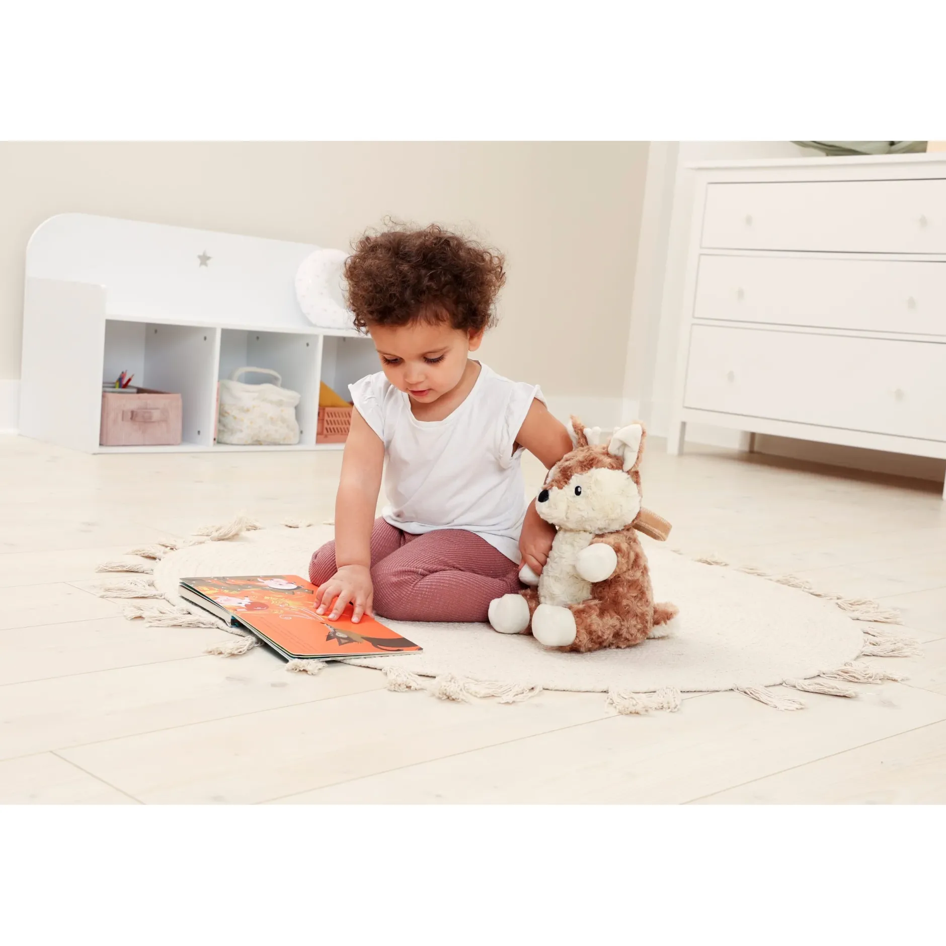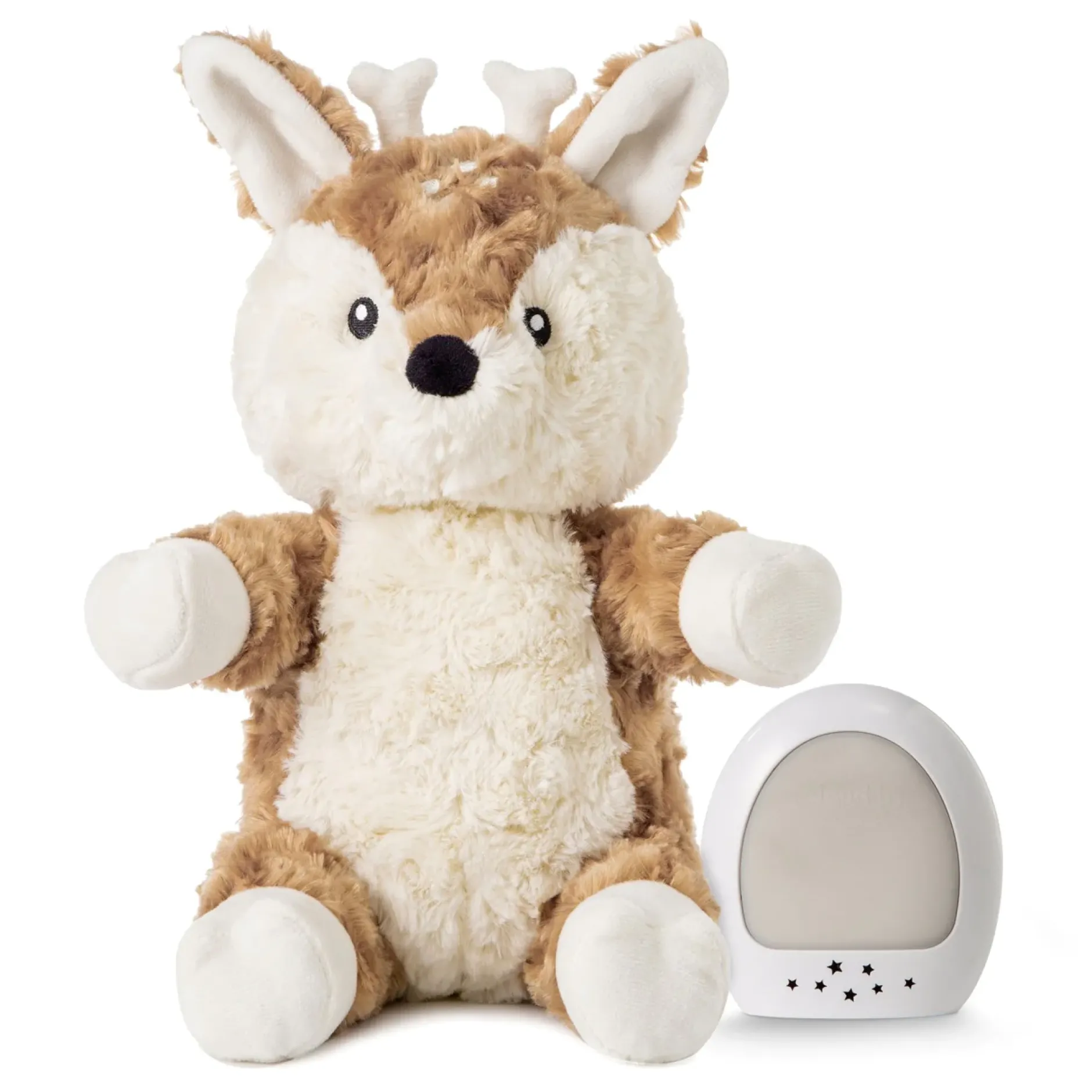 De plus, la peluche s’illumine d’une lueur chaleureuse qui pulse doucement pour apaiser les tout-petits, avec 5 couleurs et 2 effets lumineux. Pratique, grâce au détecteur de mouvement Shake&Play une simple secousse de la peluche permet de redémarrer la lumière, les berceuses et le message sonore enregistré par les parents.