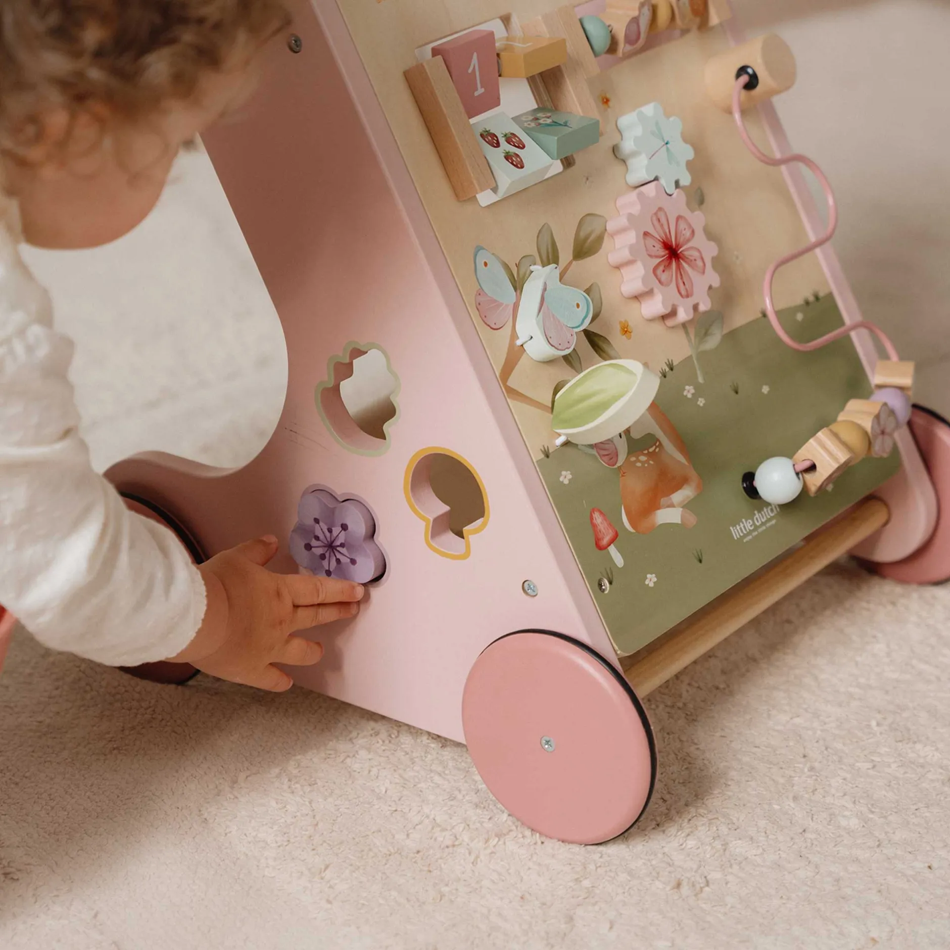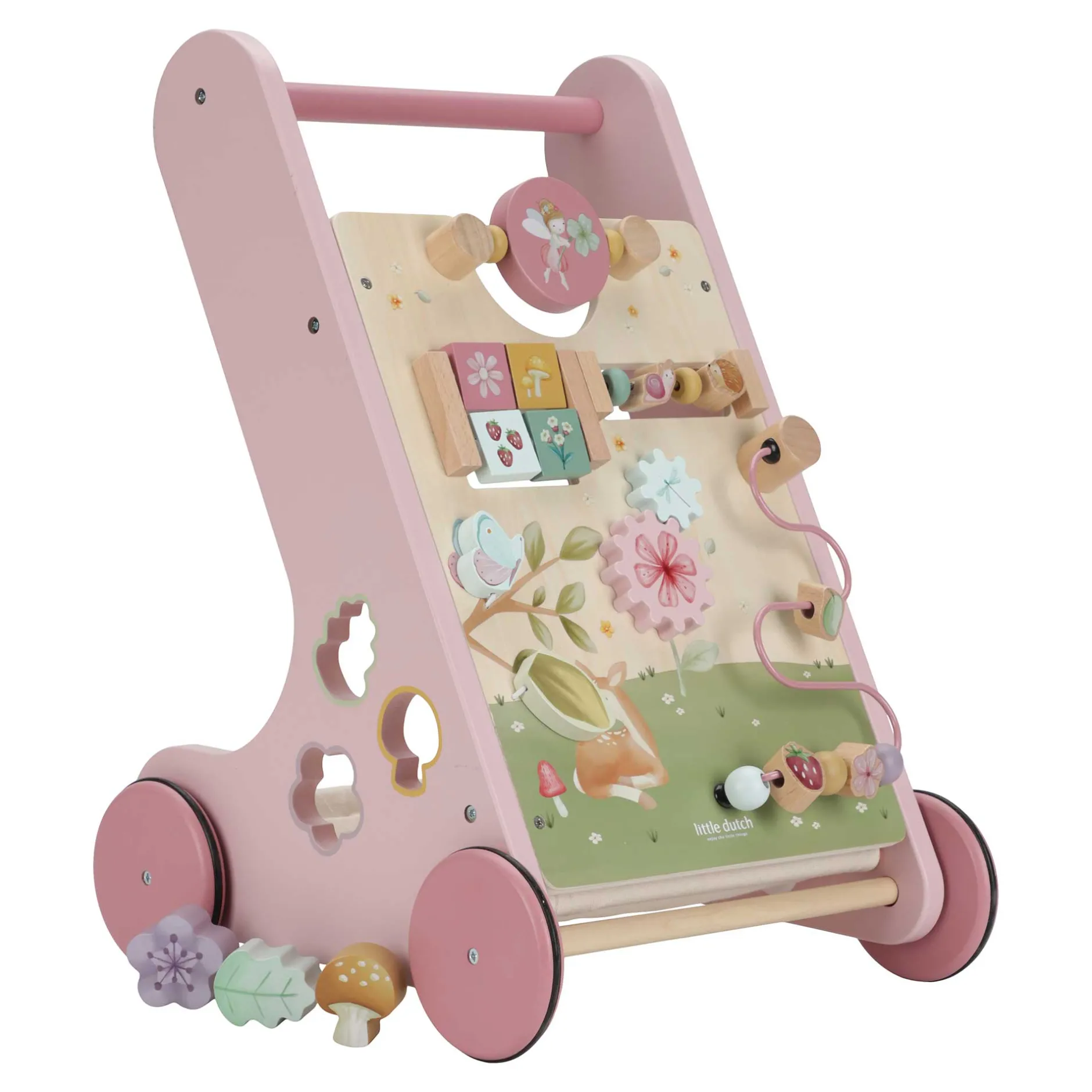 Ce chariot de marche en bois offre 8 activités pour développer les capacités motrices de votre enfant.