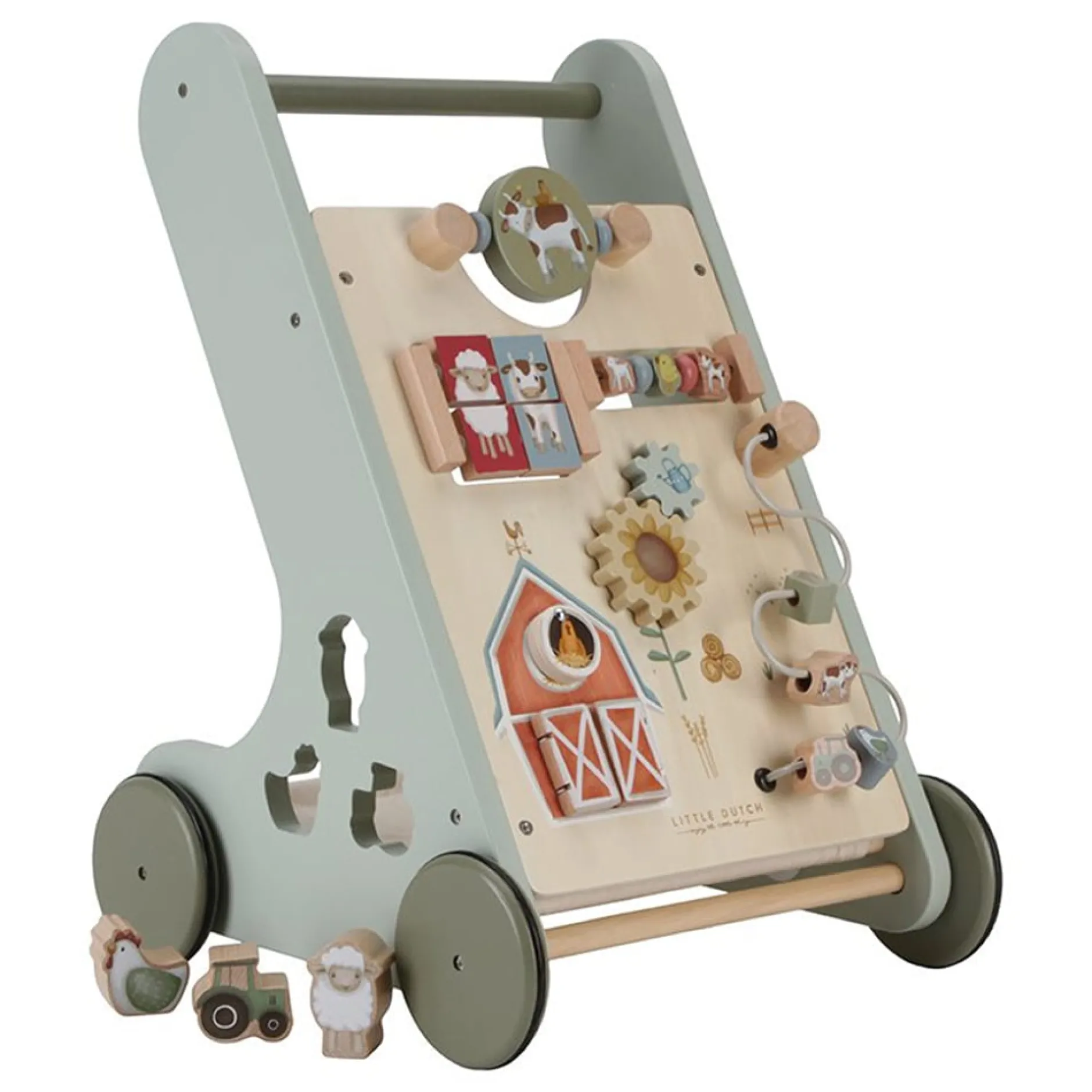 Marcher, jouer et apprendre! Ce chariot de marche en bois offre diverses activités stimulantes qui soutiennent le développement des compétences motrices de votre enfant.