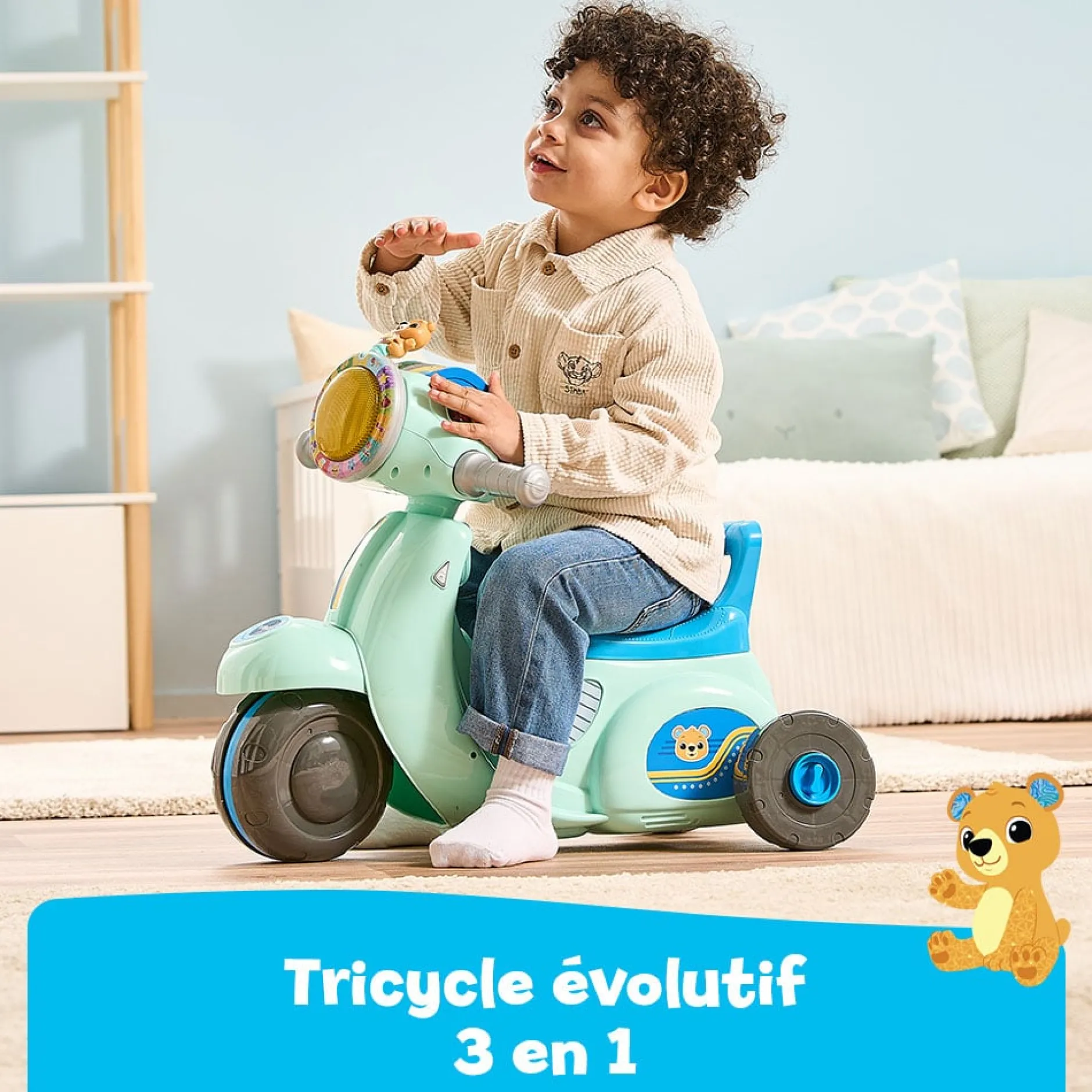- Un porteur avec 3 façons de jouer : tricycle, scooter et tableau de bord interactif