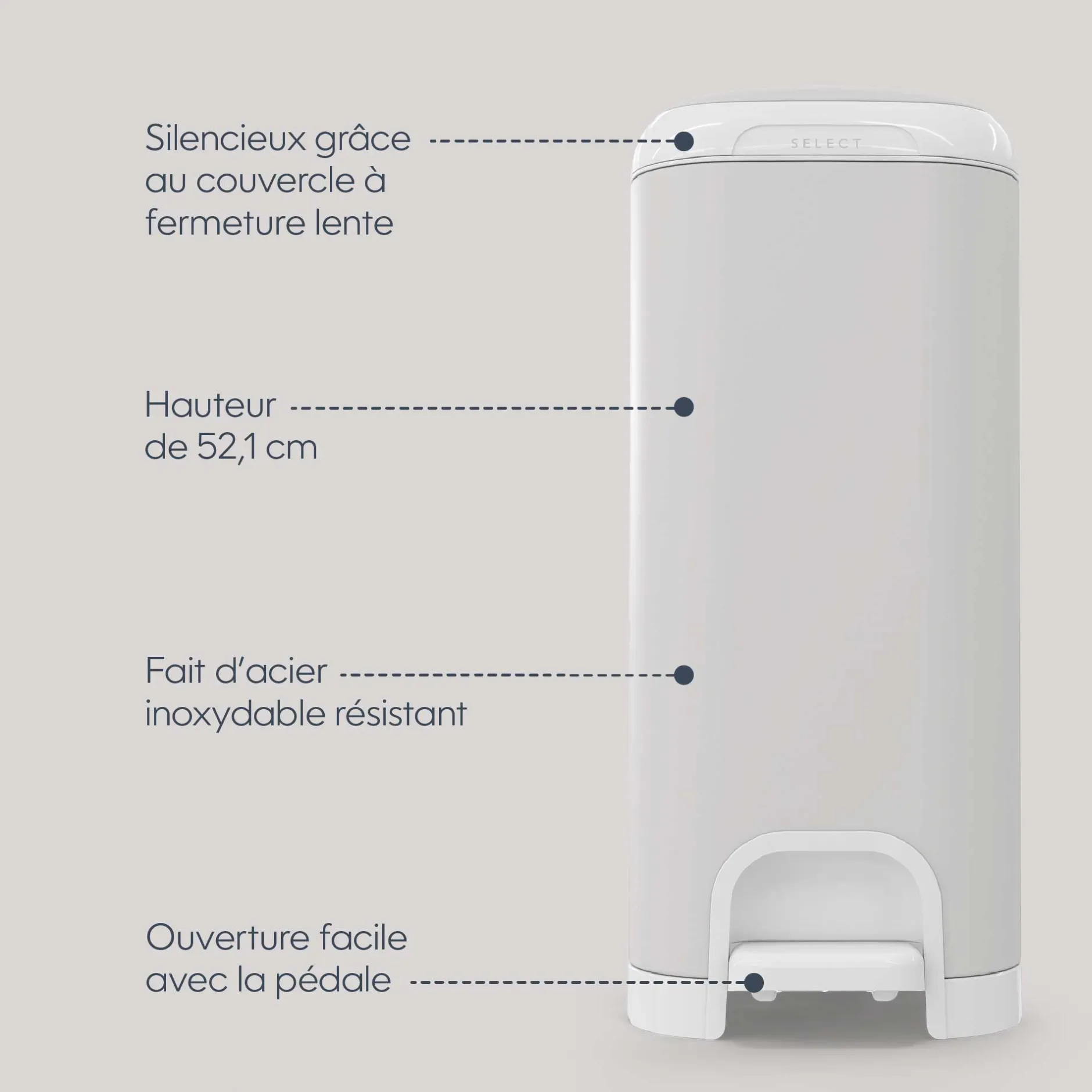Fabriquée en acier inoxydable durable, la nouvelle Poubelle Diaper Genie Select est dotée d’une pince de blocage des odeurs Push N Lock, qui aide à contenir efficacement les odeurs des couches souillées.Pour plus de commodité, le système de disposition des couches Select présente une hauteur de 52,1 cm et une large ouverture, ainsi qu’une pédale pour une utilisation facile à une seule main.