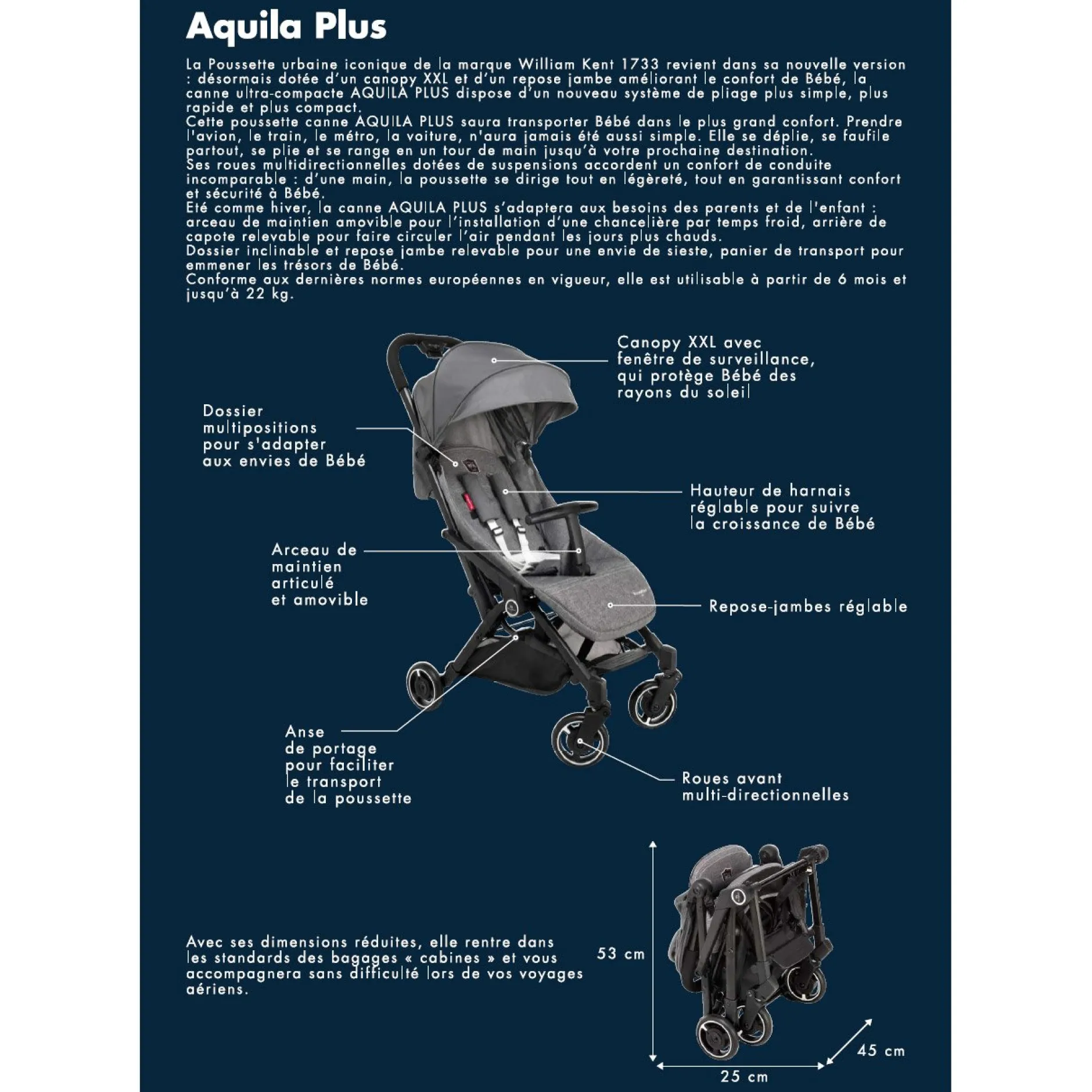 Conforme aux dernières normes européennes en vigueur, la canne AQUILA PLUS est utilisable à partir de 6 mois et jusqu’à 22 kg ! Avec ses dimensions réduites, elle rentre dans les standards des bagages « cabines » et vous accompagnera sans difficulté lors de vos voyages aériens.
