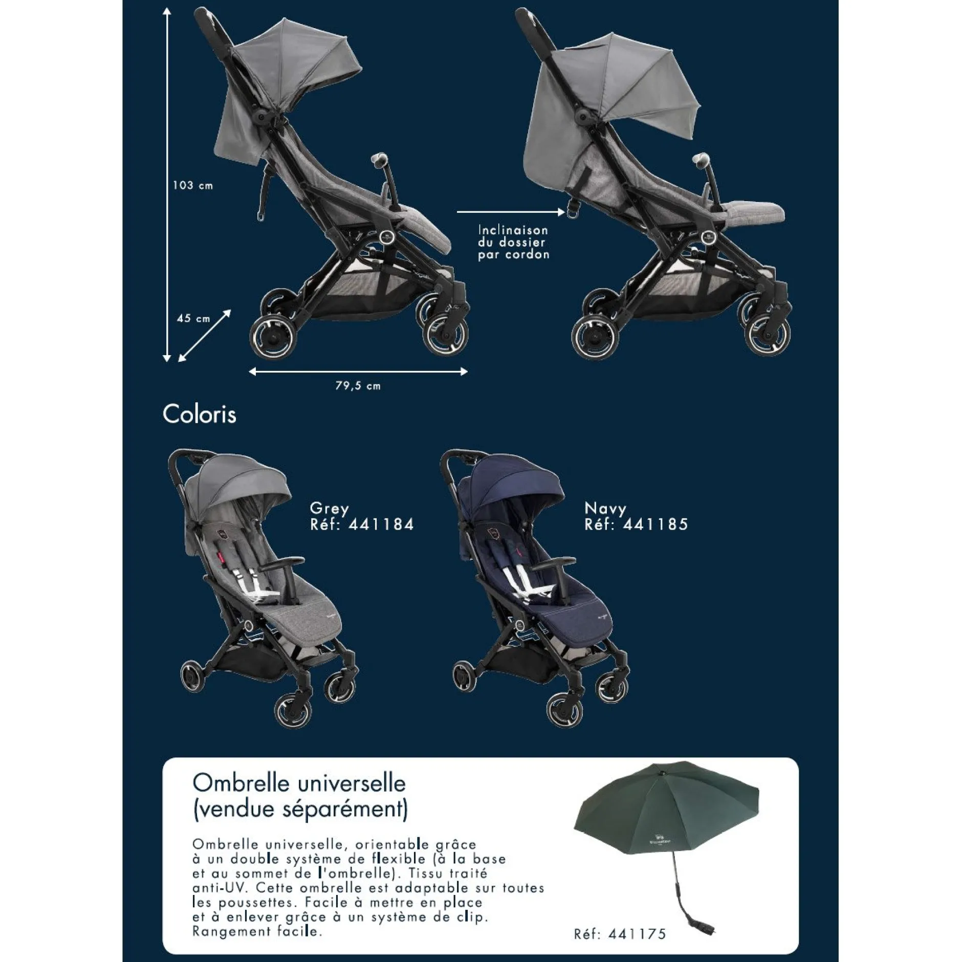 Eté comme hiver et à n’importe quelle heure de la journée, la canne AQUILA PLUS s’adaptera à vos besoins : arceau de maintien amovible pour l’installation d’une chancelière par temps froid, arrière de capote relevable pour faire circuler l’air pendant les jours chauds, dossier inclinable et repose-jambes relevable pour une envie de sieste, panier de transport pour emmener les trésors de bébé. La canne AQUILA PLUS est la compagne idéale de tous vos voyages !