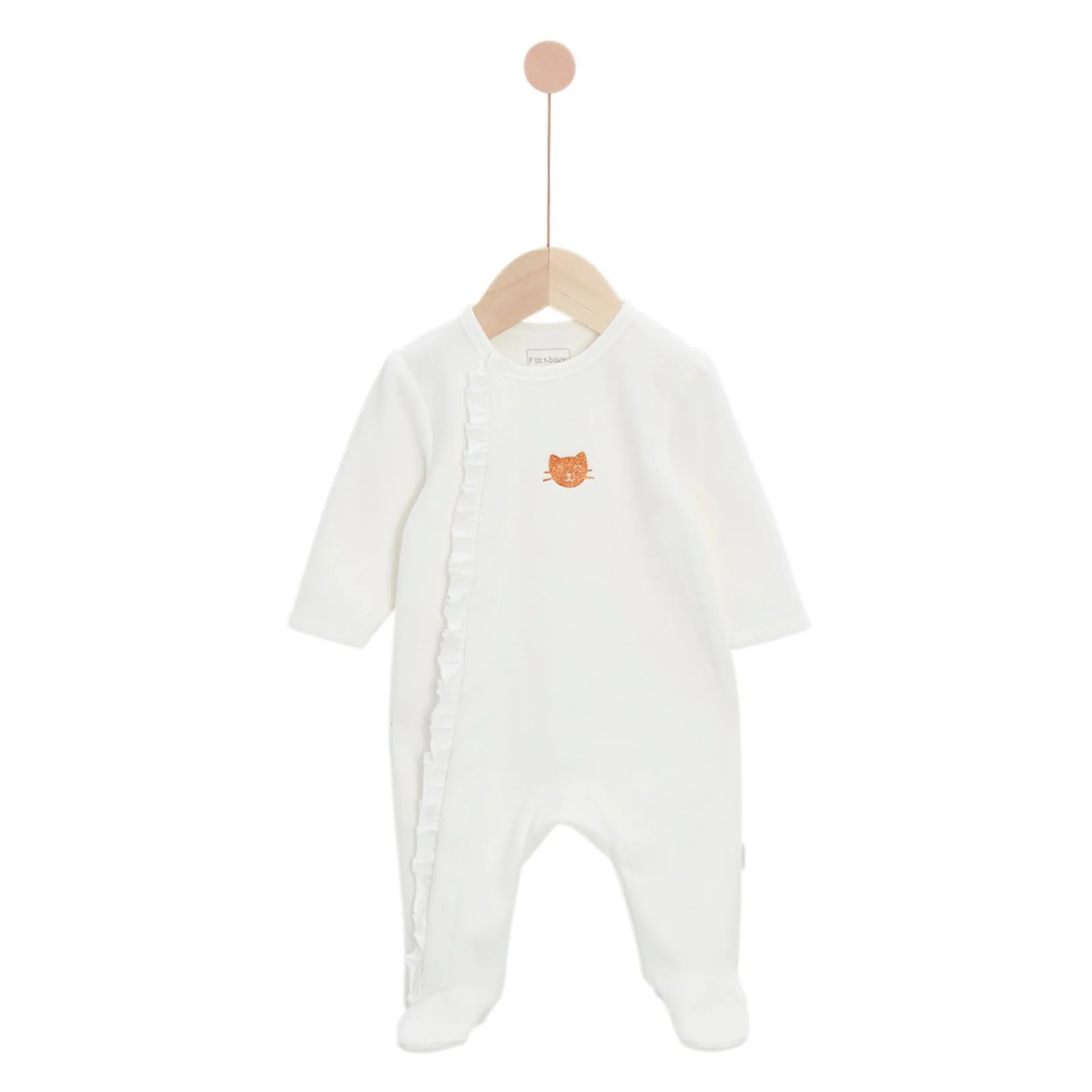 Pyjama P’tit Bisou en velours écru tellement doux et mignon avec sa petite tête de chat en encre pailletée cuivrée sur le devant !