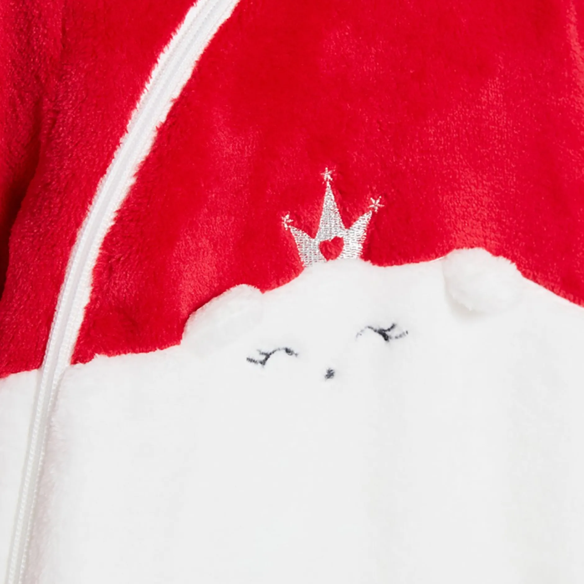 En fausse fourrure toute douce bicolore blanc et rouge pour un côté très festif. Ouverture totale devant et sur le côté par un zip pour plus de fonctionnalité car évite de trop manipuler bébé. Très jolie animation sur le devant représentant une tête d’une jolie biche brodée devant avec ses oreilles qui dépassent.