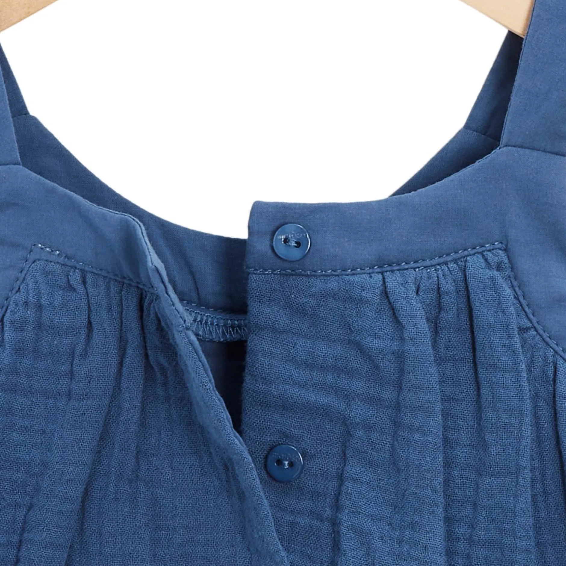 Robe + bloomer (cache-couche) Marèse en mousseline de gaze en bleu saphir. La forme est très féminine avec ses manches à bretelles très « plein été » qui donnent un beau rendu féminin et un beau volume donné par des fronces devant qui partent du Haut. La robe est entièrement doublée de voile pour des finitions parfaites et éviter la transparence. Ouverture dos par petits boutons gravés à la marque en ton sur ton. A noter les très belles broderies de fleurs romantiques en Bas de la robe.