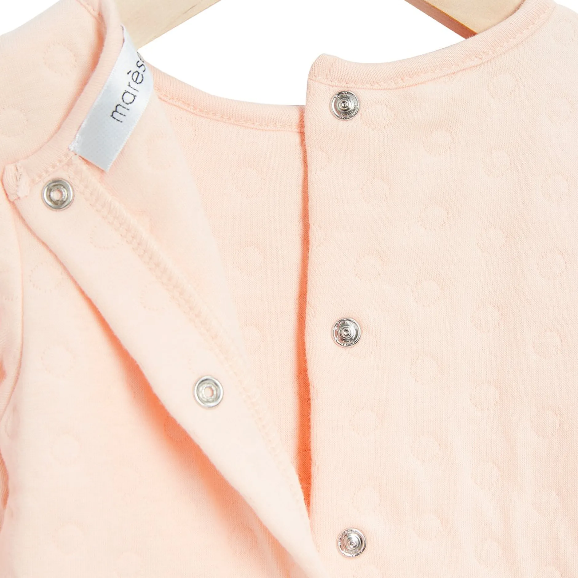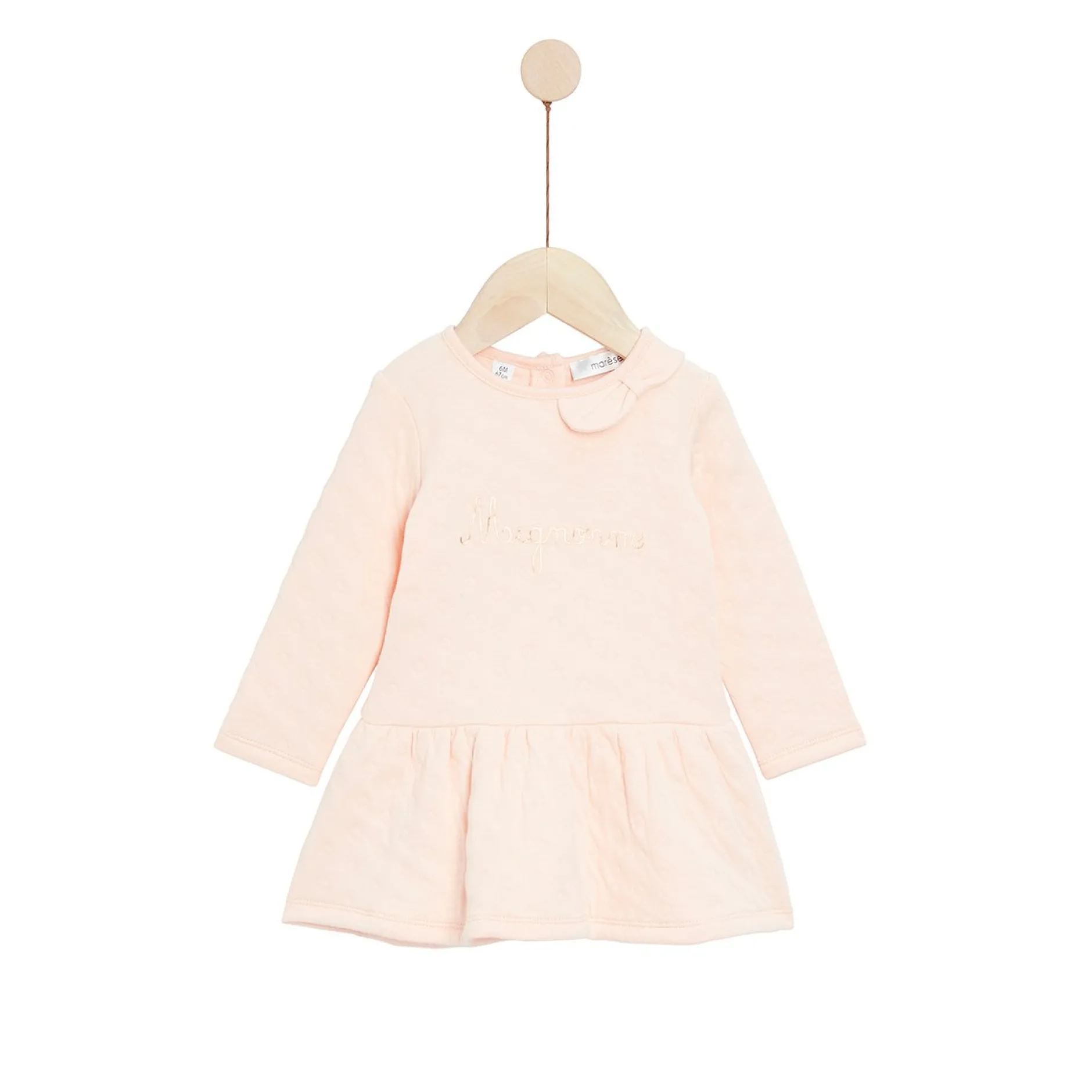 Robe Marèse en molleton à jacquard (dessins étant des petits ronds) en rose pâle. Cette robe est à manche longues avec une encolure ronde. Jolie impression en encre dorée devant avec le texte « mignonne ». Joli nœud cousu au col sur la partie gauche au porter pour un côté très féminin.Très jolie découpe à la taille d’où partent des fronces pour un bel effet de volume.