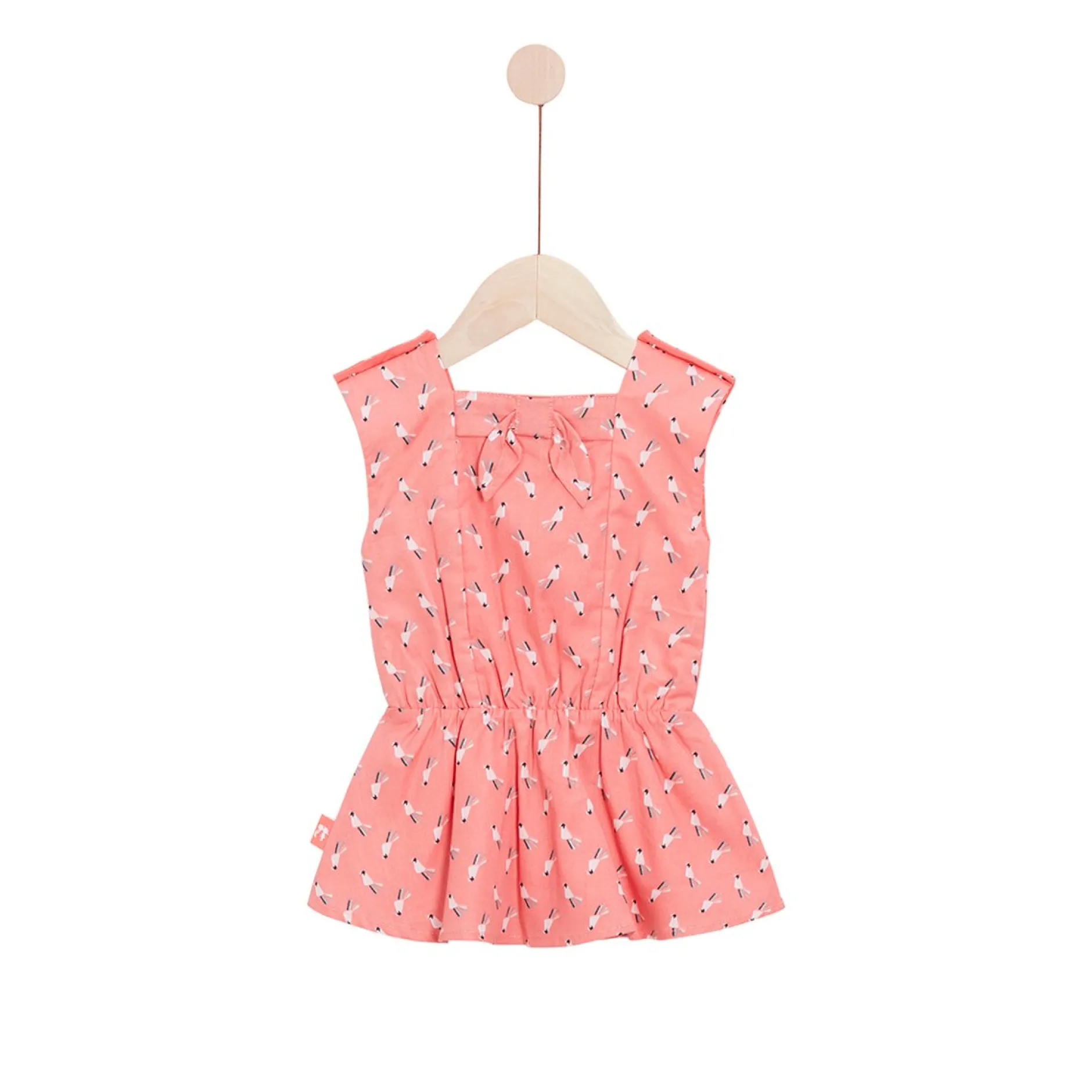 Robe manches courtes Nano et Nanette en voile de coton imprimé exclusif « perroquets des îles » dans les coloris rose corail.