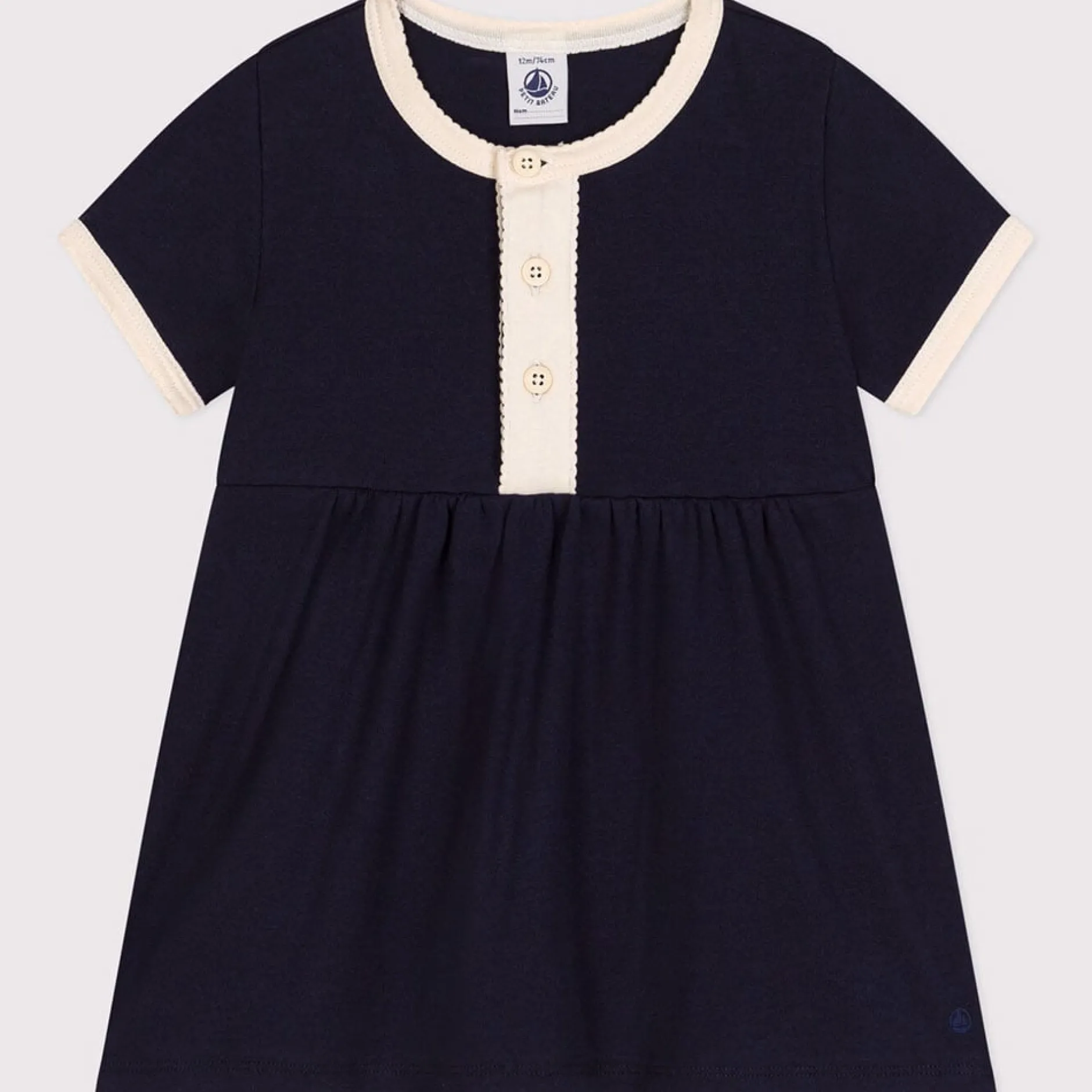 Robe en côte 1X1, une matière extensible et confortable, emblématique de Petit Bateau. Robe unie avec détails contrastés en point cocotte et jupe légèrement évasée. Ouverture boutonnée devant pour faciliter l’enfilage.