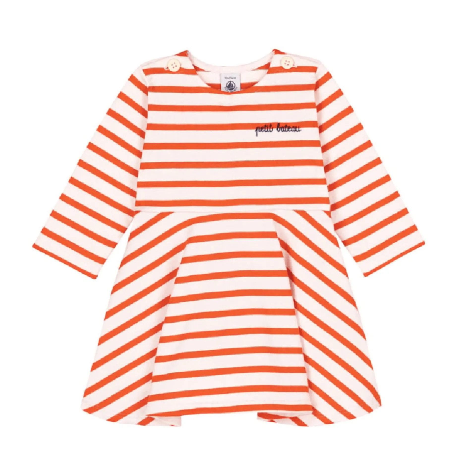 Robe fille en jersey épais, une matière confortable avec une bonne tenue et une rayure revisitée. Une jolie rayure colorée sur une robe qui tourne et une broderie poitrine qui nous fait craquer !