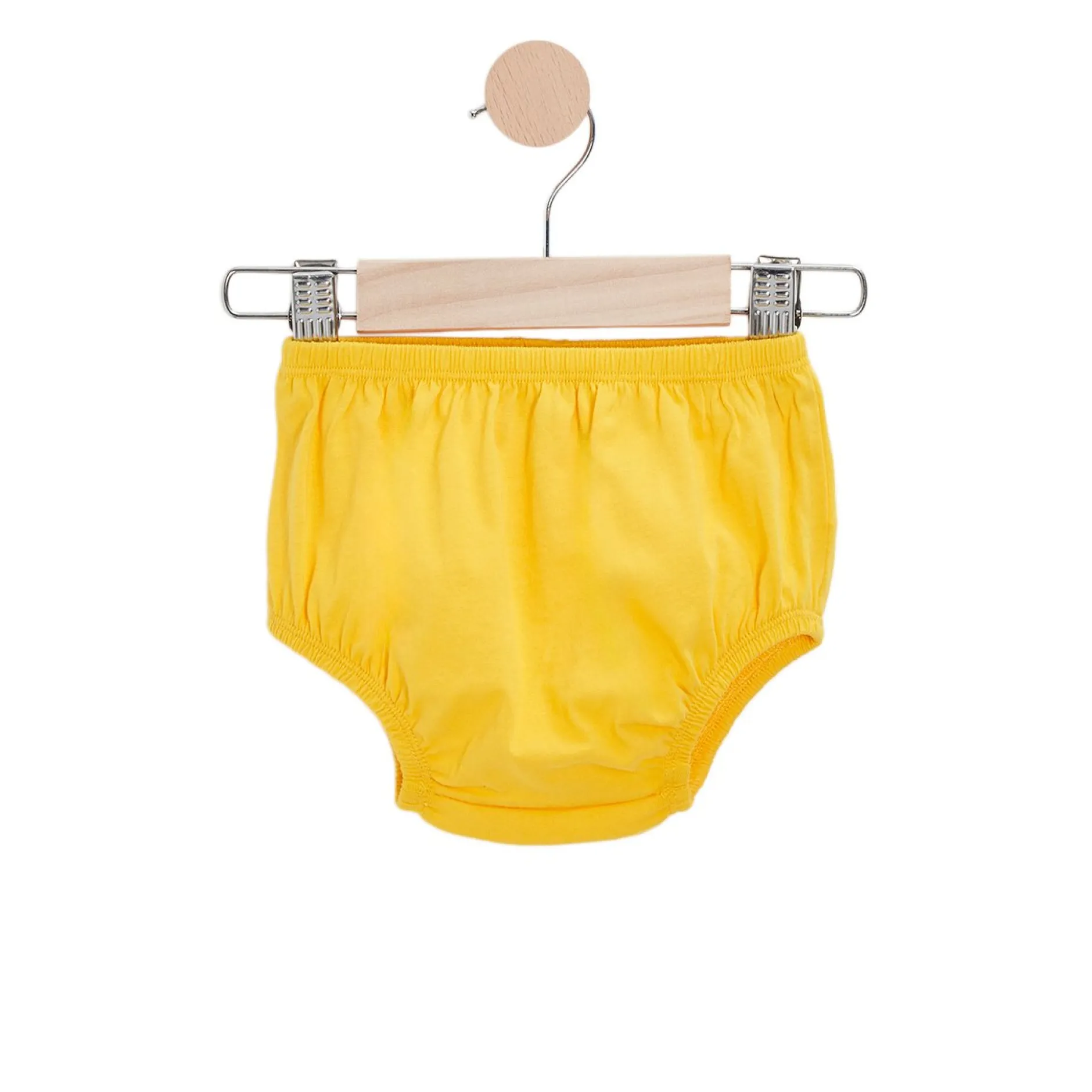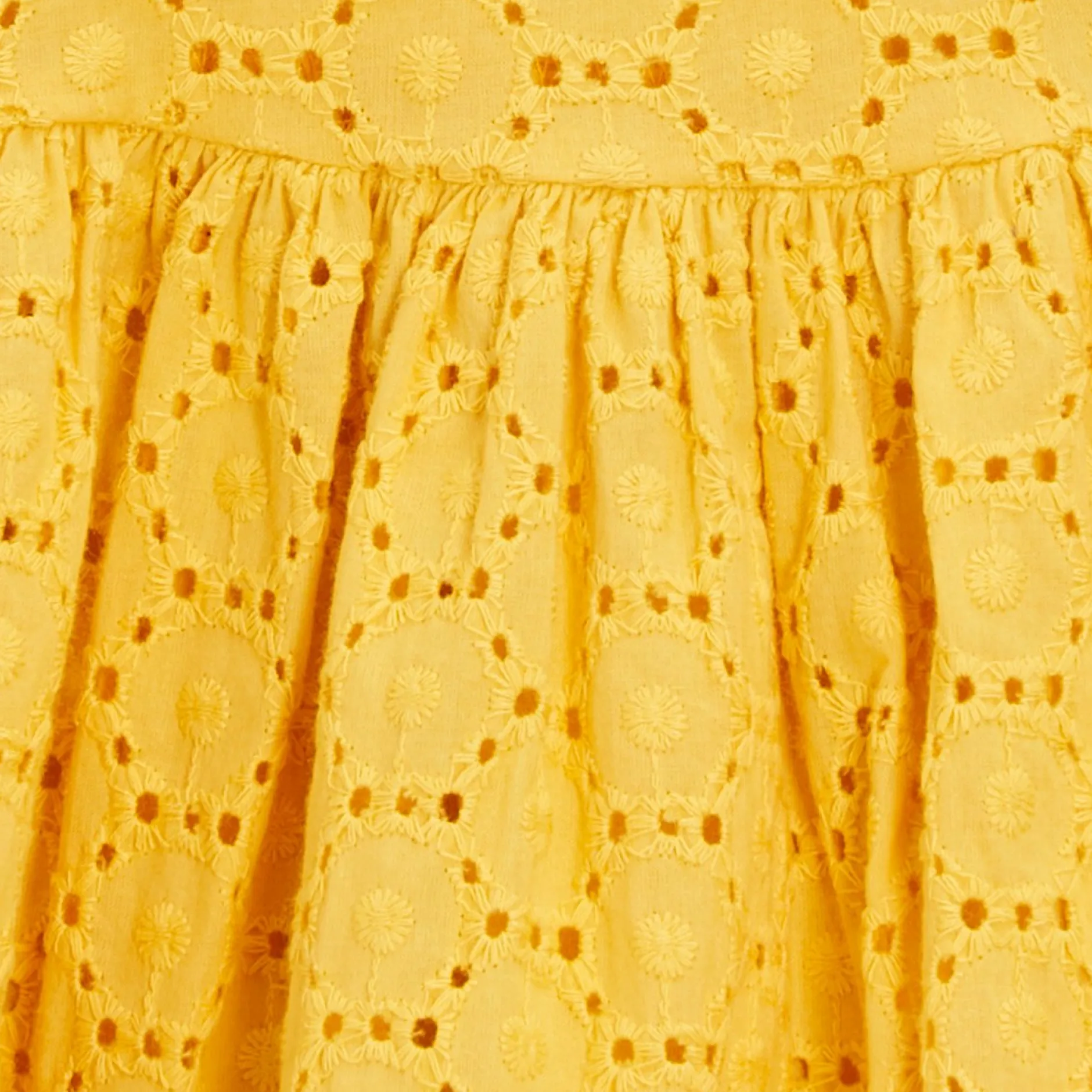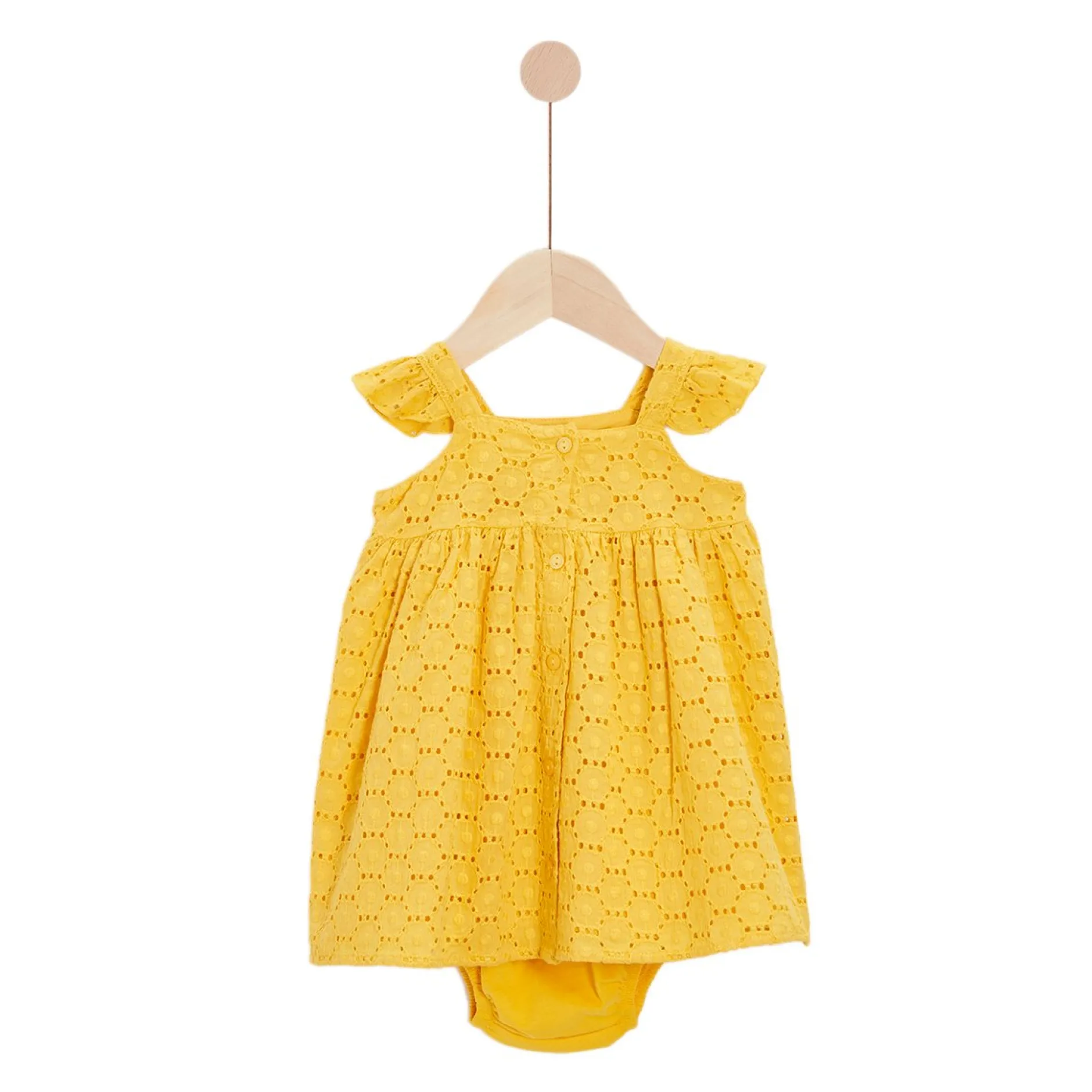 Robe + bloomer (cache-couche) P’tit Bisou en voile de broderie anglaise jaune. La forme est très féminine avec ses manches à volants et sa découpe sous poitrine d’où partent des fronces pour donner un beau volume. La robe est entièrement doublée de voile pour des finitions parfaites et éviter la transparence. Ouverture dos par petits boutons gravés « p’tit bisou » en ton sur ton . Le bloomer ou cache- couche est en jersey jaune. La pièce craquante et indispensable dans le vestiaire de bébé ! Lavage conseillé à 30°c.
