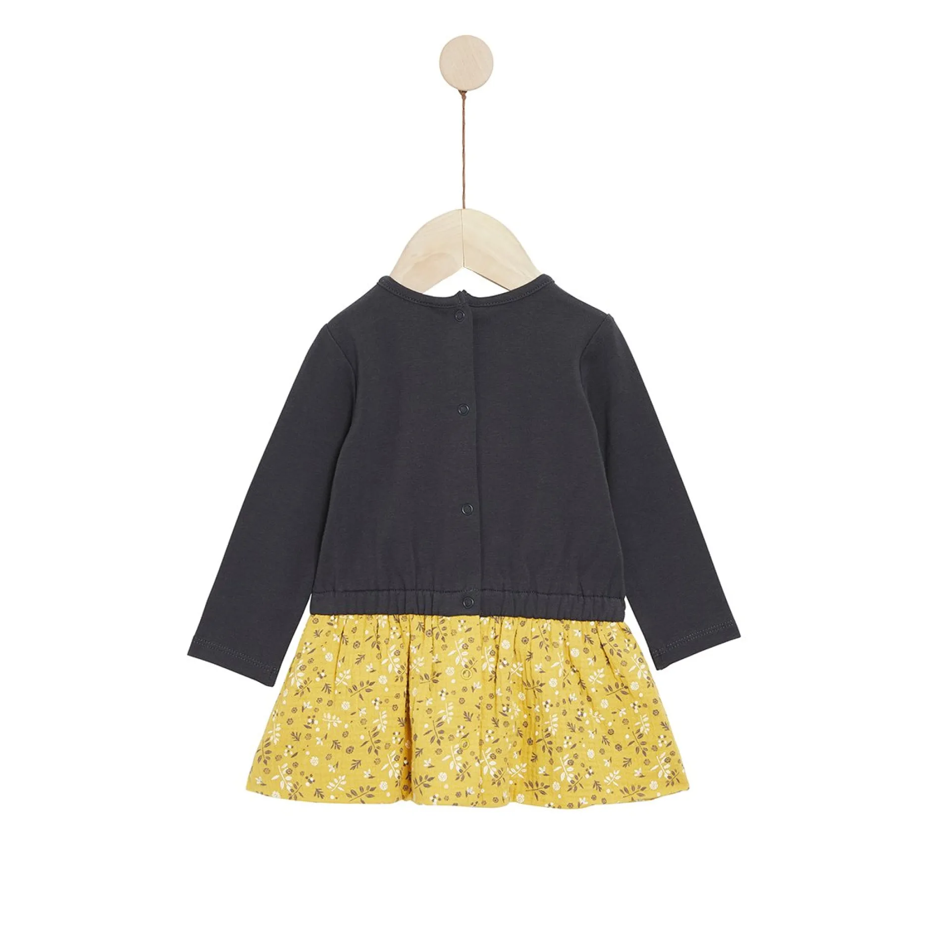 Robe P’tit Bisou en bi-matière. Le haut est comme un tee-shirt manches longues en jersey gris anthracite. Il a une encolure ronde. Le bas forme jupe (attenant au haut pour un effet trompe à l’œil !) est en mousseline de gaze avec imprimé « feuillage automnal » sur fond jaune safran.