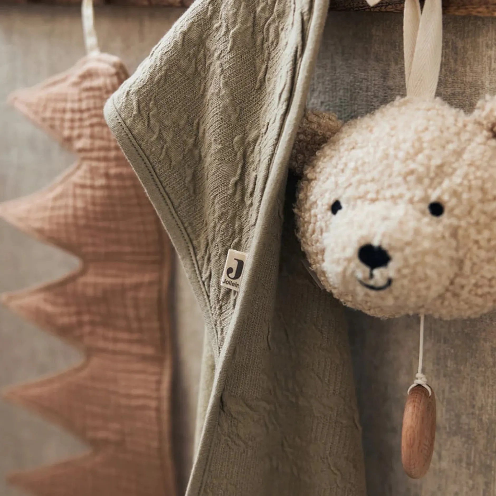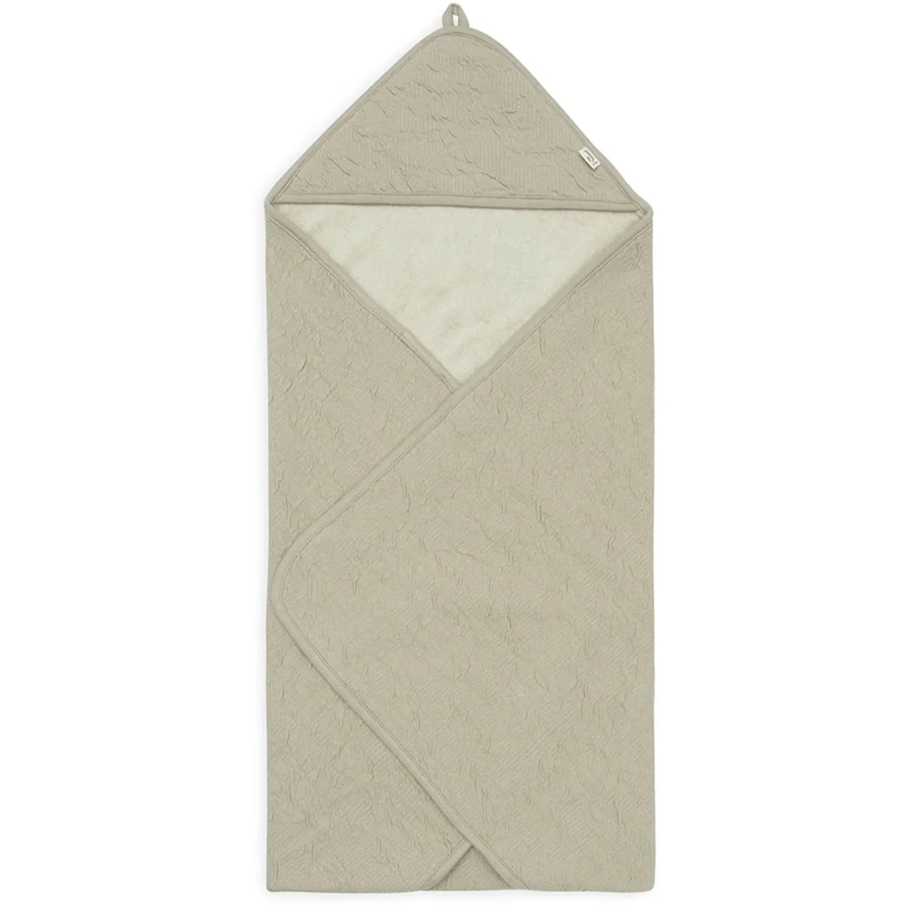 Le haut de la cape de bain est muni d’un crochet pratique qui vous permet de la suspendre facilement après utilisation. La serviette de bain Soft Waves est disponible en vert olive et nougat et est fabriquée en coton certifié OEKO-TEX.