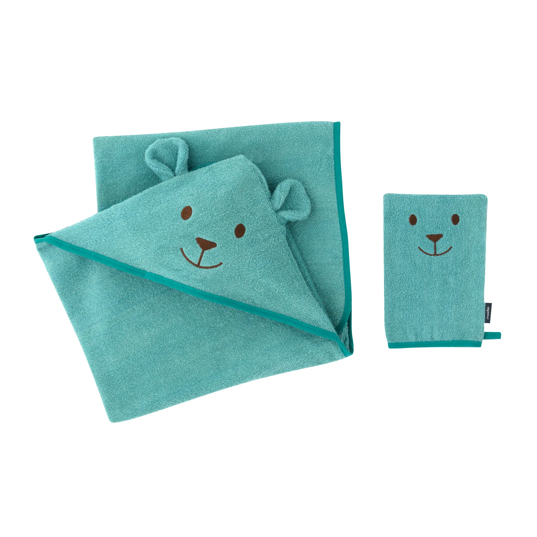 Coffret de bain Maika comprenant une cape de bain ours, ultra absorbante et moelleuse et un gant de toilette assorti.