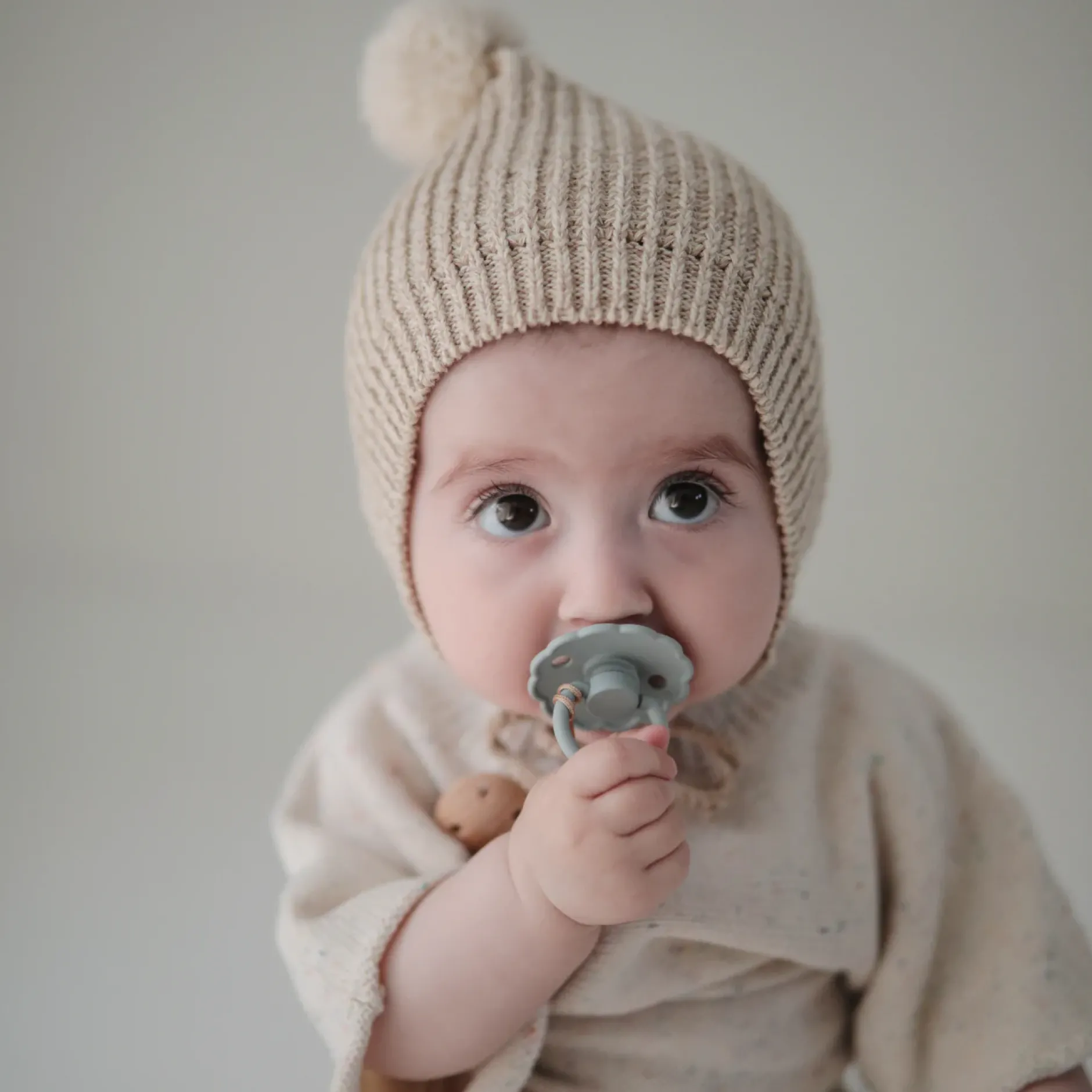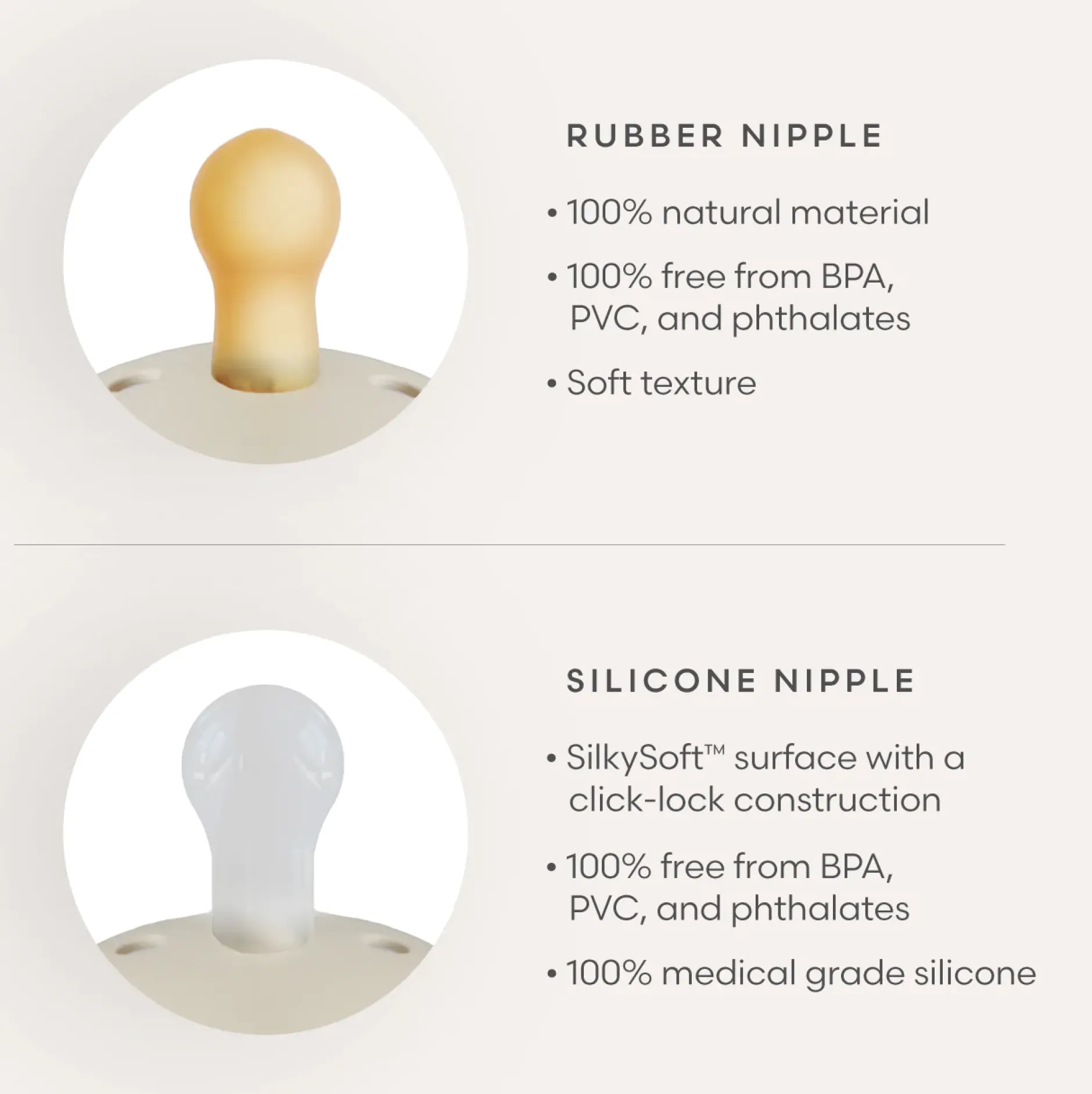 - La tétine de la sucette est fabriquée à partir de latex de caoutchouc 100 % naturel.