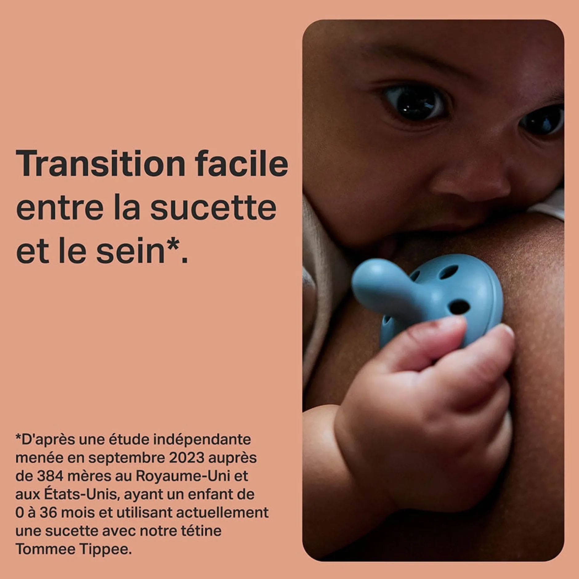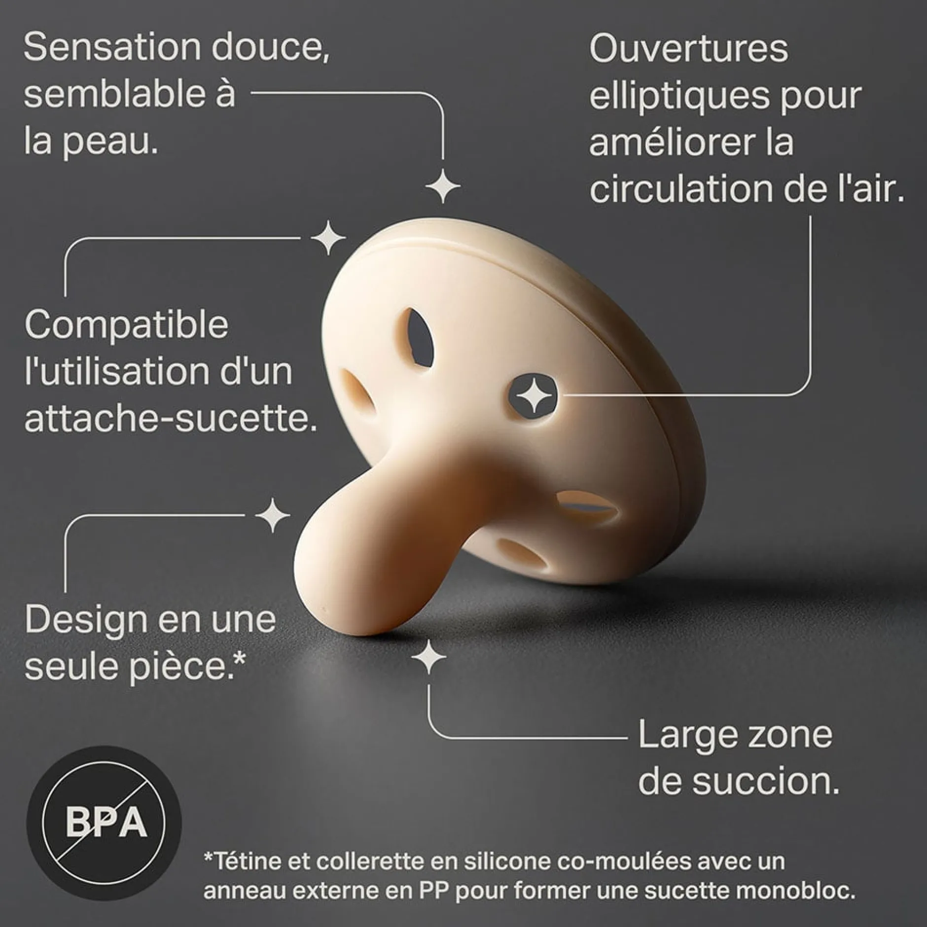 *Tétine et collerette en silicone co-moulées à un anneau externe en PP pour former une sucette monobloc.