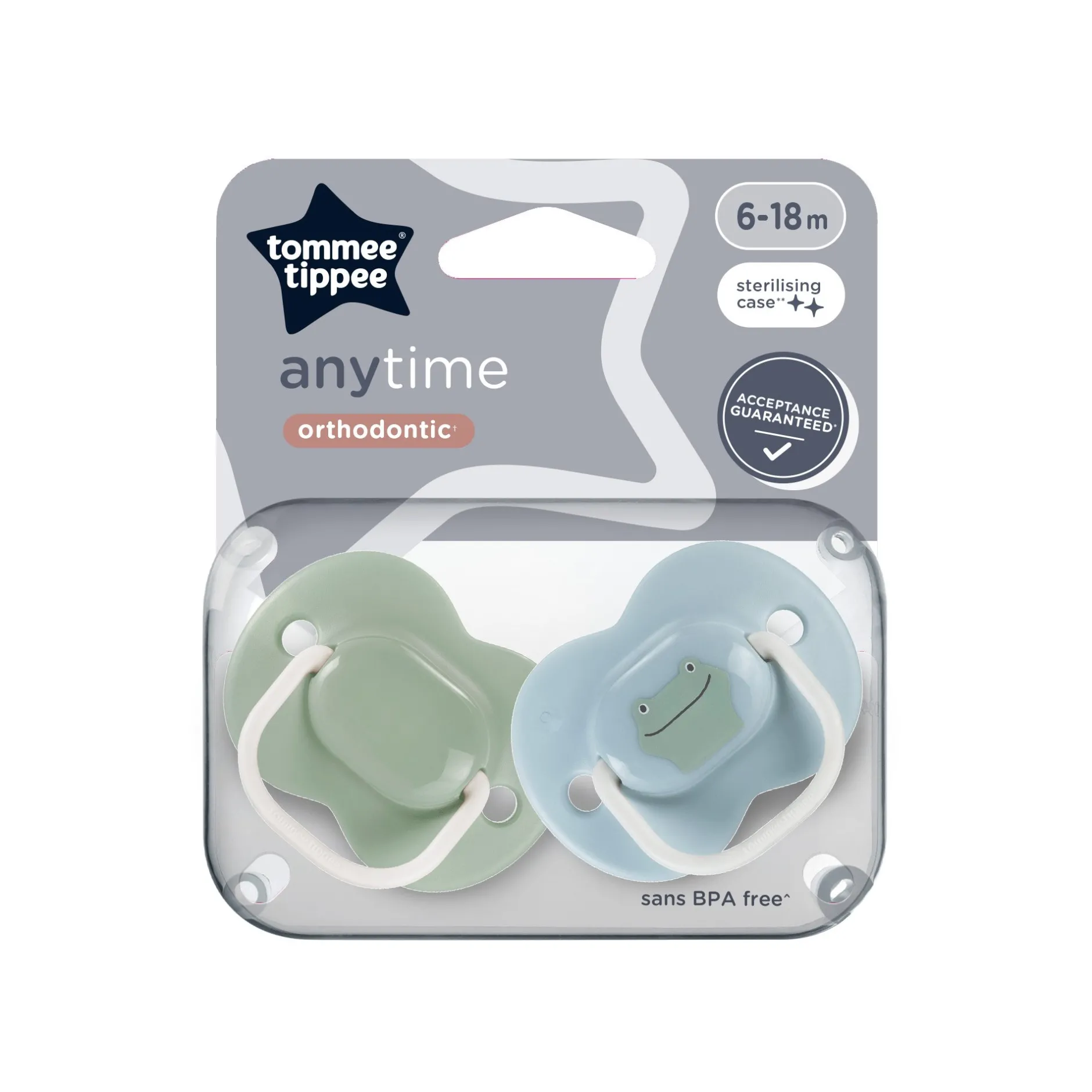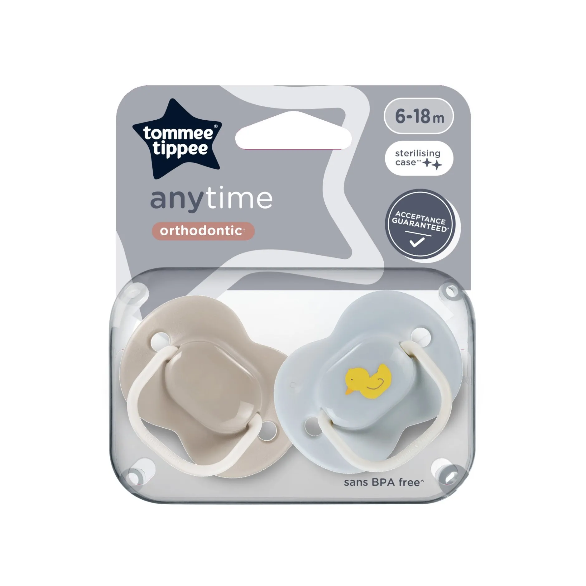 - Forme orthodontique symétrique* : la sucette Anytime de Tommee Tippee a une tétine en silicone de forme symétrique qui se place dans n’importe quel sens et reste toujours bien positionnée dans la bouche