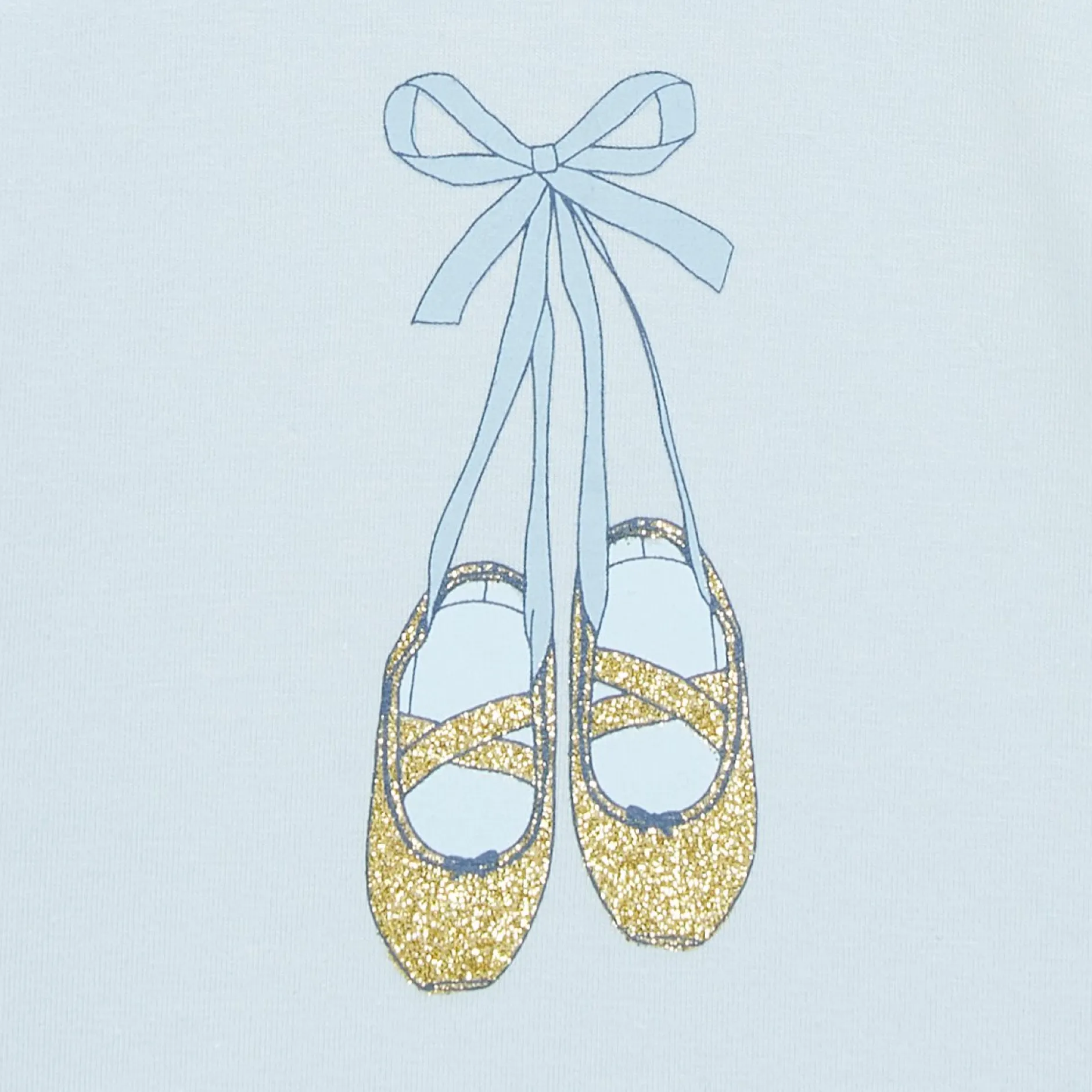 Superbe animation devant avec son impression représentant des chaussons de danse en encre paillettes dorées pour briller de mille feux. Encolure ronde. Ouverture au dos par petites pressions.
