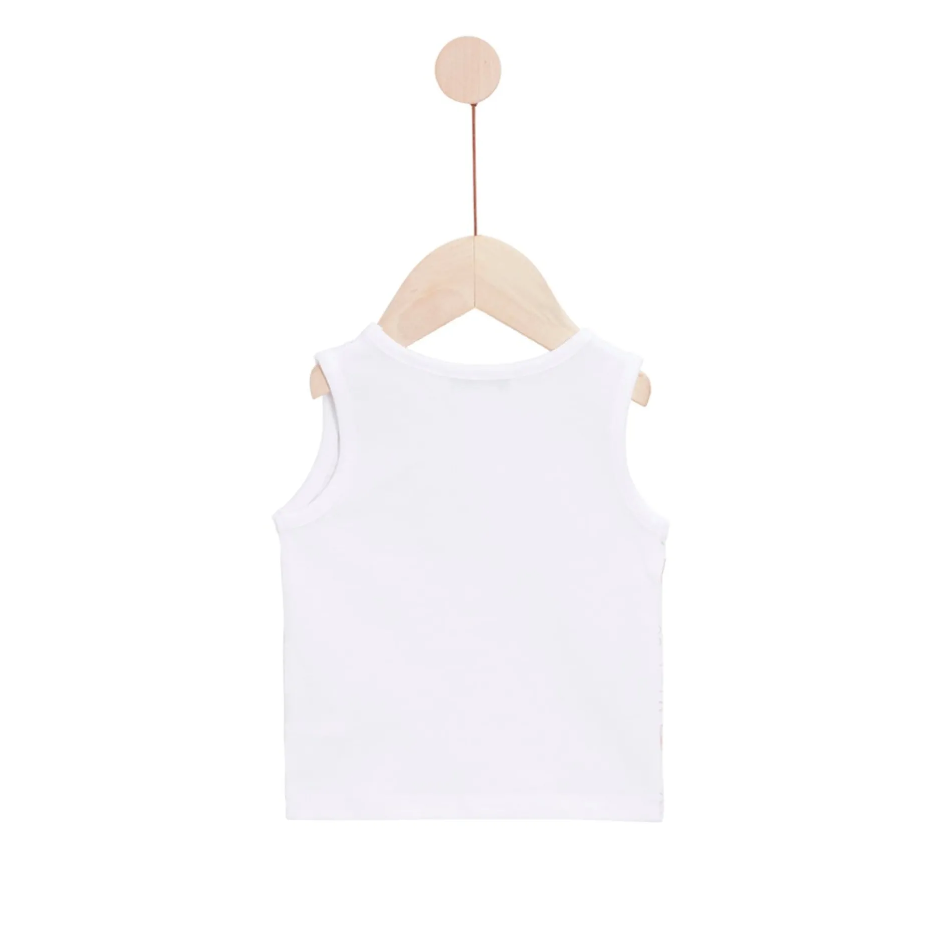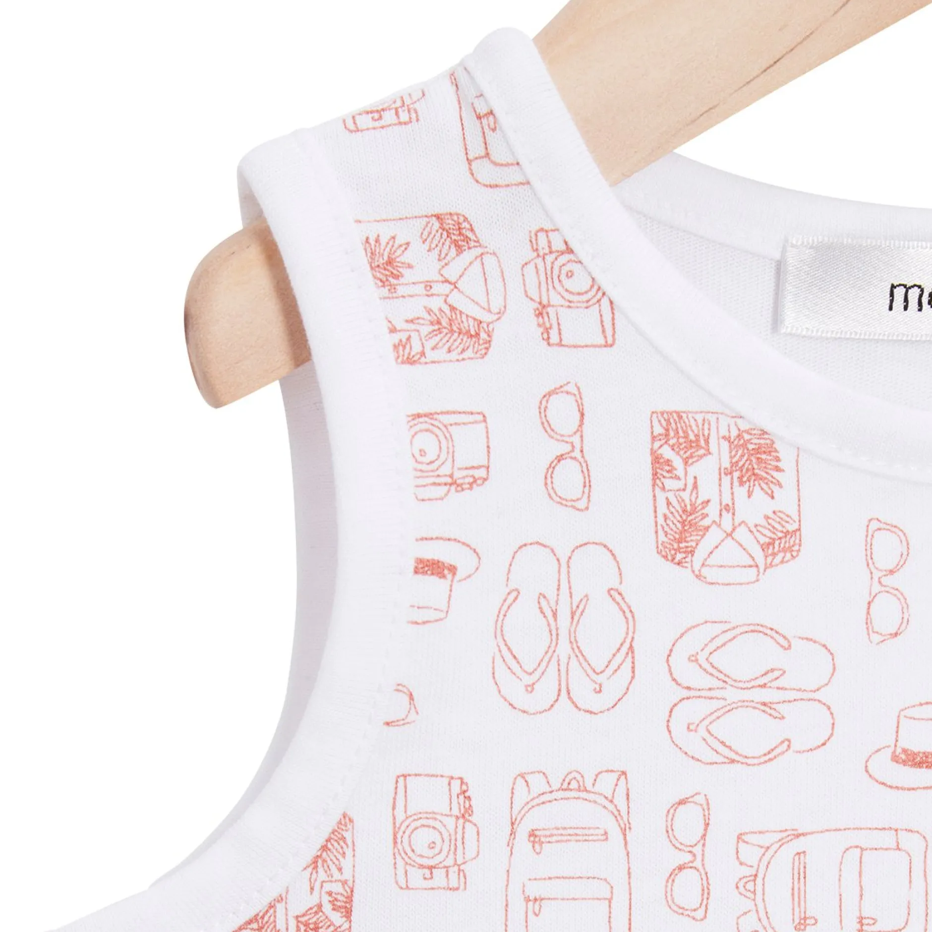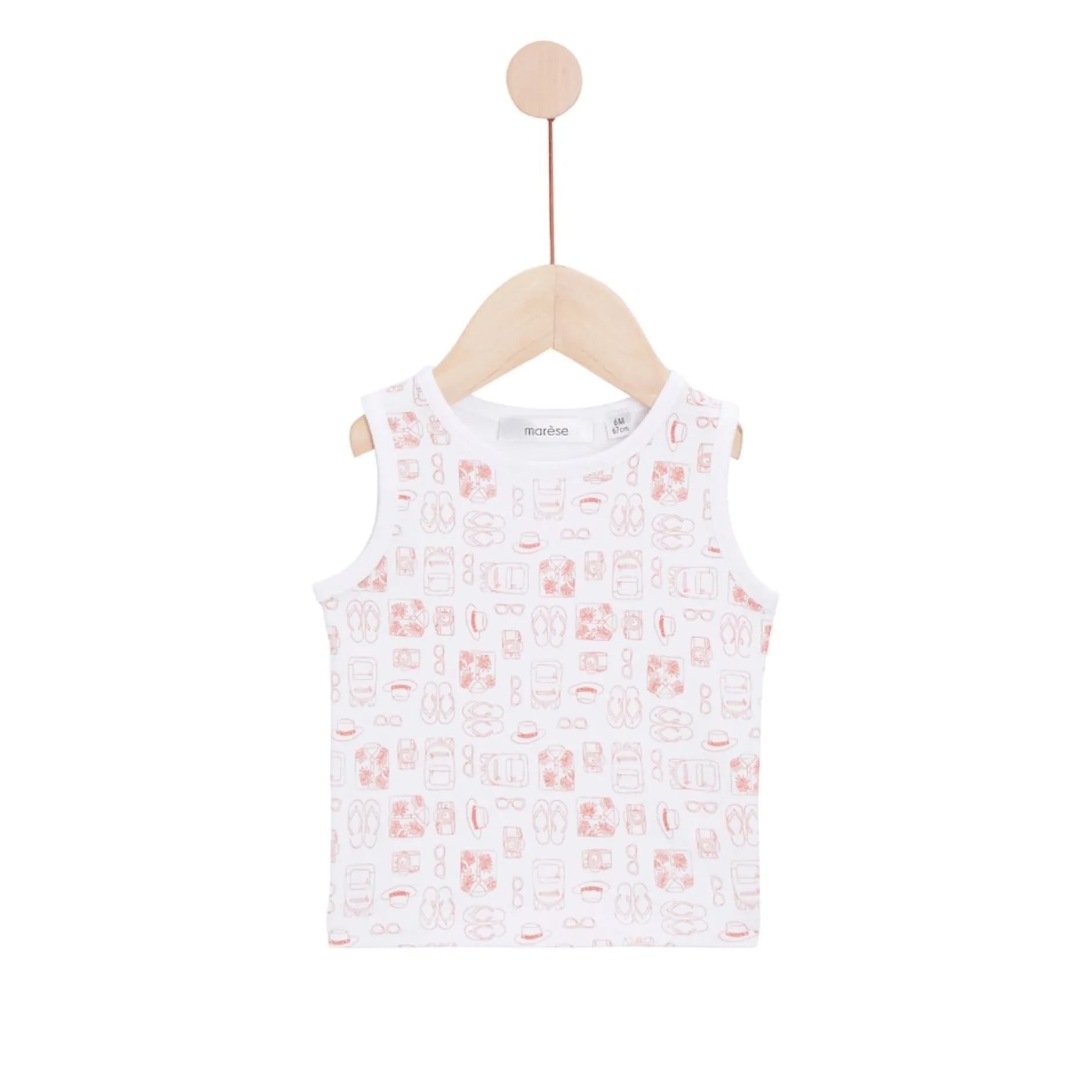 Un lot de tee-shirts malicieusement assorti pour varier les styles et composer facilement leurs looks. Ils ont un look très moderne et graphique avec sa partie imprimée sur le débardeur avec les motifs de chapeaux et de valises, de tongs etc… comme une invitation au voyage.