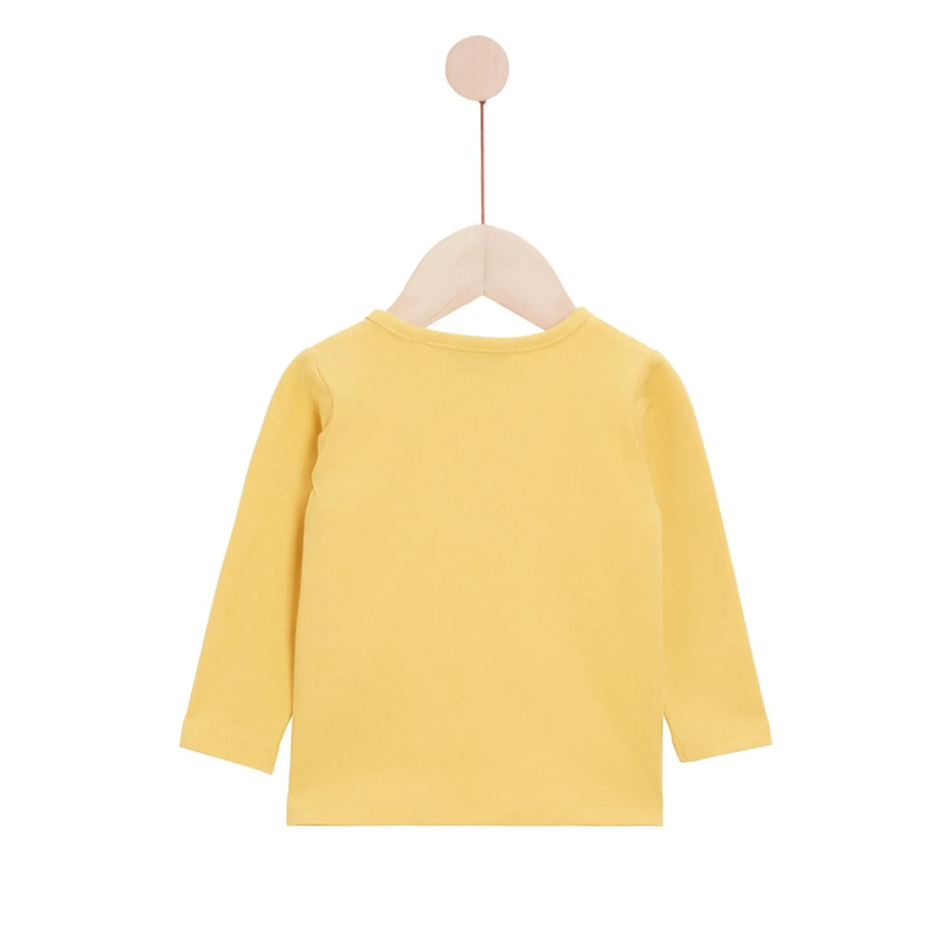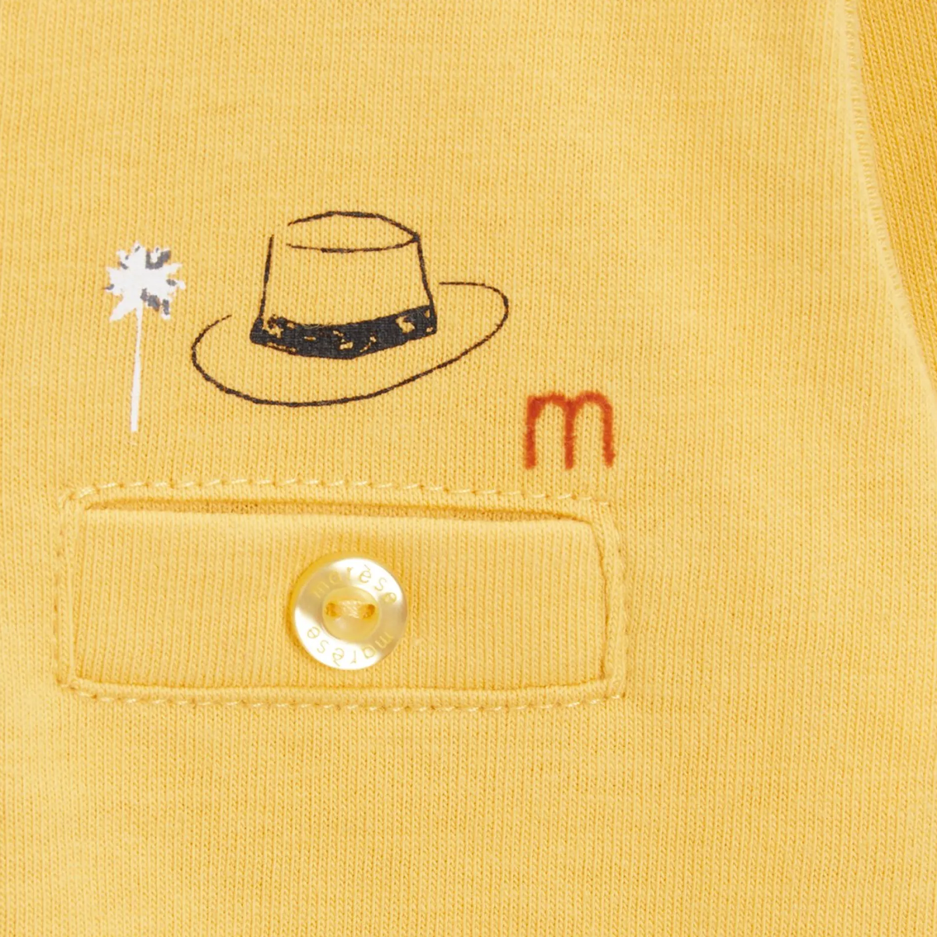 Le tee shirt manches uni jaune a une encolure tunisienne avec sa patte ouverte devant et ses petits boutons gravés ton sur ton. Petite poche passe poilée sur la poitrine avec une impression estivale représentant un chapeau et un palmier ainsi que le « m » du logo de la marque. Une pièce à la fois transversale qui va avec tous les bas du thème et à la fois très stylée qui va ravir les petits garçons et leurs parents. Lavage conseillé à 30°C.