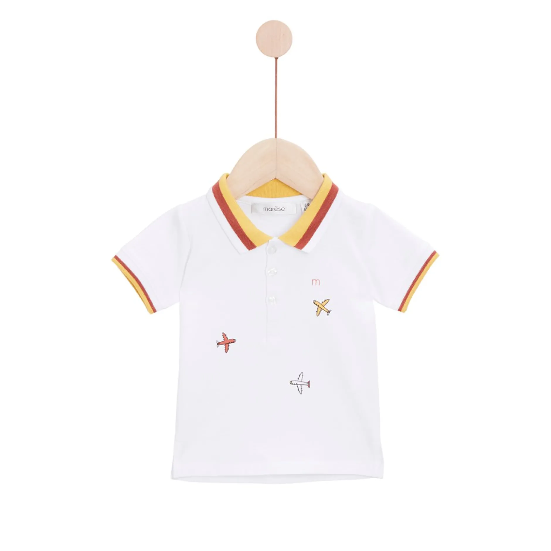 Découvrez le Polo manches courtes Marèse en Jersey blanc. Ce polo a un col en bord côte tricoté bicolore : blanc, cannelle et safran , que nous retrouvons en bas de manches également pour un côté très chic. Ouverture par patte polo devant avec des boutons en ton sur ton, gravés au nom de la marque. Jolies motifs d’avions sur le devant du petit haut qui done un petit coté sport chic au look. Une pièce stylée et tendance qui va ravir les petits garçons et leurs parents.