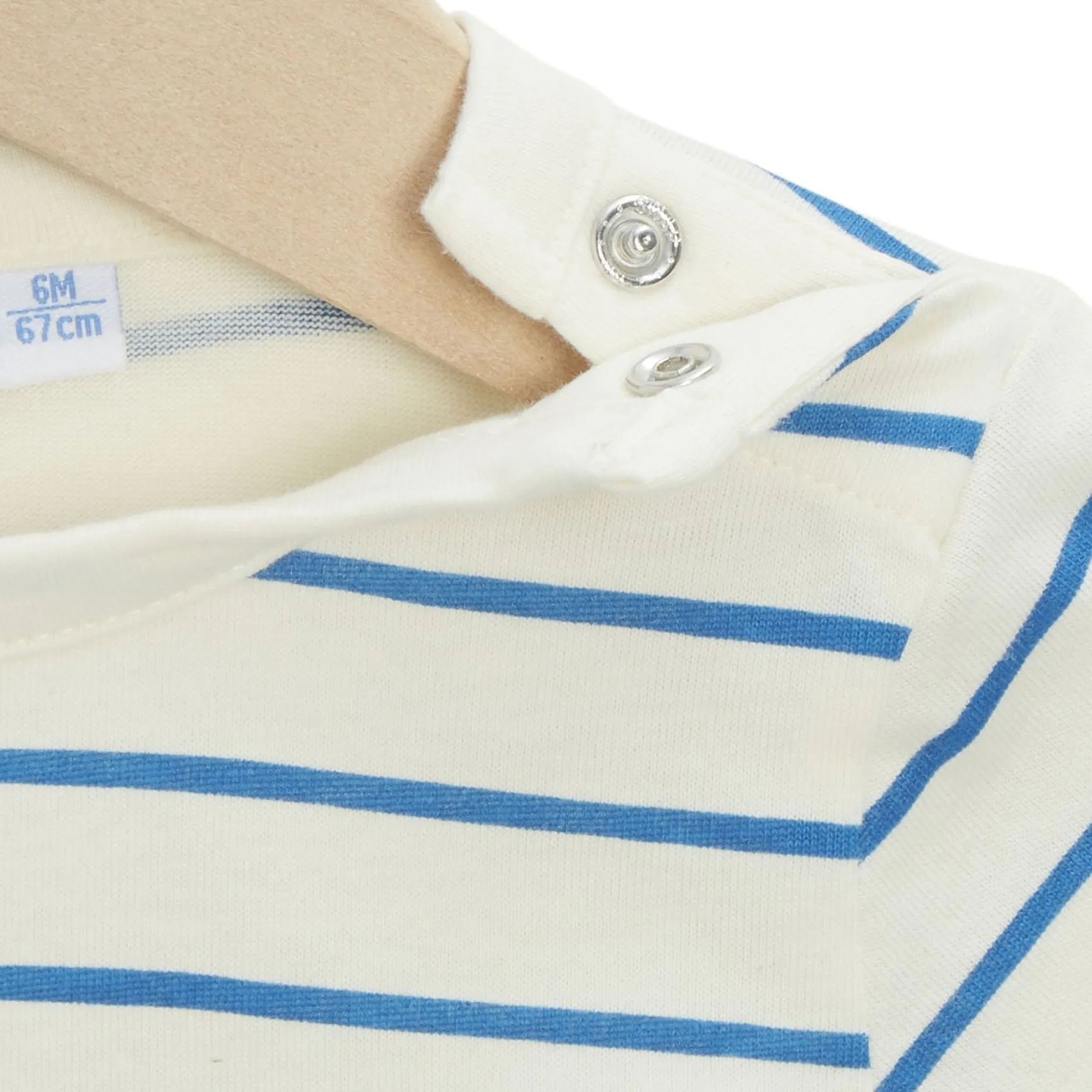 En voici une belle marinière à manches courtes pour cet été ! Votre enfant pourra la porter facilement avec un short, un pantalon ou même une salopette. L’effet est garanti ! Des boutons situés sur l’épaule facilitent le change de votre enfant. Bref, on adore ce tee-shirt pour bébé !