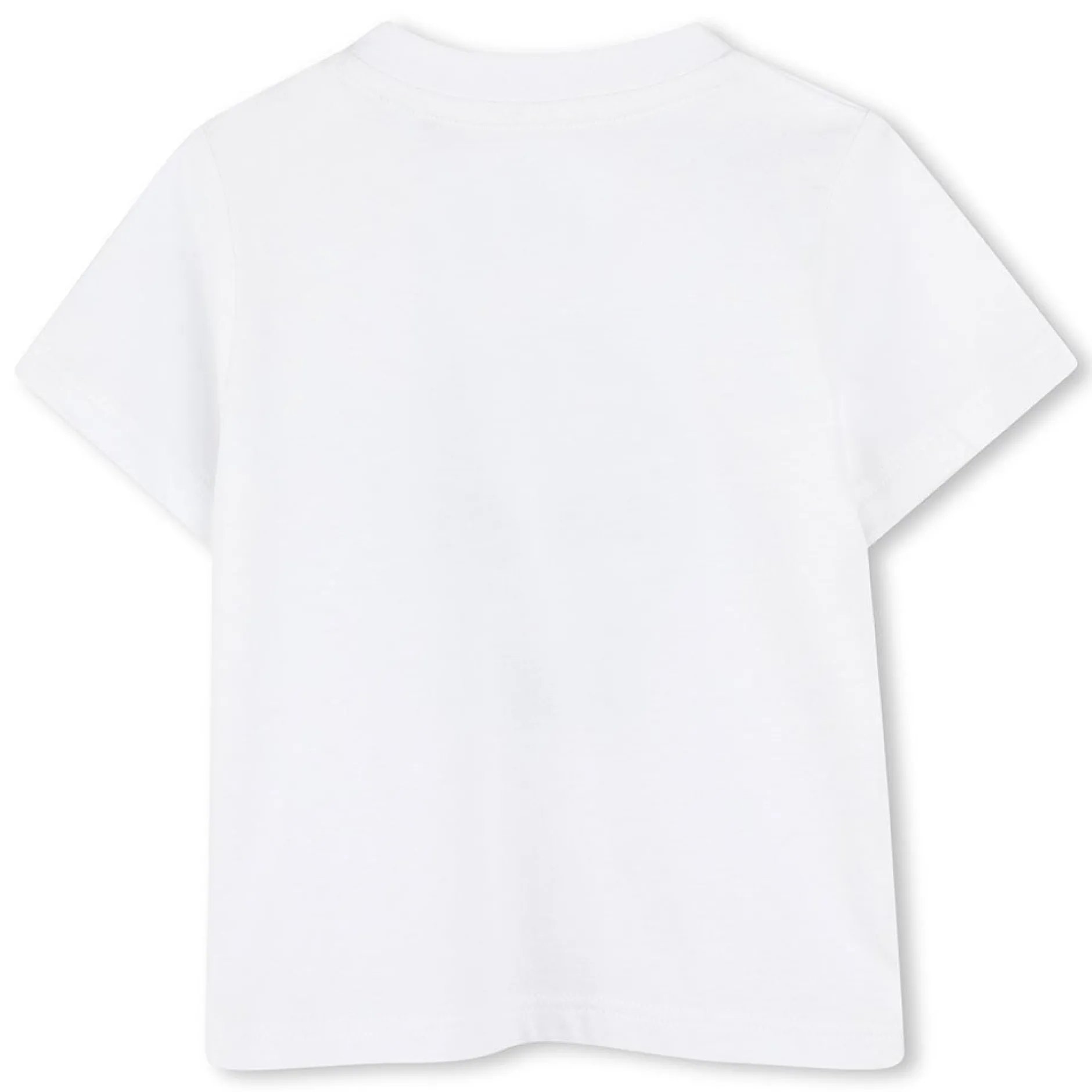 Tee-shirt manches courtes en jersey 100% coton issu de l’agriculture biologique, fermeture pressionnée à l’épaule, logo imprimé sur le devant.