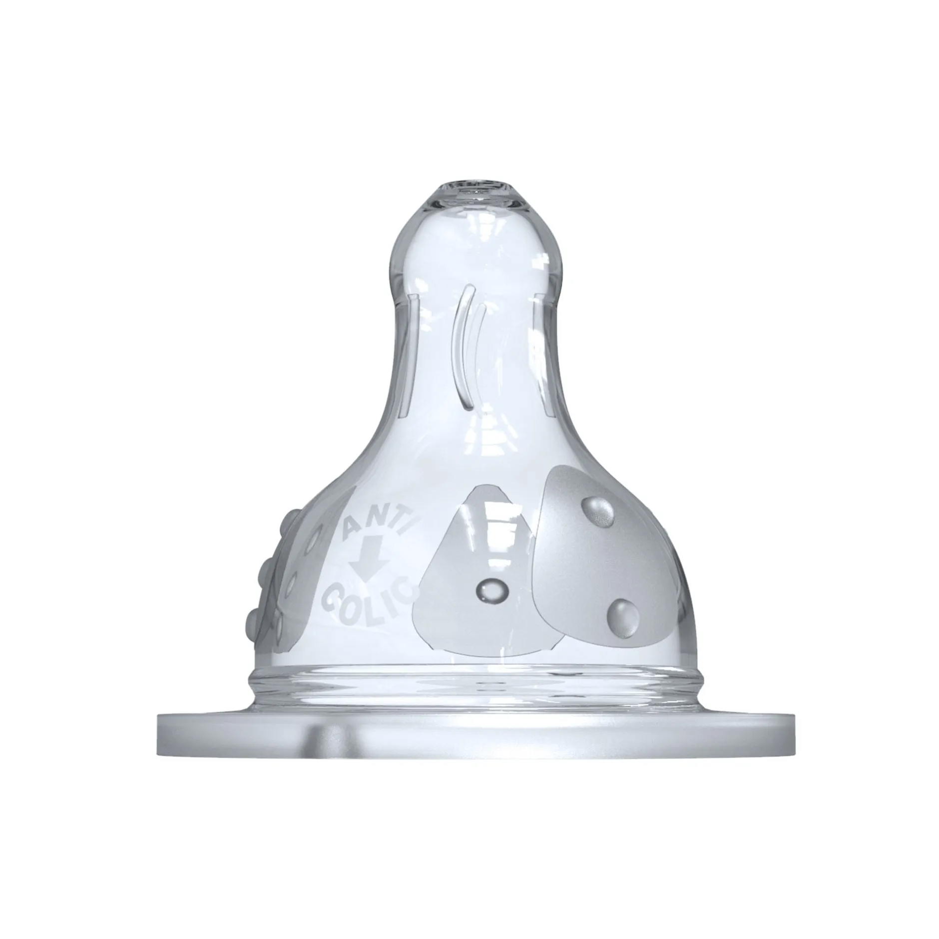 Le système anti-colique est intégré aux tétines Initiation+ grâce à une double valve brevetée, qui favorise la circulation de l’air et réduit les risques de coliques, d’aérophagie et de régurgitations.