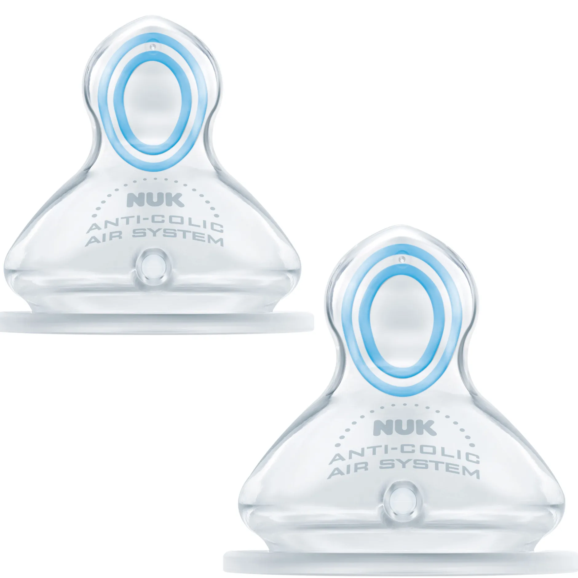Issues de la recherche NUK, les tétines NUK FIRST CHOICE Air System existent en 2 tailles pour s’adapter à l’évolution de la cavité buccale de bébé. Elles sont proposées en latex ou en silicone et avec 3 perçages différents : S (lait maternel / eau), M (lait infantile), L (lait épaissi / liquides épais).