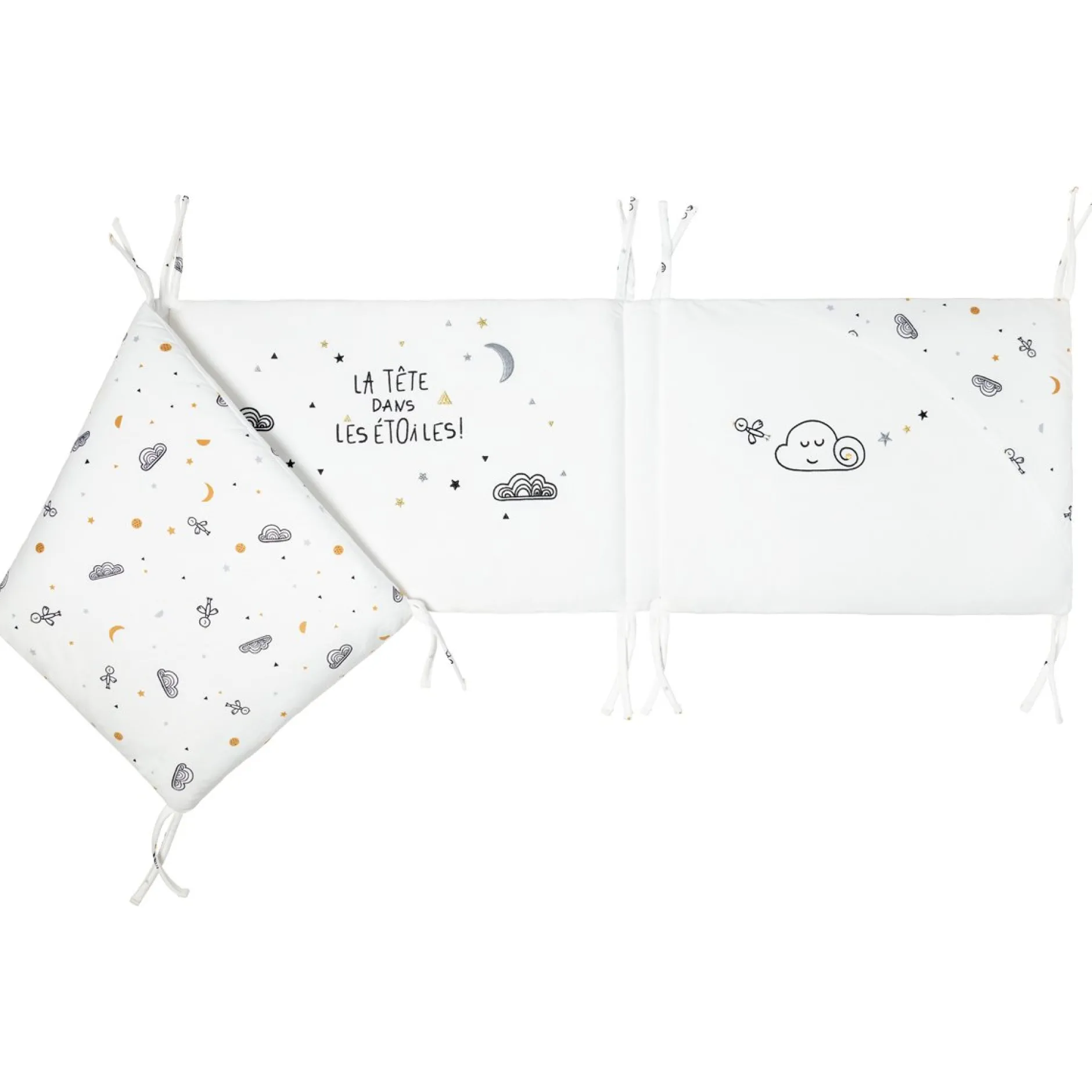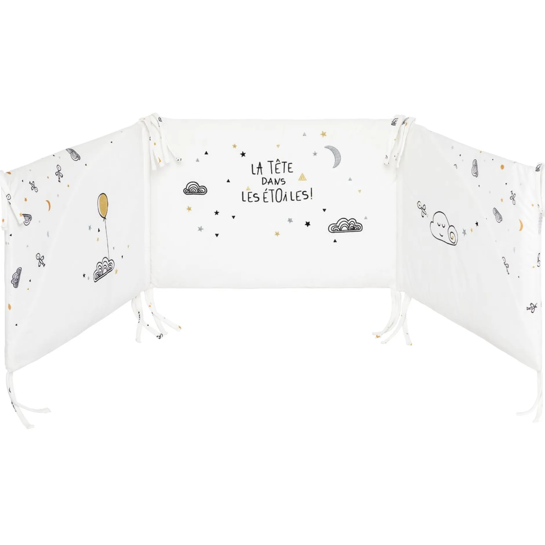 Tour de lit adaptable avec fixations par des lacets aux barreaux du lit de bébé.