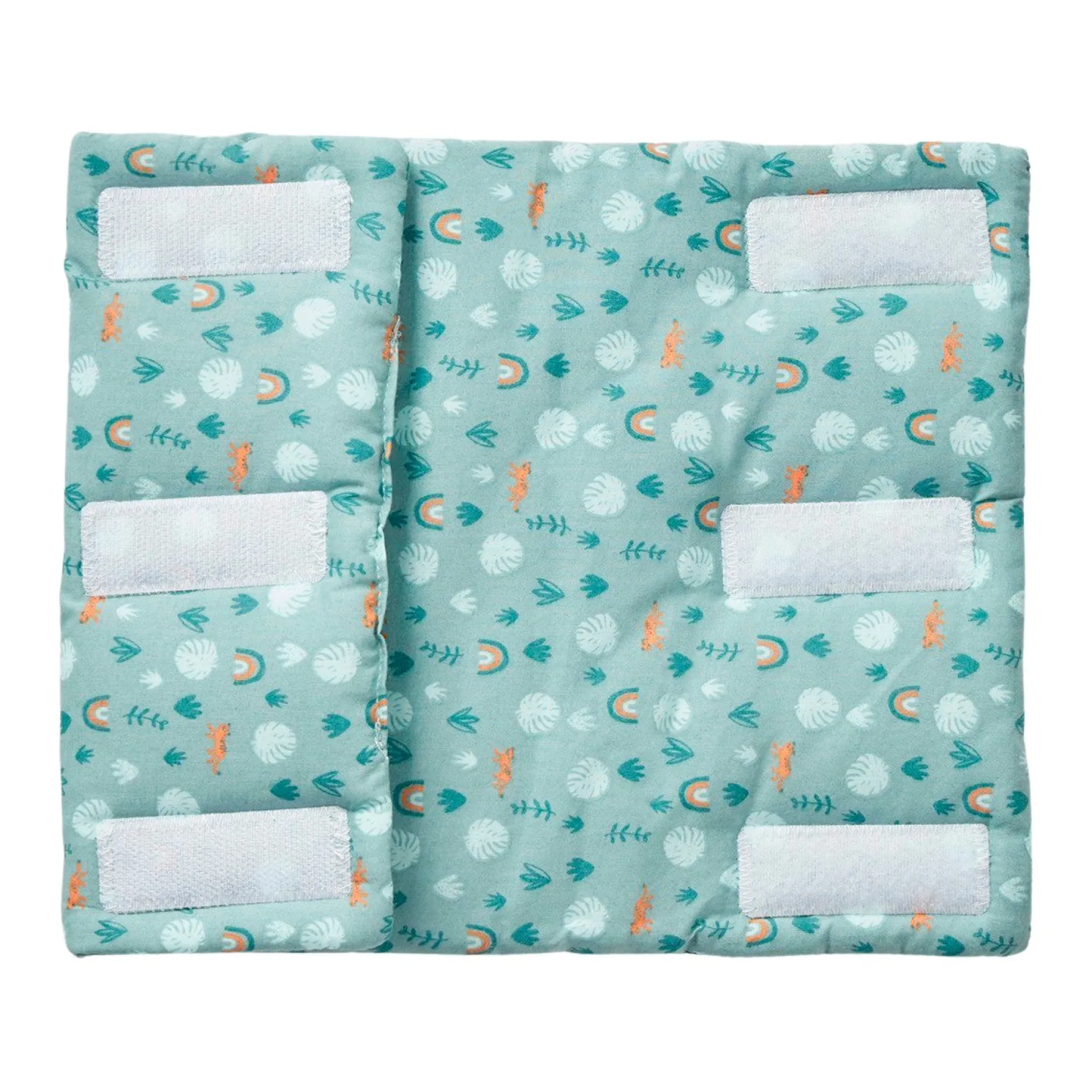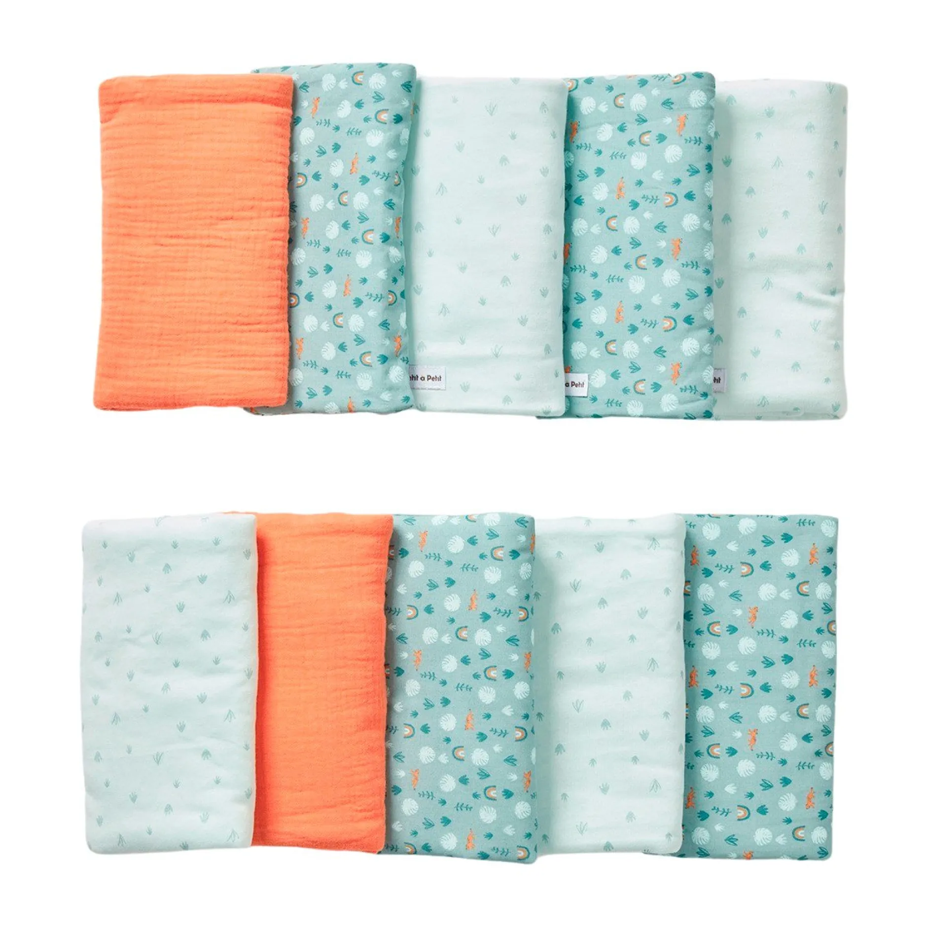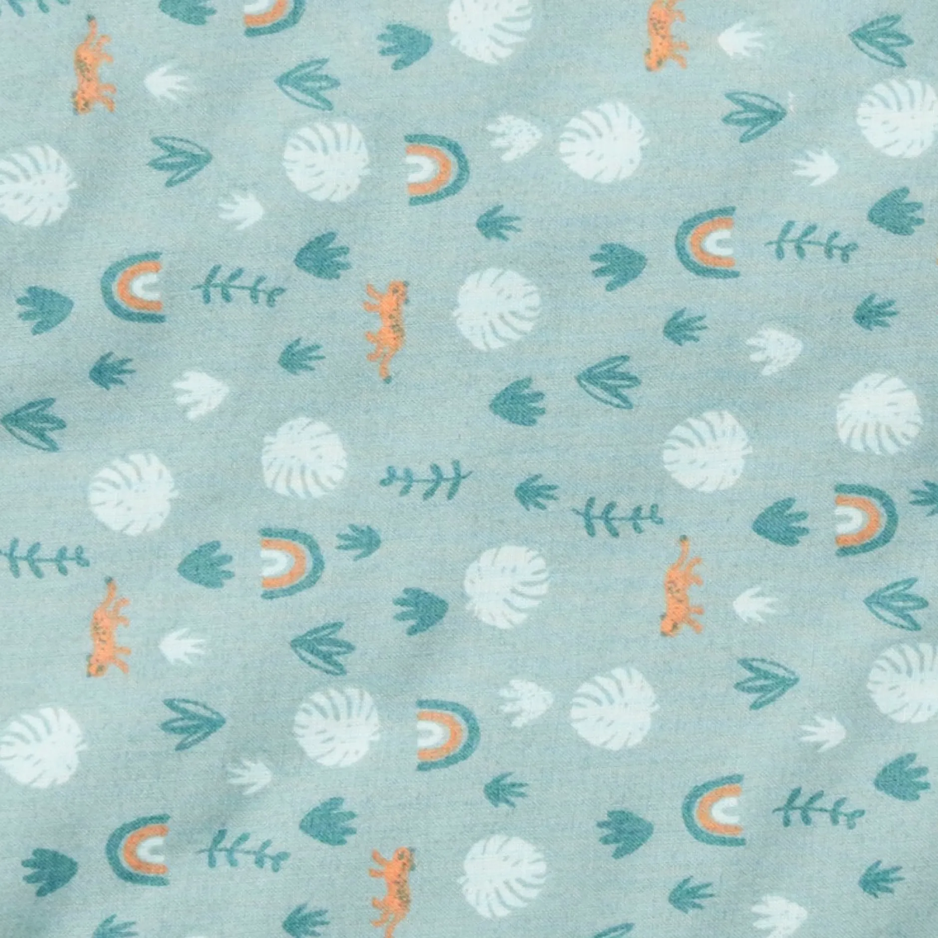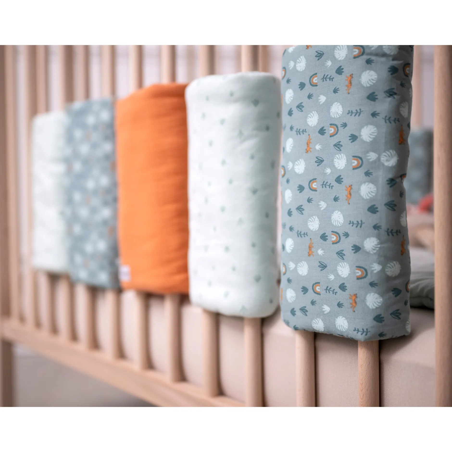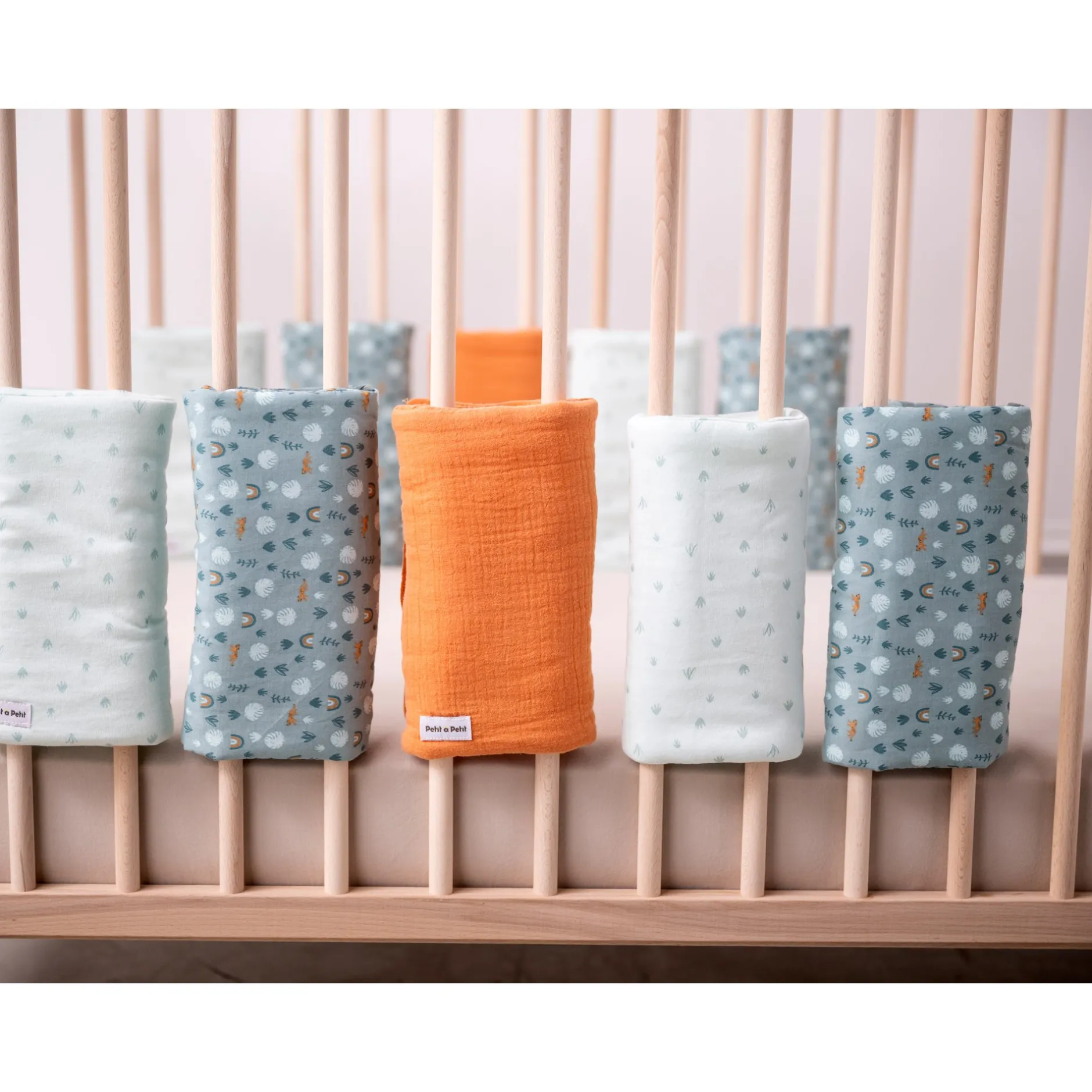 Tour de lit Petit à petit composé de 10 protège barreaux individuels ou enveloppant 2 barreaux. En forme de rectangles , le set est composé de 2 produits en mousseline de gaze unis en coloris orange paprika et 4 en voile imprimé jungle avec le petite léopard sur fond vert et 4 en imprimé végétation sur fond vert d’eau. Tous sont ouatinés pour plus de douceur et ont des velcros pour un bon maintien aux barreaux. Ces tours de lit permet de protéger bébé des barreaux du lit et de lui offrir un petit cocon.