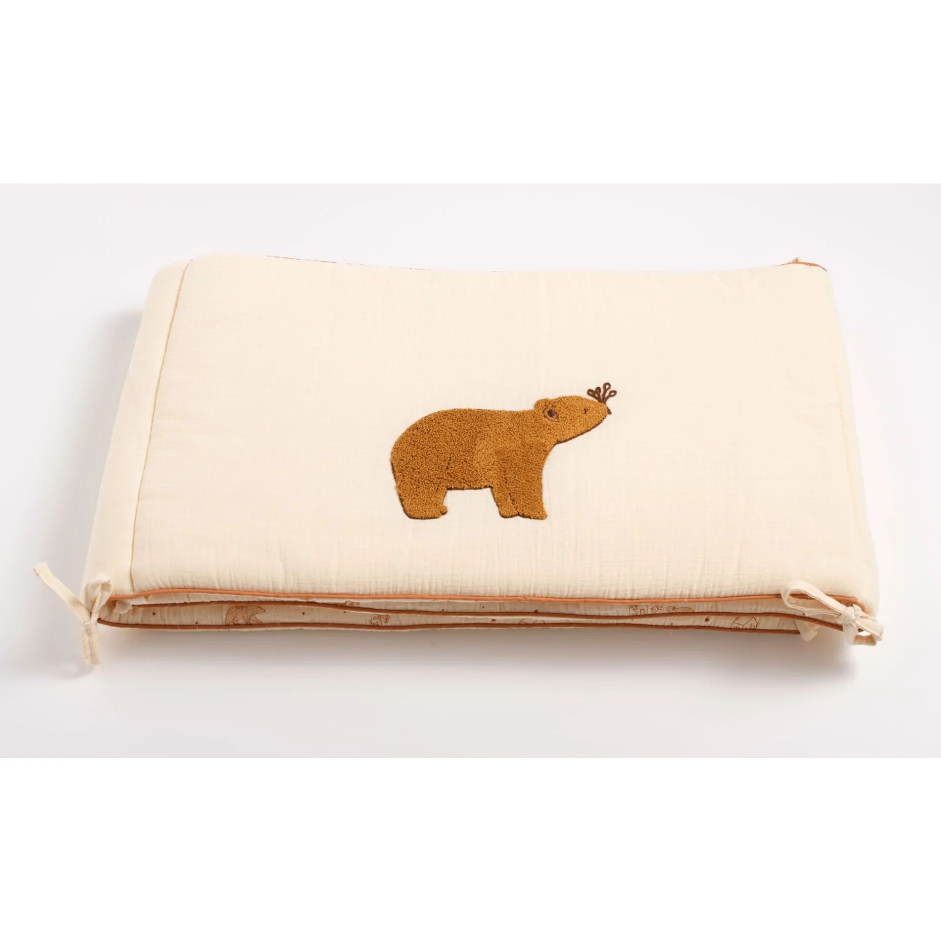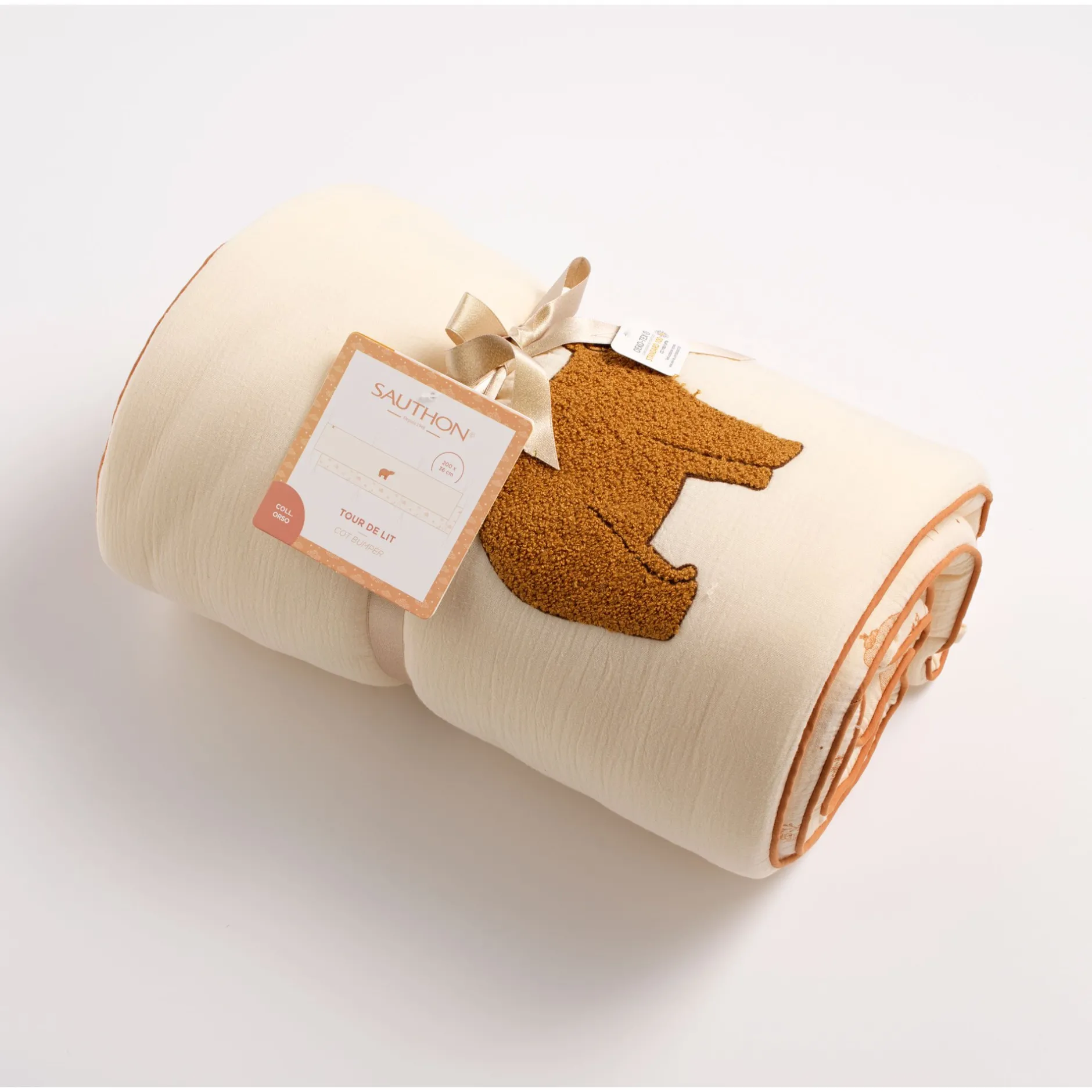 Ce tour de lit reversible en double gaze de coton de la collection Orsino, s’adapte au lit 120x60cm ou 140x70cm. Chaleureux et tendres, les motifs du thème Orsino apportent un style naturel et raffiné au lit de bébé. Ses couleurs enveloppantes toutes en ton sur ton apporteront une touche de décoration à la chambre de votre enfant. Très douillet il évitera à l’enfant de se cogner contre les barreaux du lit.
