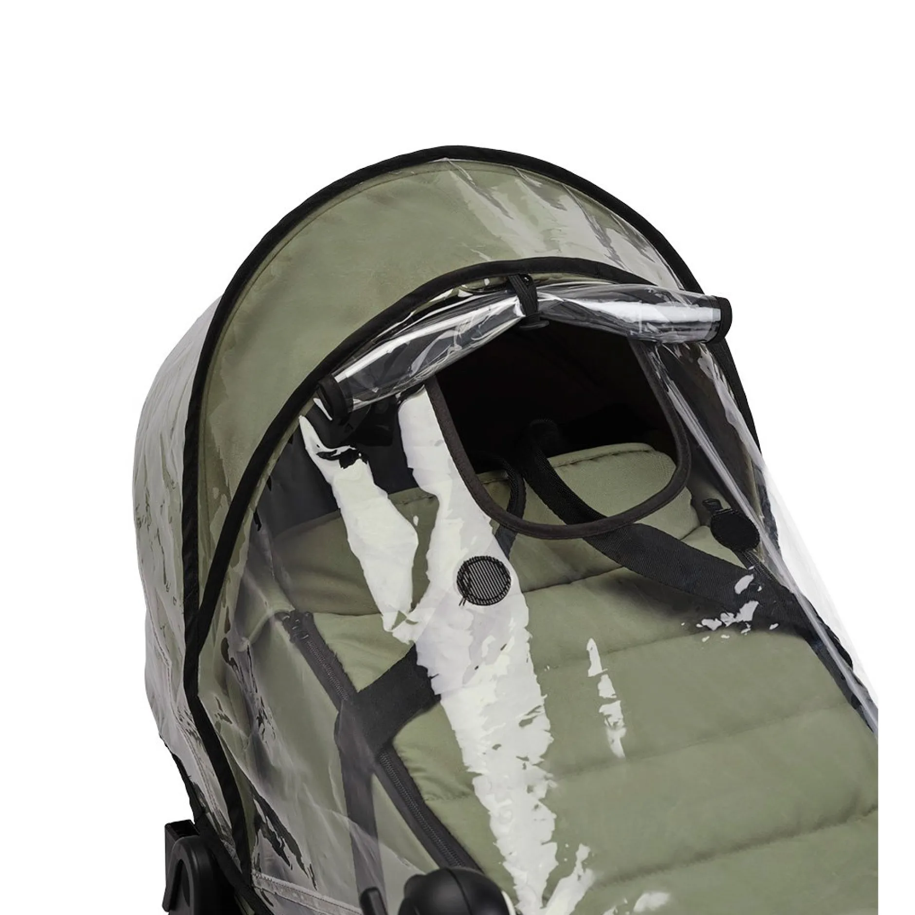 En version nacelle, une ouverture à velcro permet d’attraper les poignées sans retirer la protection pluie. Les velcro correctement positionnés permettent une aération pour bébé.