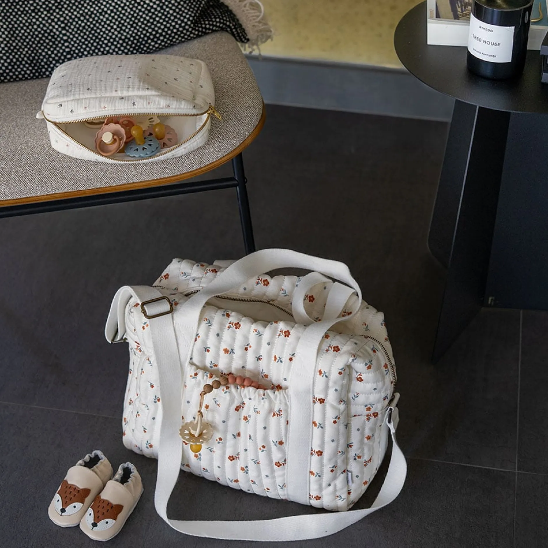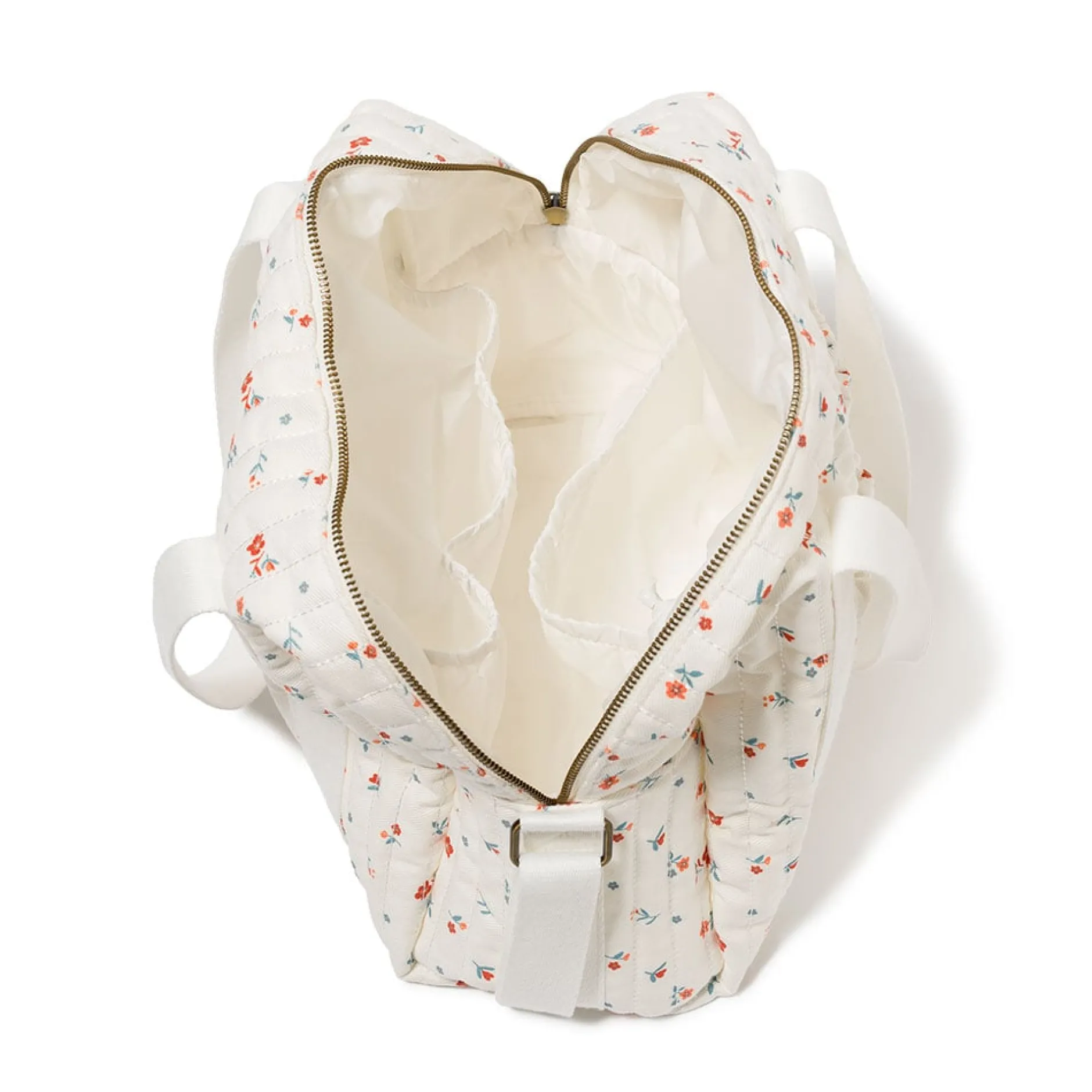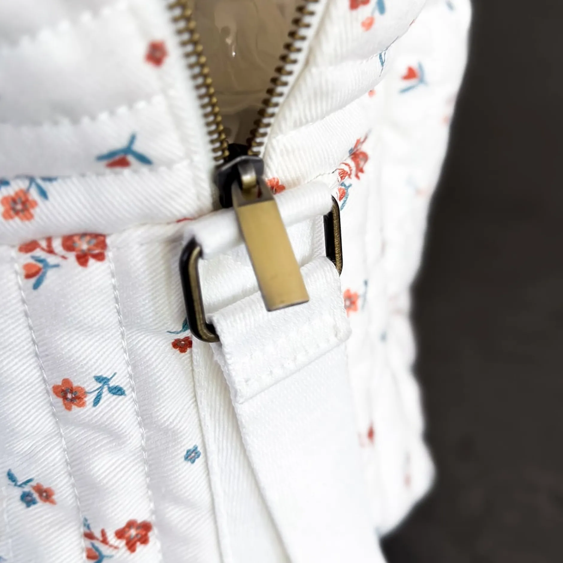 Sac à langer MAIKA en twill matelassé et ouatiné avec un imprimé romantique sur fond écru avec des fleurs bleues. Il a 2 petites anses en tresse de canvas écrue pour un porter main avec des boucles réglables en métal et 1 grande anse en tresse pour un porter épaule. Il offre une pochette élastiquée à l’extérieur pour mettre des produits. Il a aussi des grandes poches à l’intérieur pour ranger les produits (lait, biberon, couches etc…).