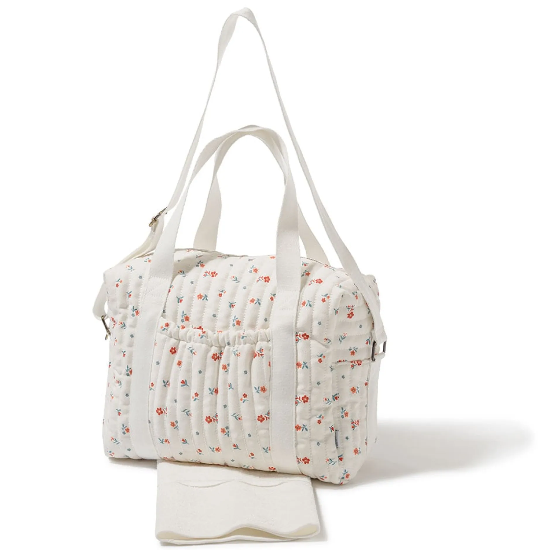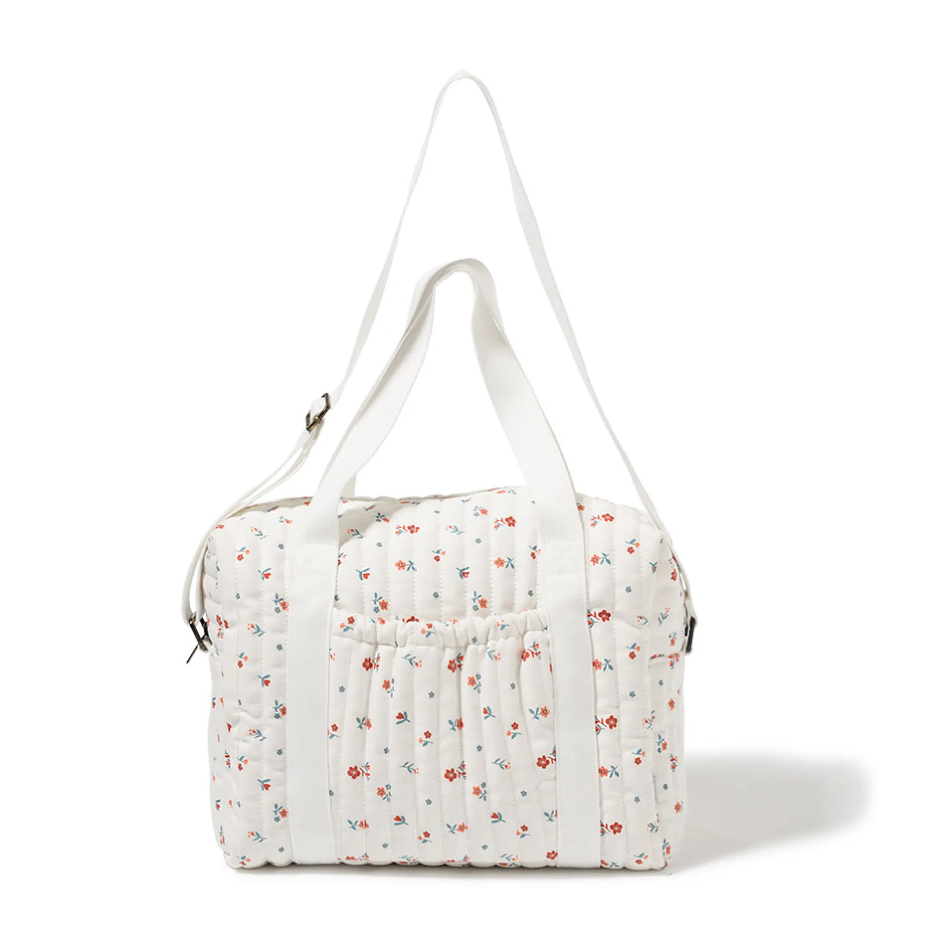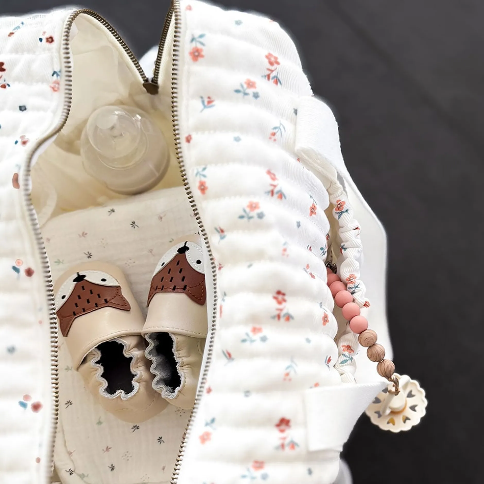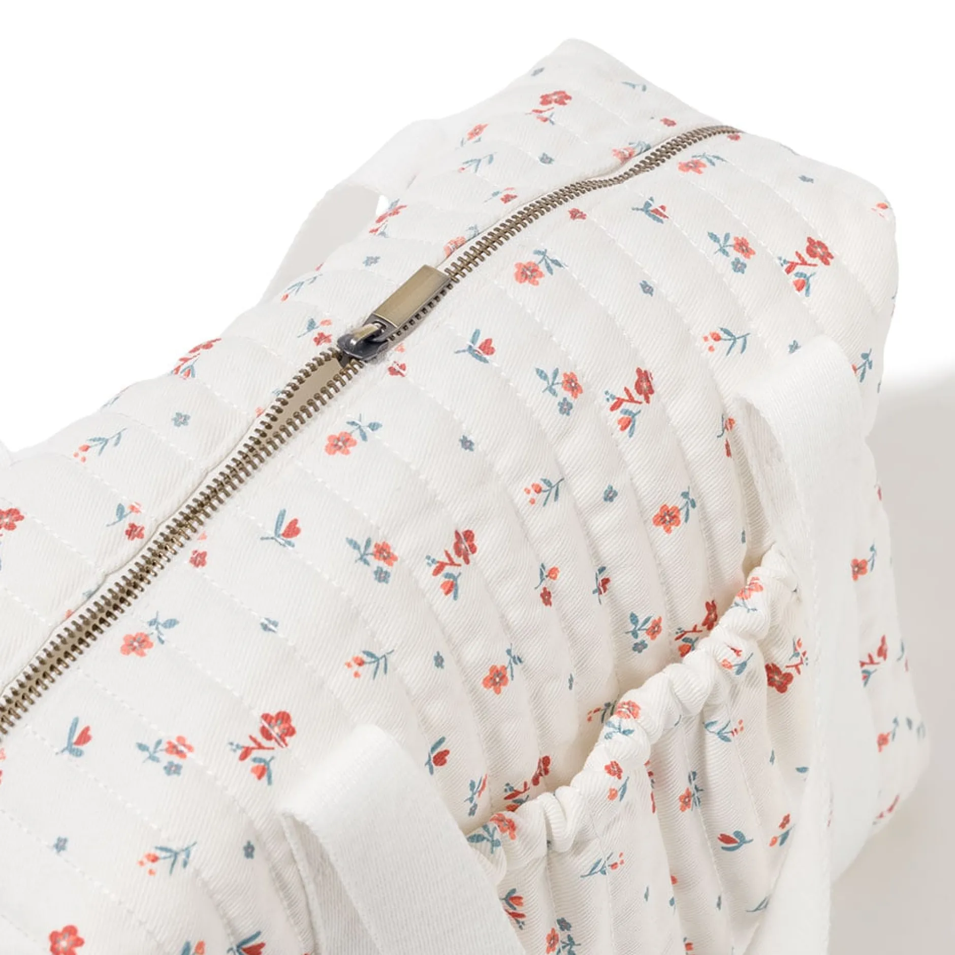 Sac à langer MAIKA en twill matelassé et ouatiné avec un imprimé romantique sur fond écru avec des fleurs bleues. Il a 2 petites anses en tresse de canvas écrue pour un porter main avec des boucles réglables en métal et 1 grande anse en tresse pour un porter épaule. Il offre une pochette élastiquée à l’extérieur pour mettre des produits. Il a aussi des grandes poches à l’intérieur pour ranger les produits (lait, biberon, couches etc…).