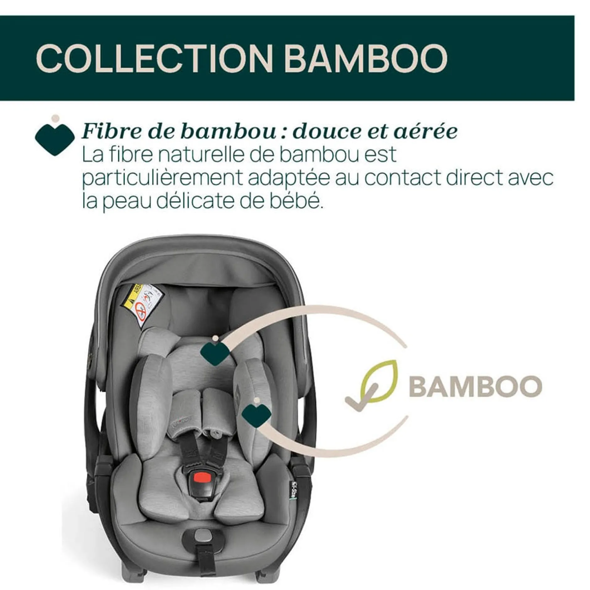 Fibre de bambou, douce et aérée : têtière et réducteur recouverts de fibre de bambou : grâce à sa douceur, la fibre de bambou naturelle est particulièrement adaptée au contact direct avec la peau délicate du bébé. Elle est également respirante et a une bonne capacité à absorber et à dissiper rapidement l’humidité, ce qui contribue à réguler la température du corps de bébé.