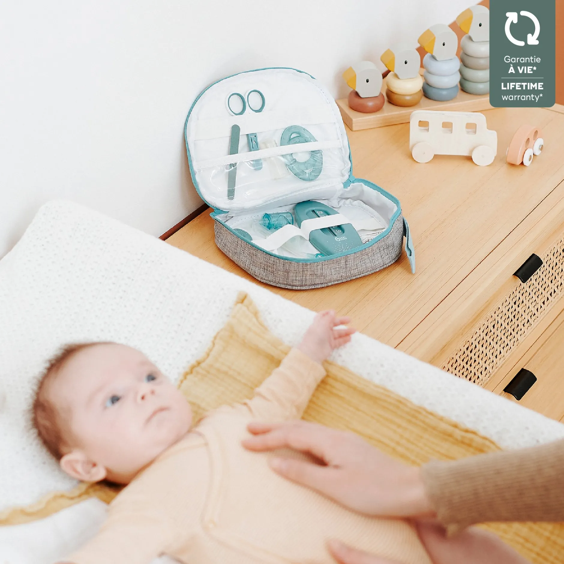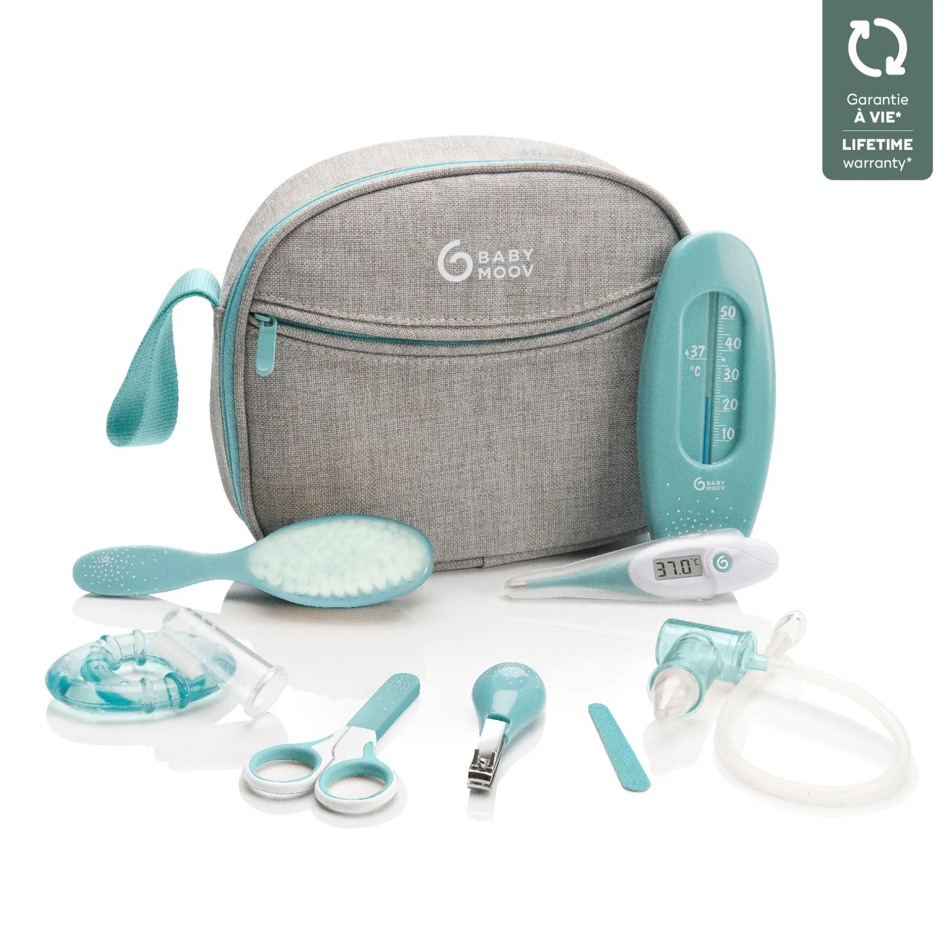- 9 accessoires essentiels pour prendre soin de bébé : un thermomètre digital avec embout souple, un mouche bébé par aspiration buccale (avec réservoir anti-retour de sécrétions), une paire de ciseaux à bout arrondi, un coupe ongle, une lime à ongle, un thermomètre de bain, une brosse douce, un anneau de dentition réfrigérable et un masseur de gencives.