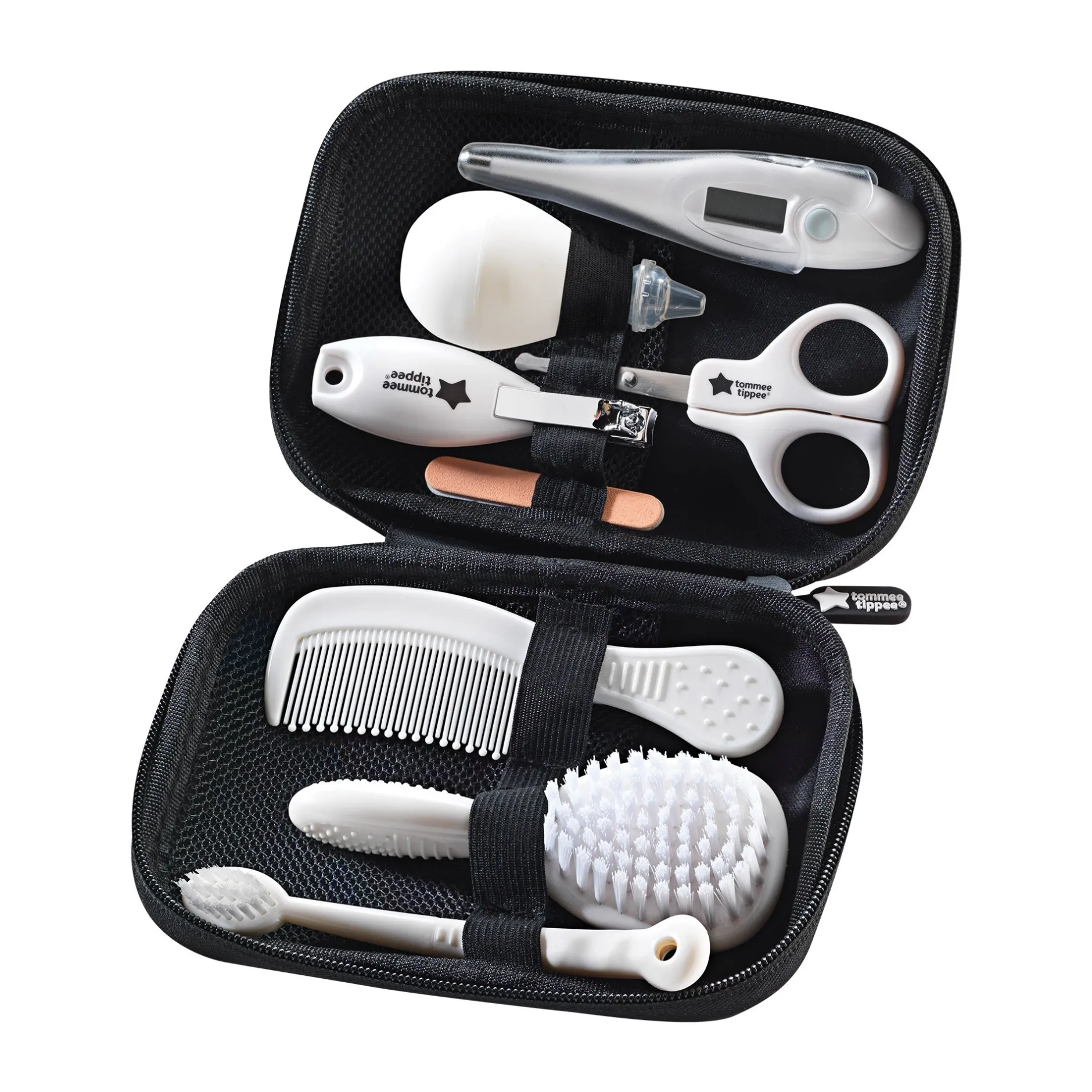 - Le kit contient 1 x thermomètre oral numérique*, 1 x brosse, 1 x peigne, 1 x paire de ciseaux, 1 x coupe-ongles, 2 x limes à ongles, 1 x brosse à dents, 1 x aspirateur nasal