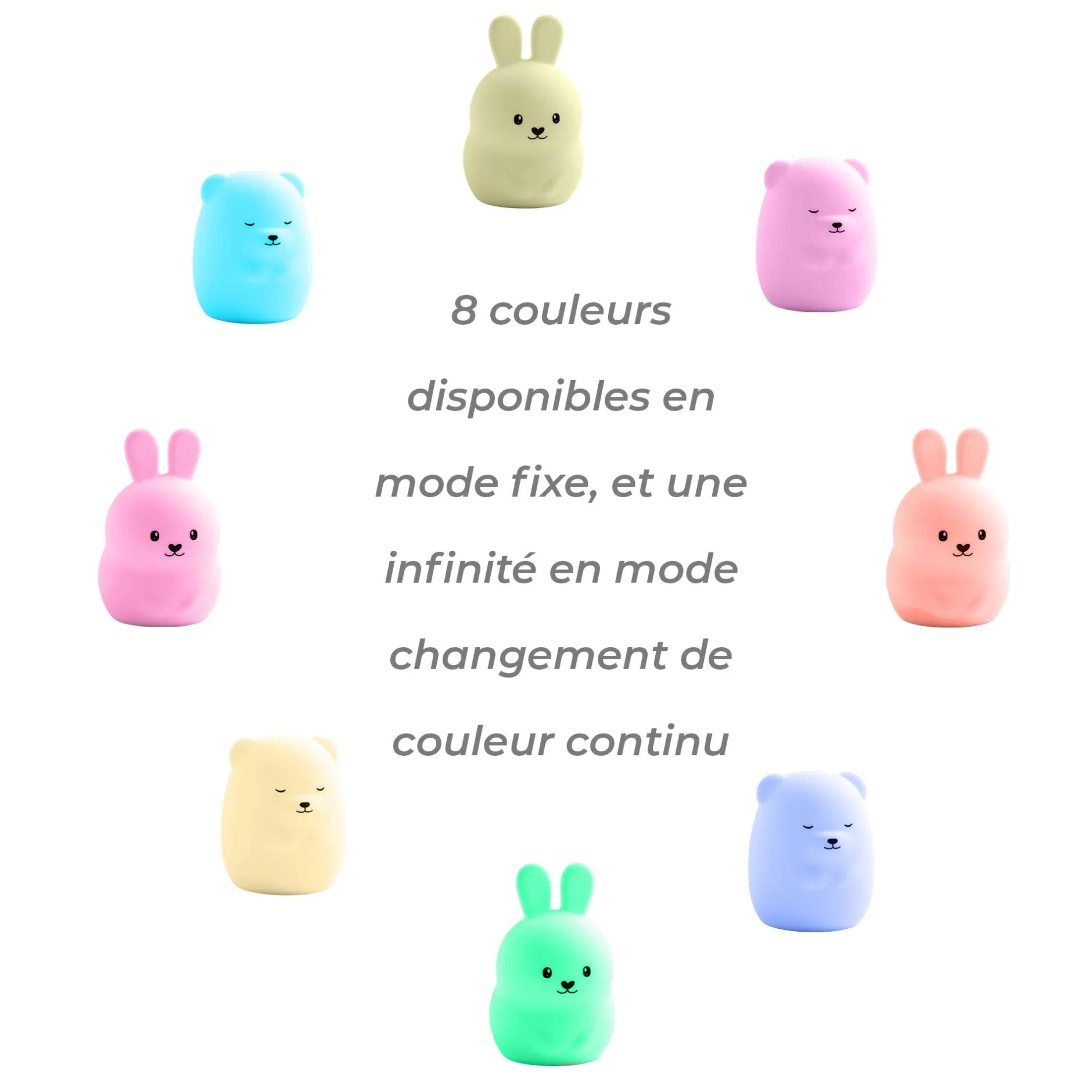 Ludique, le changement de mode s’effectue en tapotant la veilleuse, pour que l’enfant puisse lui-même fixer la couleur qu’il souhaite. Les veilleuses sont dotées d’une autonomie allant jusqu’à 22 heures d’utilisation, largement suffisant pour vous suivre dans toutes vos escapades !