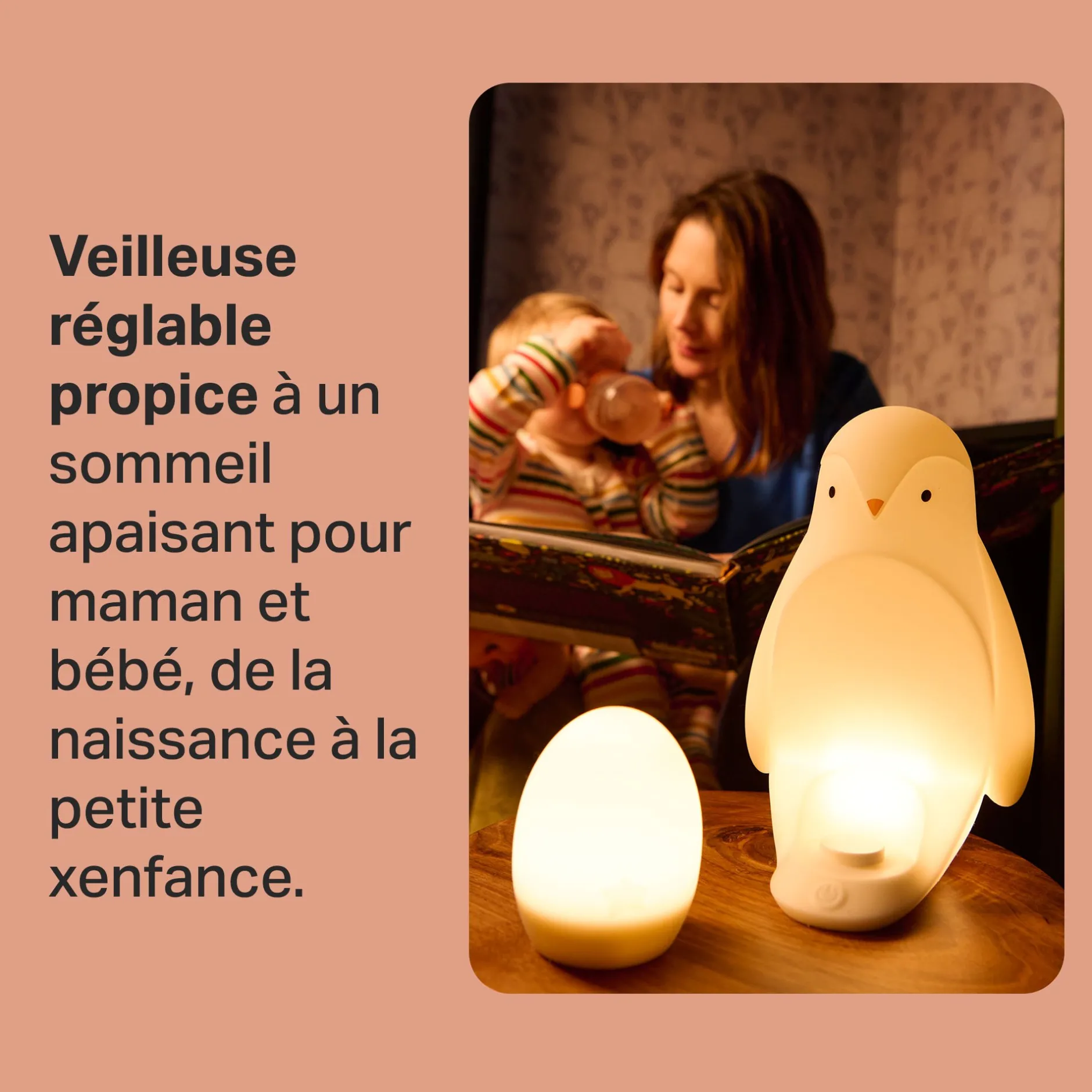 - Lampe œuf portable : vous pouvez utiliser cette veilleuse de nuit dès la naissance, et lorsque l’enfant sera grand, il pourra soulever cet œuf lumineux de sa base à pingouins pour l’utiliser comme veilleuse portable.