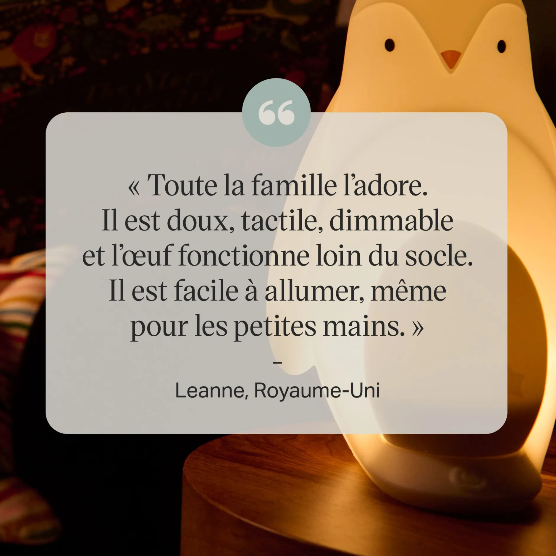 - Lampe œuf ultra douce : l’œuf en silicone est super léger et tactile, bref parfait pour être porté dans les petites mains pour les visites aux toilettes pendant la nuit.