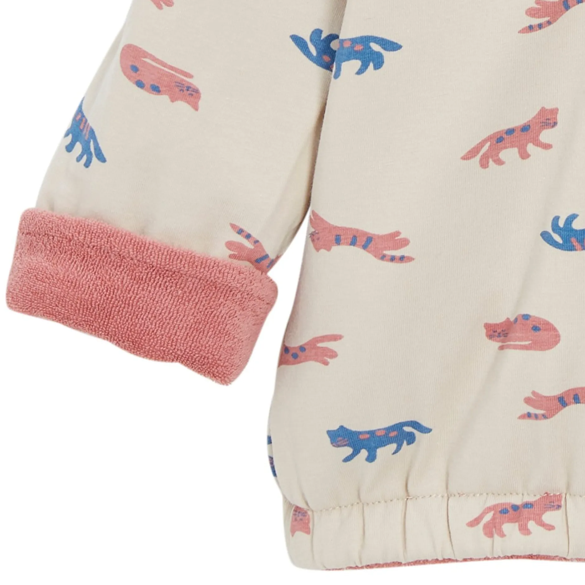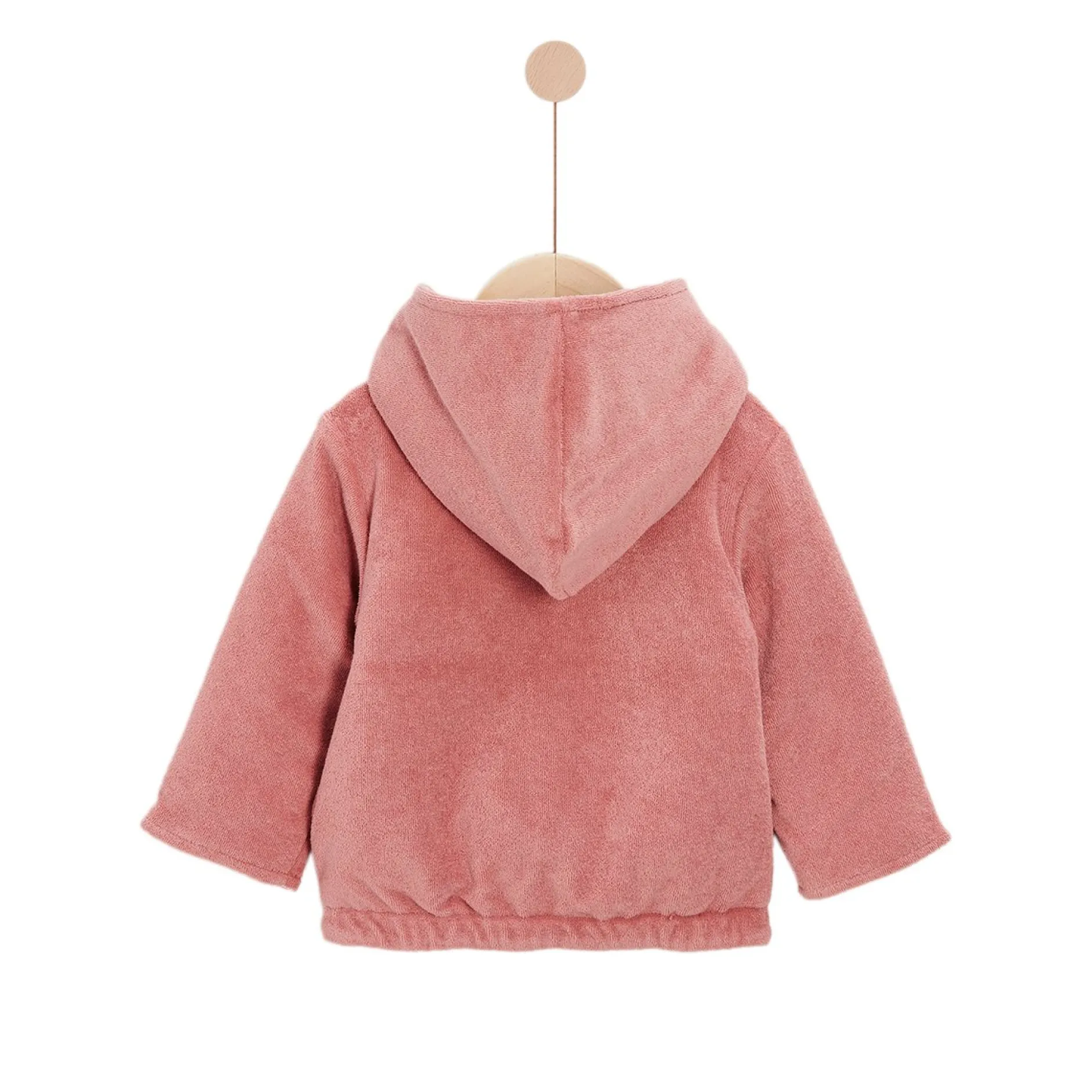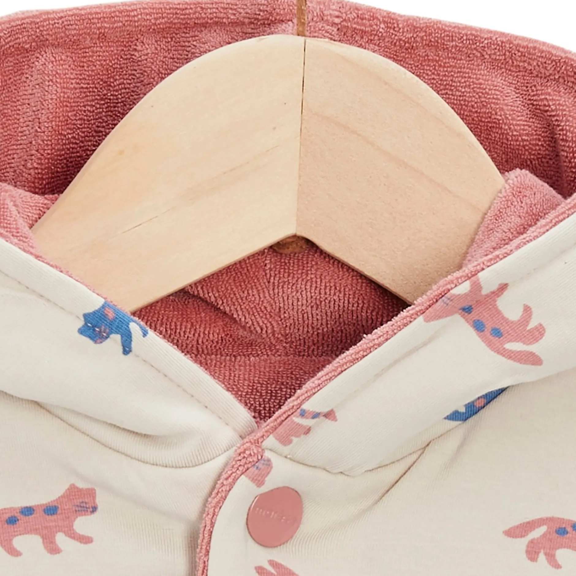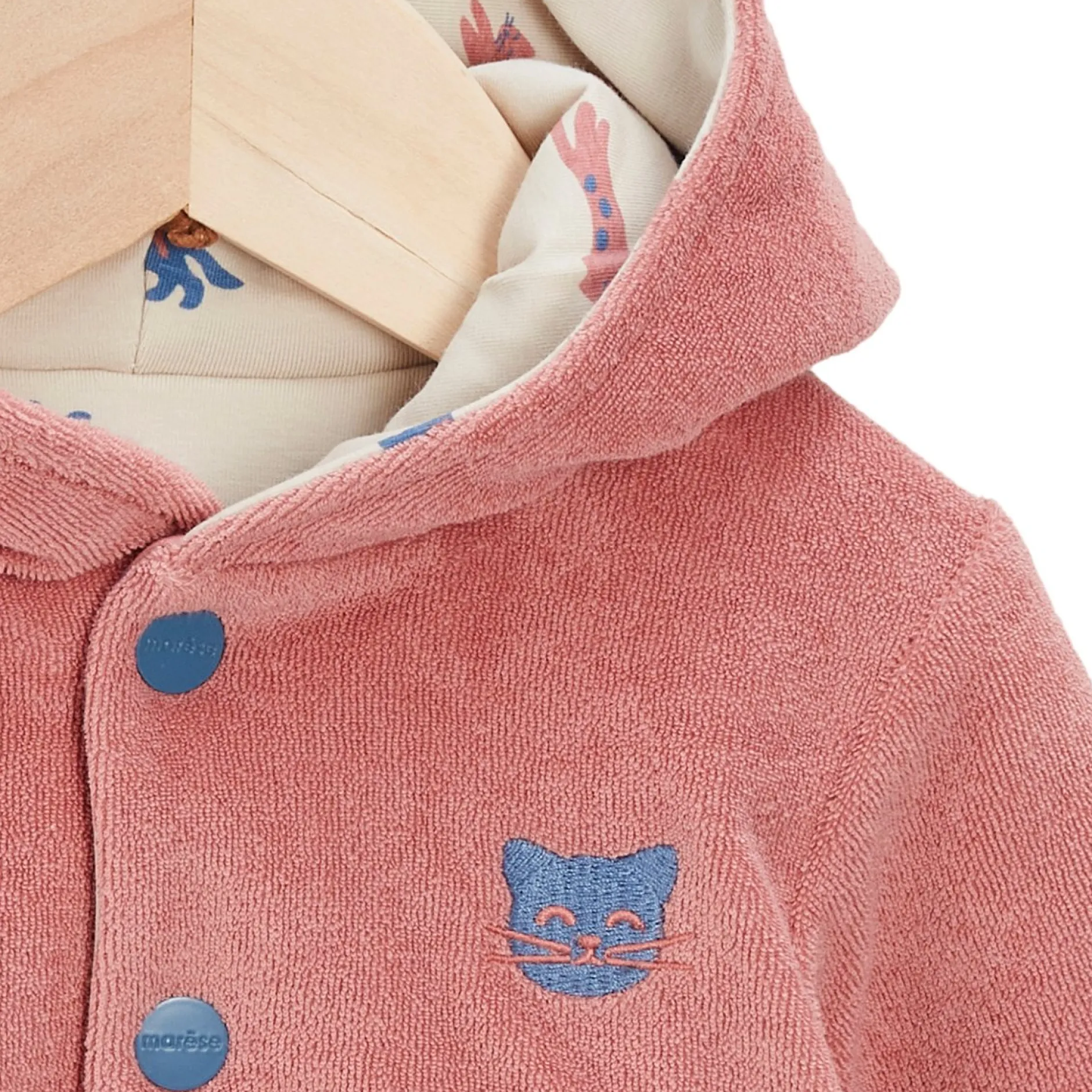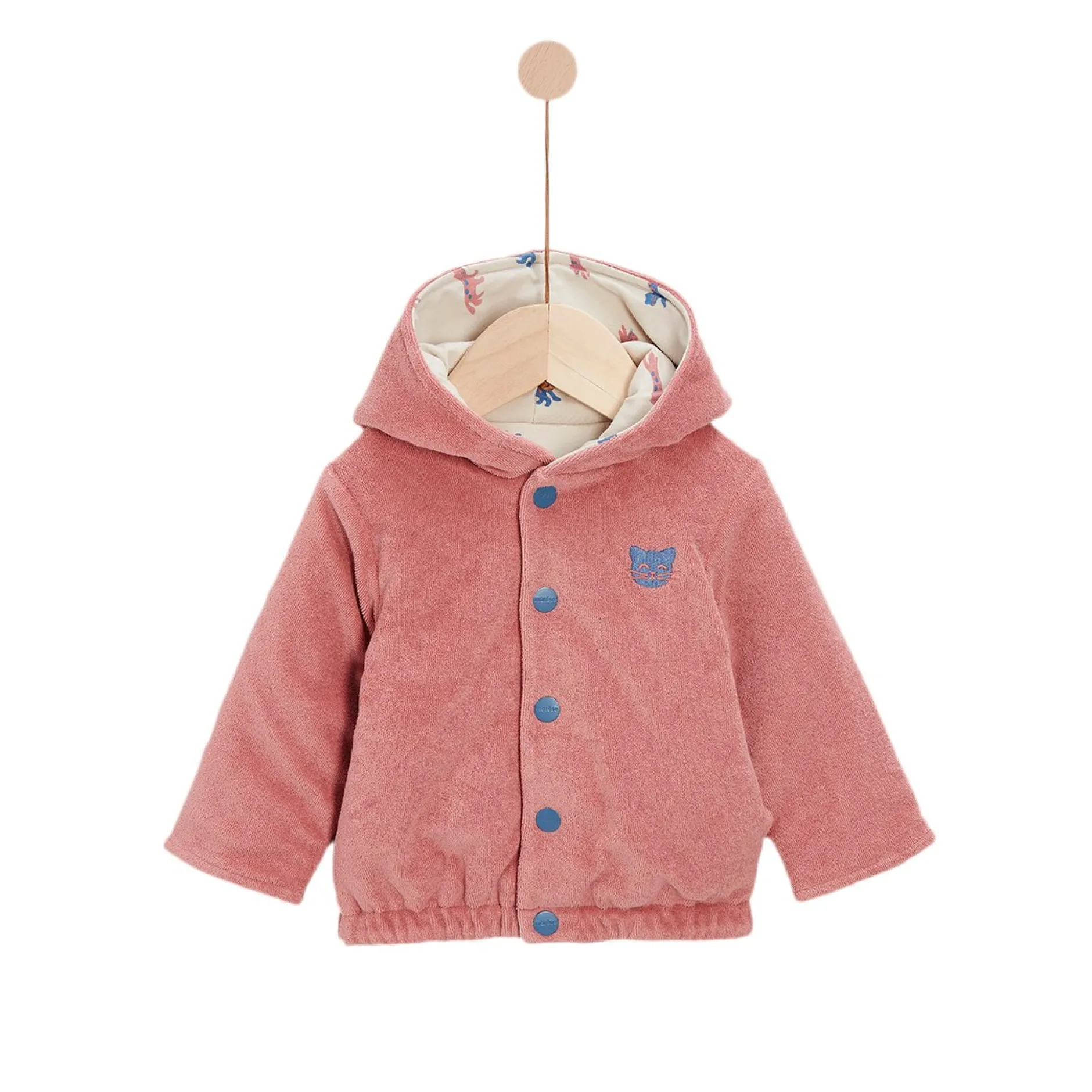 Veste à capuche Marèse réversible d’un côté en matière éponge en coloris terracotta et un autre côté en jersey imprimé « petits chats ». Ouverture devant par pressions à la fois pleines et cerclées. Légèrement ouatinée pour plus de confort et chaleur. Joli écusson « tête de chat » sur la poitrine sur le côté terracotta. 2 poches passepoilées de chaque côté. La pièce craquante qui vient compléter et varier les silhouettes et surtout qui a une vraie fonctionnalité de protection thermique pour les nuits fraîches d’été. 100% Coton. Lavage à 30°.