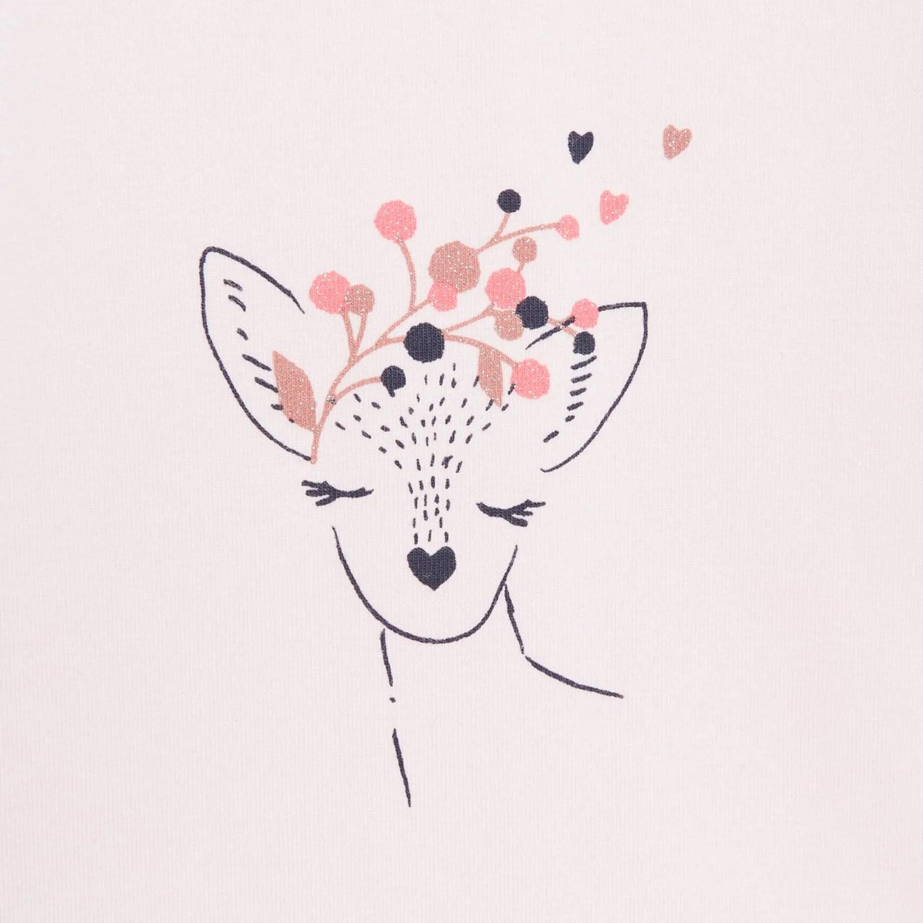 Le tee-shirt a une encolure ronde avec des pressions dans le dos. L’animation est craquante avec la biche qui a une couronne de branchage sur la tête. Le pantalon est entièrement élastiqué et s’adapte à toutes les morphologies. Il a une forme légèrement près du corps, tendance. Il a des fausses poches en forme de nœud sur le devant. La veste sans manches est doublée de voile et a un ruban de gros grain en rose fraise.